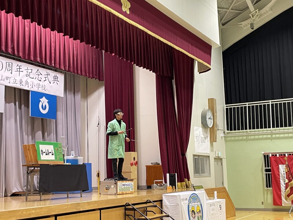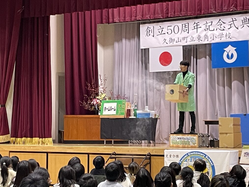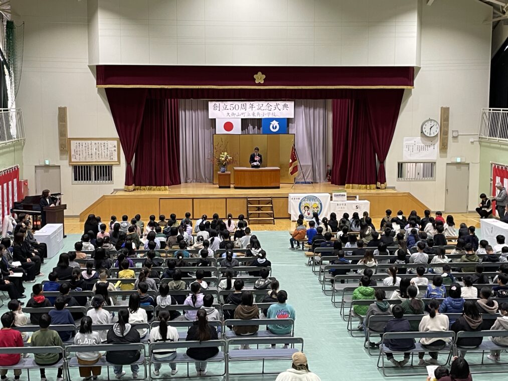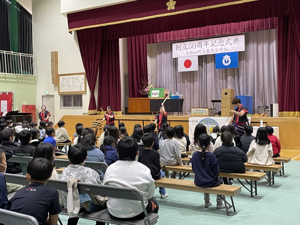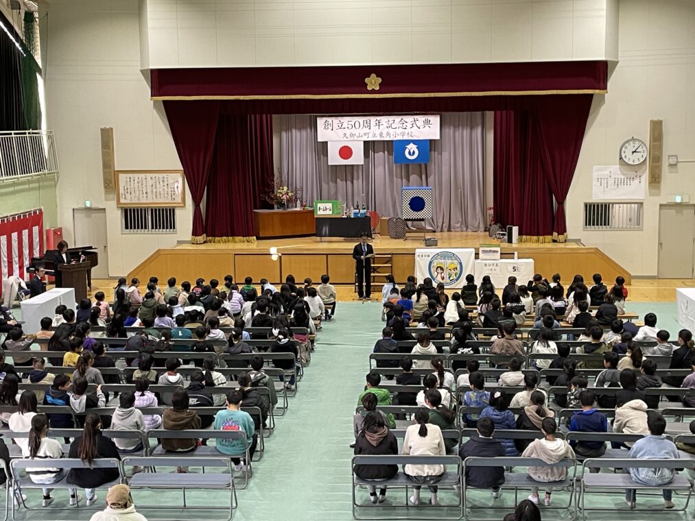 子どもたちは、式典に参加することで、自分たちが通う学校が様々な人たちによって50年間続けてこられたことを知り、自分もその歴史を作る一員として学校への愛着を育てることを目標に、本日の記念式典に参加しました。1部は式典で来賓挨拶のあと、児童会からの学校歴史クイズで大変盛り上がりました。2部は、迫力ある祝い太鼓の演奏やらんま先生による「サイエンスショー」があり、子どもたちも喜んで参加していました。この50年間、地域の皆様や保護者のご尽力に支えられて、学校教育活動を行うことができてきました。これからも地域の学校として教職員一同、頑張っていきたいと思いますので、今後ともよろしくお願いいたします。