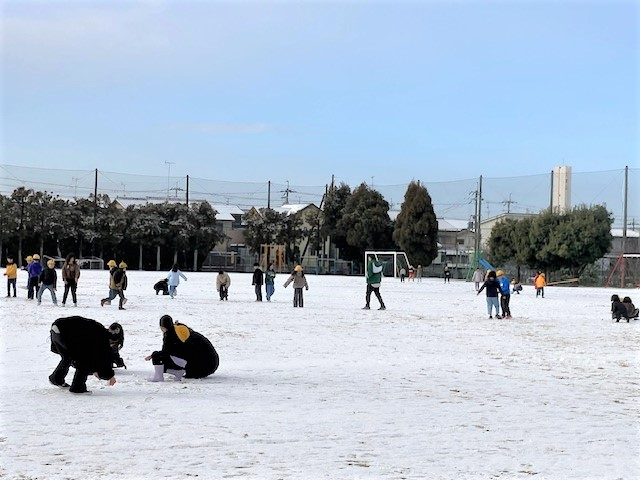 4年ぶりの大雪に見舞われて、校庭は白一色になっていました。登校してきた子ども達は、久しぶりの雪で大はしゃぎしていました。雪投げをする子、雪だるまを作る子、それぞれが楽しんでいました。朝のひとときでしたが、体験・体感することは大事だと思い、雪に親しむ時間をとりました。