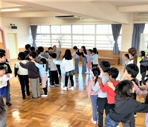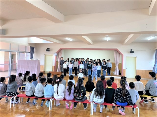 3年生の児童は、「6年生を送る会」で発表した劇をこども園の年長さん(4月から新1年生)に披露をしました。園児さん達は、真剣に劇をみていました。その後、みんなで「ジャンケン列車」をして楽しみ、交流を深めました。