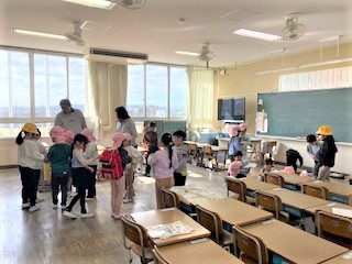 昨日に続き、今日は1年生と園児さんとの交流がありました。最初に読み聞かせをして、その後は、お店屋さんごっこ、そして、教科書を見せてもらったり、ランリュックを背負ってみたりと1年生体験をしました。
