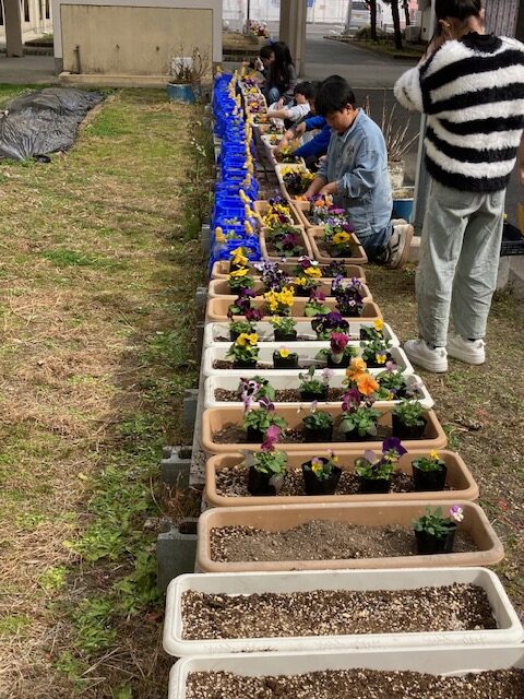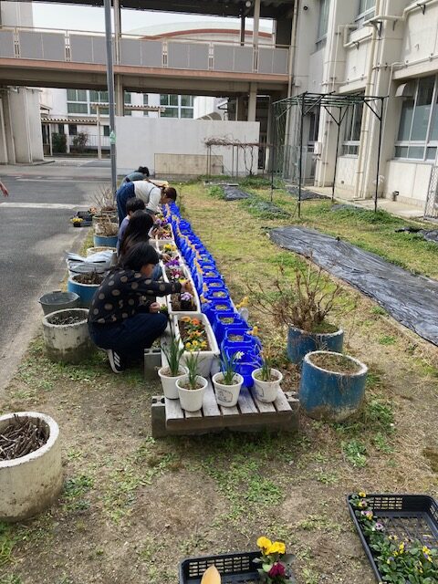 久御山町豊かな心づくり推進協議会の「花いっぱい運動」の取組で、環境美化運動の一環として花の苗をいただきました。その苗を環境美化委員会の児童がプランターに植え替える作業をしました。これから行われる「卒業式」「入学式」に向けて綺麗に咲いているように水やりの世話をしていく予定です。