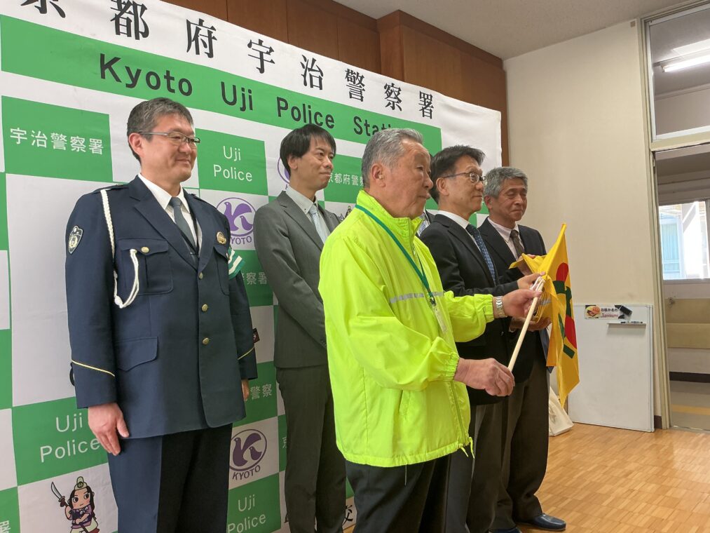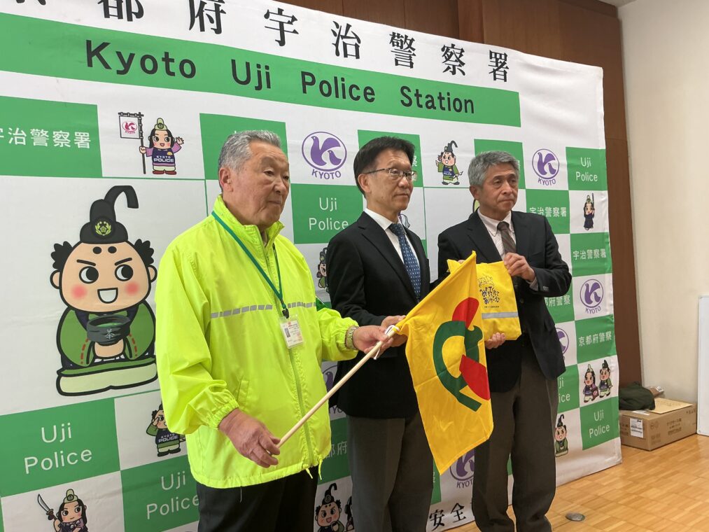 久御山町交通安全対策協議会より児童の交通事故防止のために、集団登校時に使用する登校旗を、また京都府交通安全協会より手提げバッグをいただきました。これからも安全に気をつけて、登下校をしてほしいと願っています。