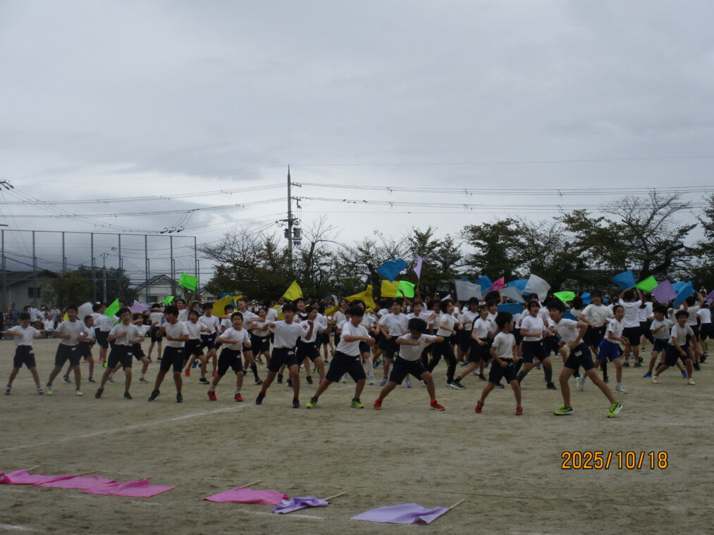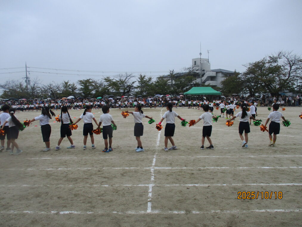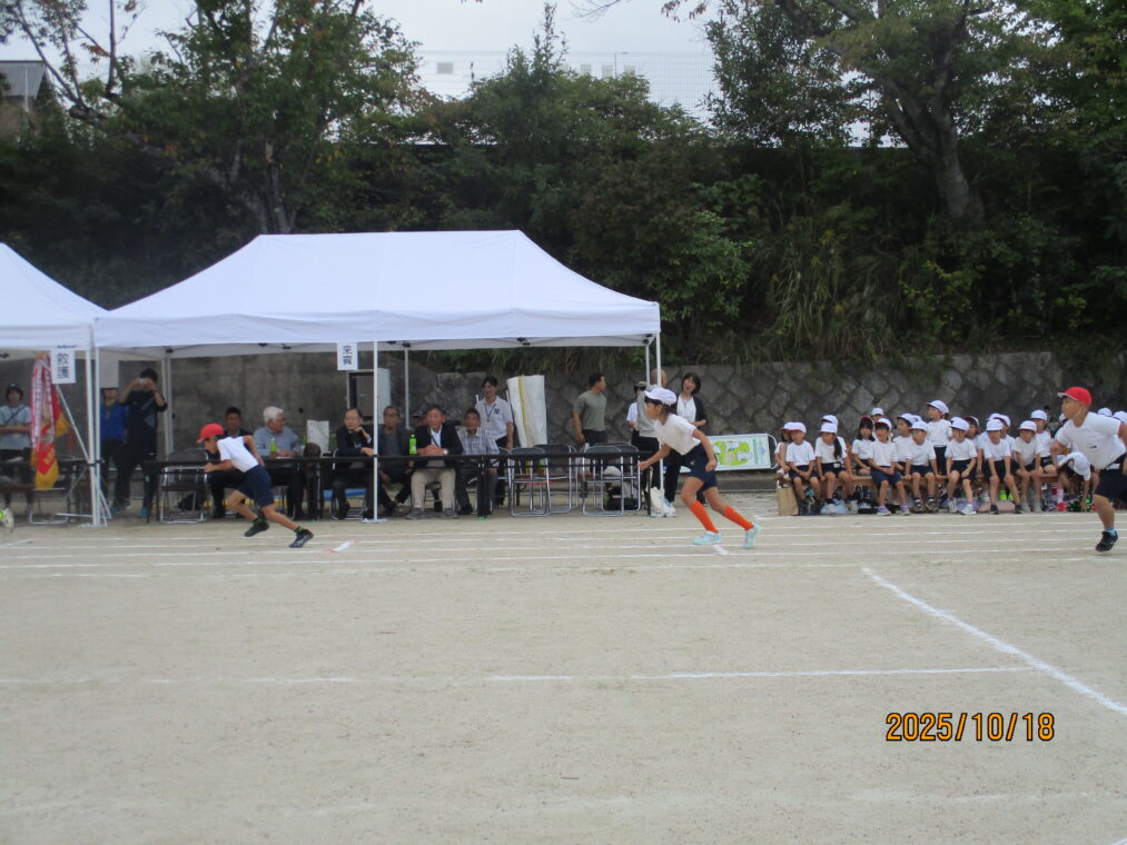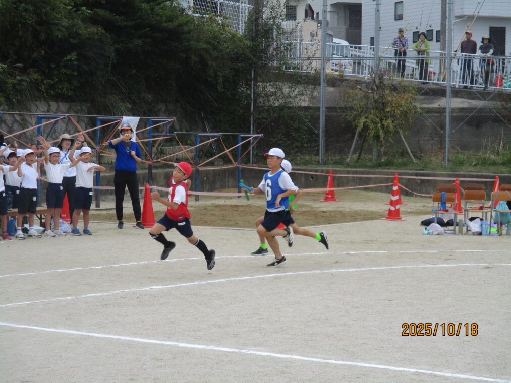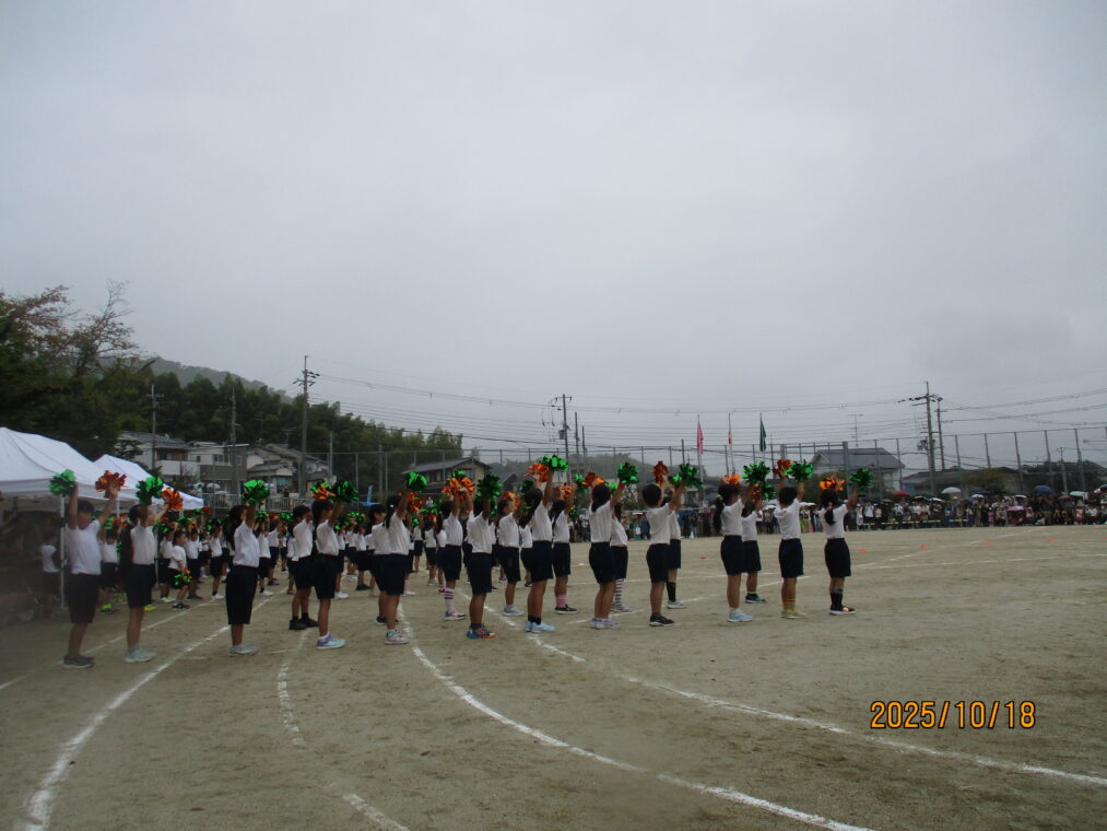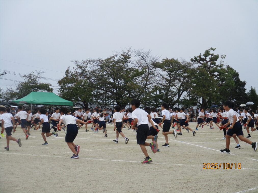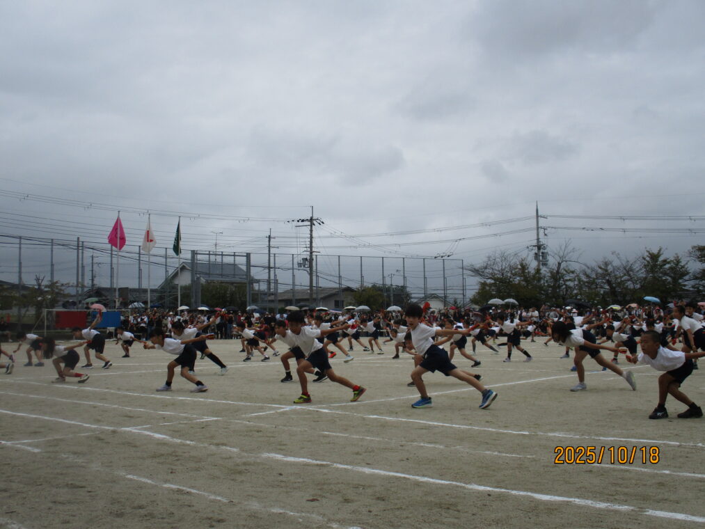 10月18日、運動会を実施しました!毎日、天気予報とにらめっこしながら天気を心配していましたが、なんとか予定通りのプログラムで実施できる運びとなりました。約1か月間、演技や競技、徒競走だけでなく応援練習や4~6年生は係の仕事や準備に…とたくさんのことに取り組んできた集大成の一日となりました。徒競走では、50・80・100mを各学年、全力で走り抜けました。どの学年の子どもたちも、自分のレースを一生懸命最後まで走り抜きました。競技では、各色で作戦を立て練習をした成果が発揮されました。色ごとに声を枯らして応援し、勝っても負けても一生懸命に取り組む姿がとても素敵でした。演技では、それぞれのブロックで上の学年が中心となって教え合い、手本となりながら練習を重ねてきた成果が表れた演技となりました。どの学年も、これまでの頑張りが伝わる演技となりました。そして、6年生にとっては最後の運動会。開閉会式で前に立つリーダーとしての姿や係の仕事での頑張り等、様々な場面で手本となる姿を見せてくれました!