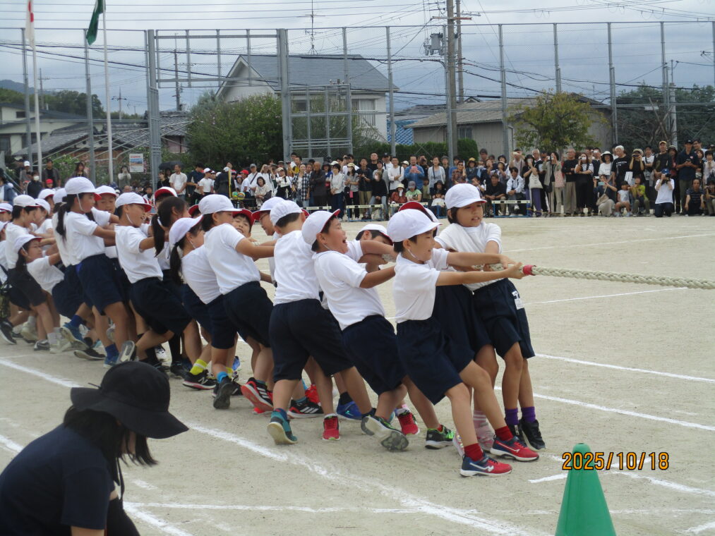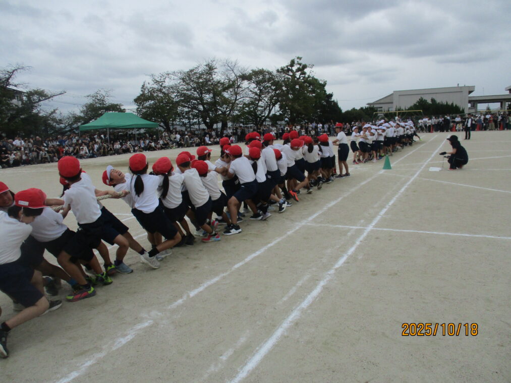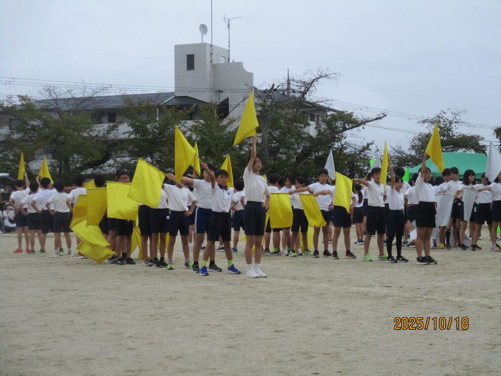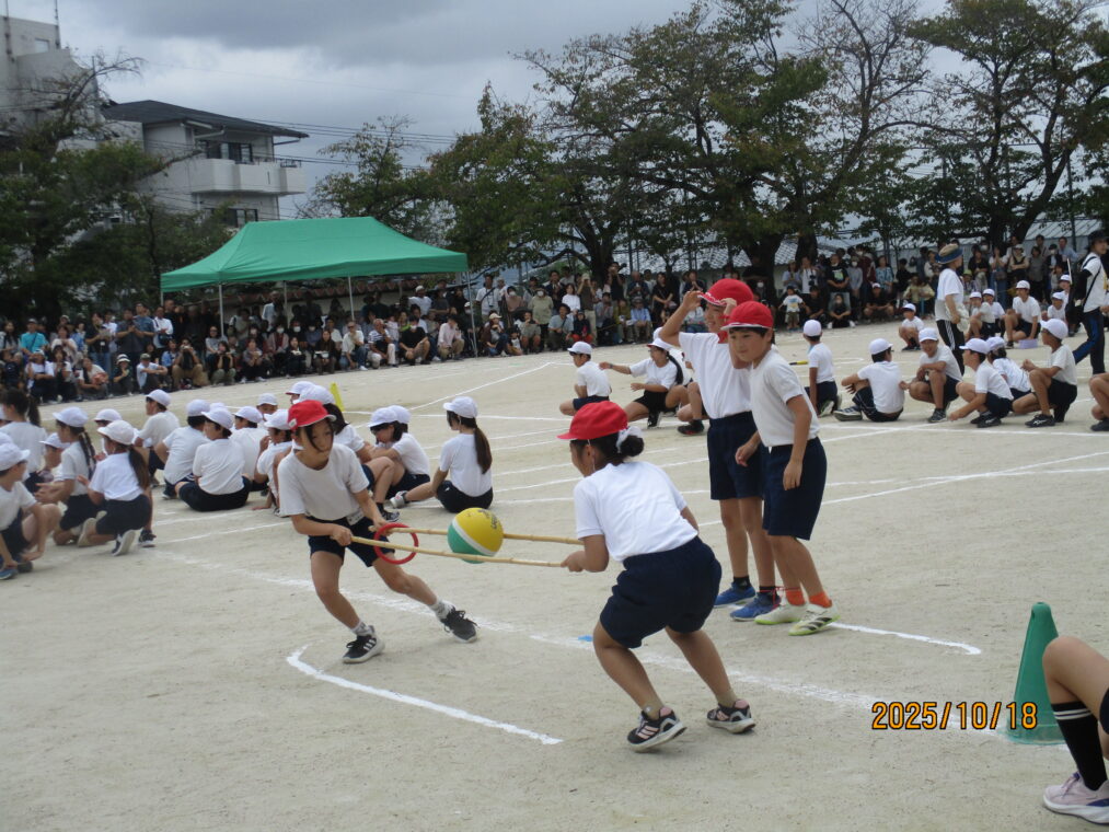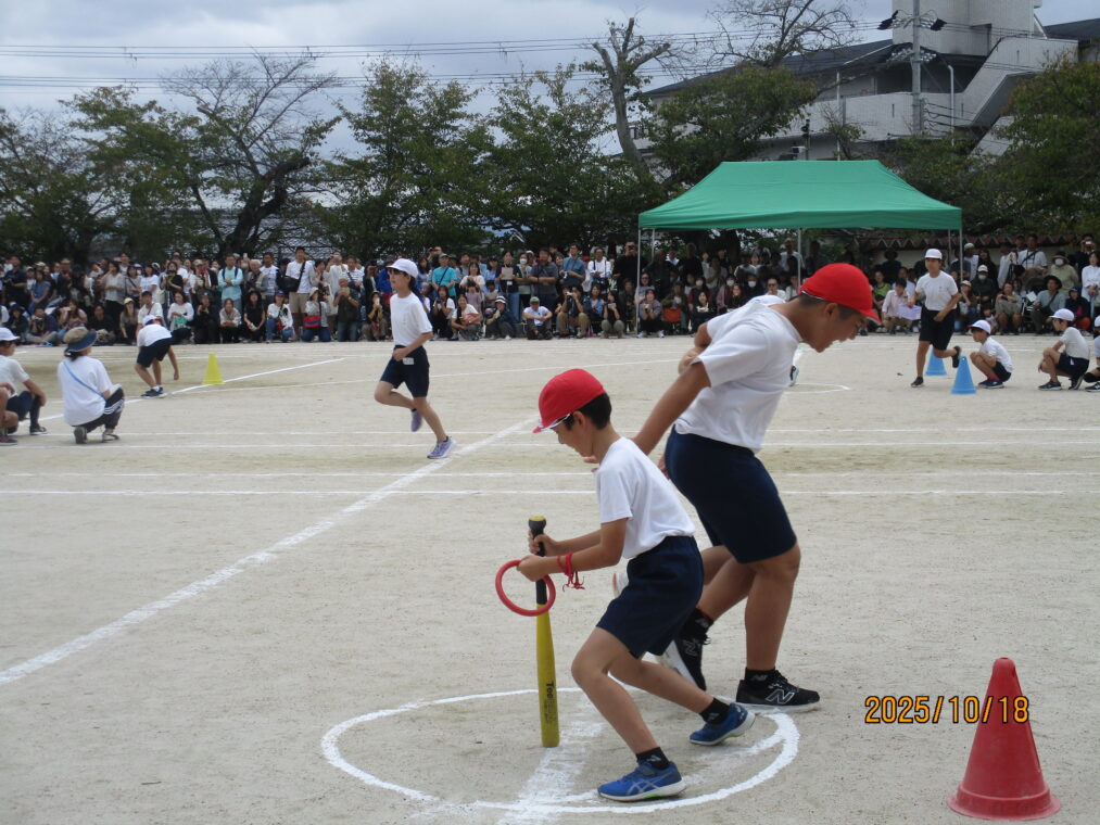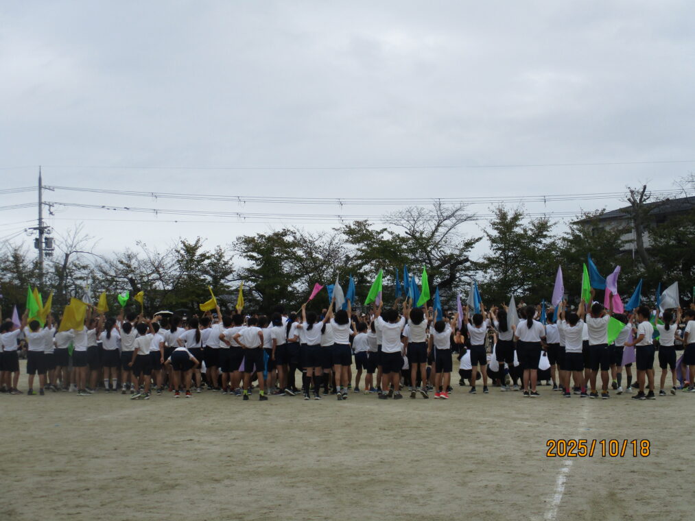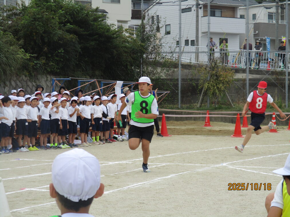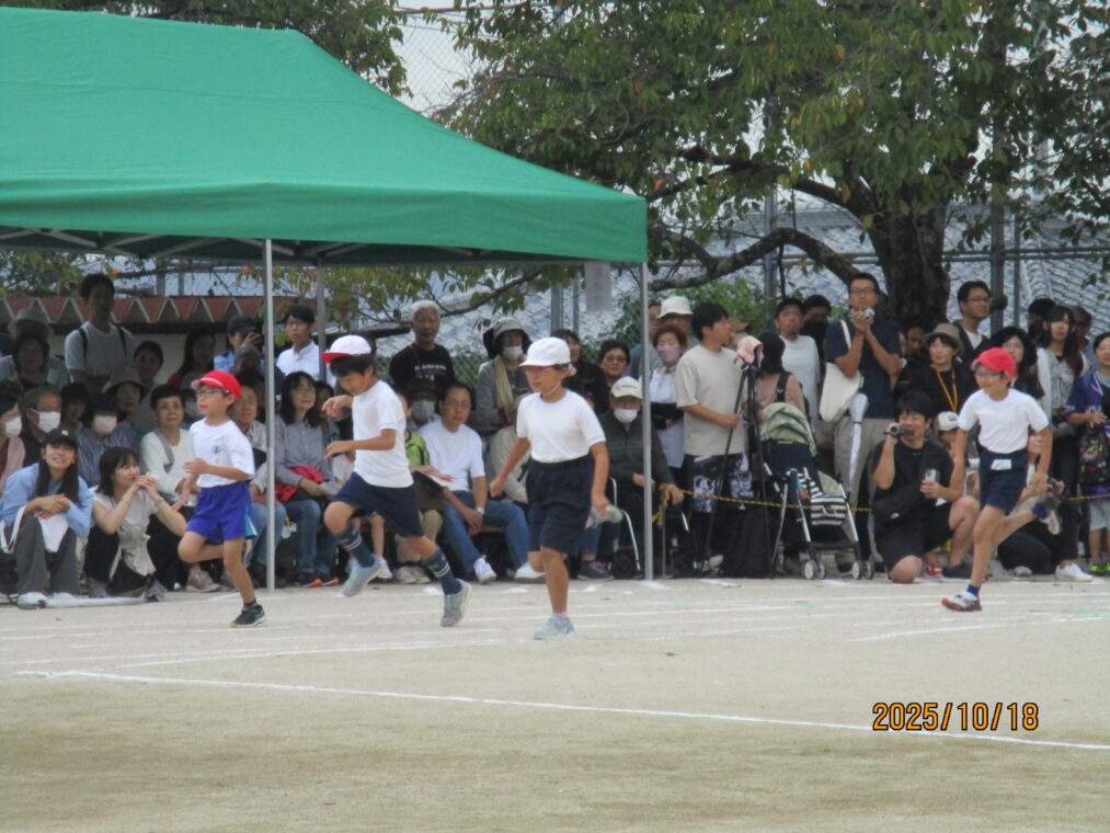 10月18日、運動会を実施しました!毎日、天気予報とにらめっこしながら天気を心配していましたが、なんとか予定通りのプログラムで実施できる運びとなりました。約1か月間、演技や競技、徒競走だけでなく応援練習や4~6年生は係の仕事や準備に…とたくさんのことに取り組んできた集大成の一日となりました。徒競走では、50・80・100mを各学年、全力で走り抜けました。どの学年の子どもたちも、自分のレースを一生懸命最後まで走り抜きました。競技では、各色で作戦を立て練習をした成果が発揮されました。色ごとに声を枯らして応援し、勝っても負けても一生懸命に取り組む姿がとても素敵でした。演技では、それぞれのブロックで上の学年が中心となって教え合い、手本となりながら練習を重ねてきた成果が表れた演技となりました。どの学年も、これまでの頑張りが伝わる演技となりました。そして、6年生にとっては最後の運動会。開閉会式で前に立つリーダーとしての姿や係の仕事での頑張り等、様々な場面で手本となる姿を見せてくれました!