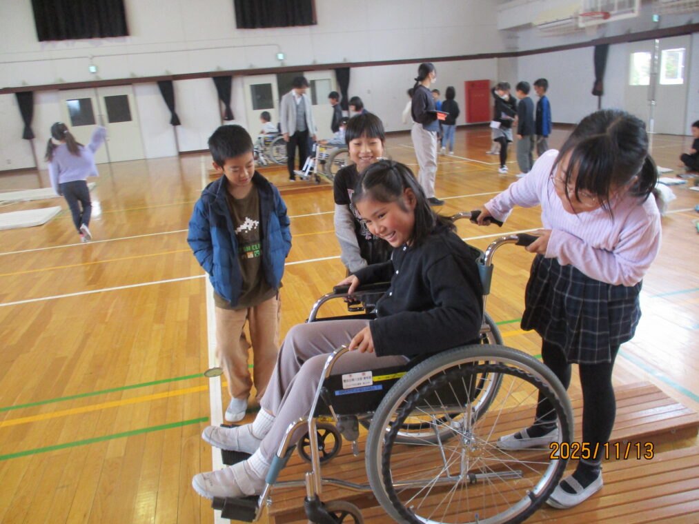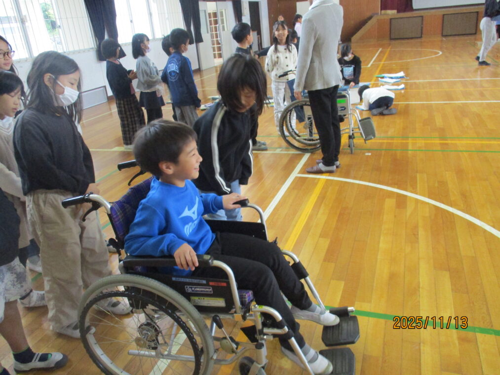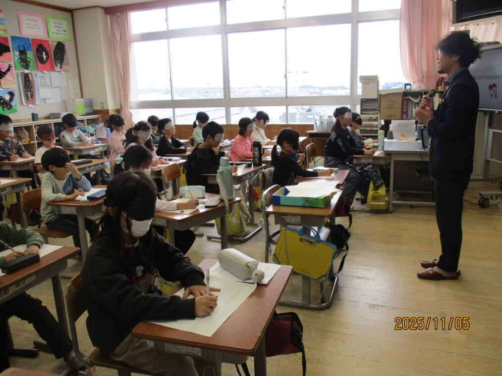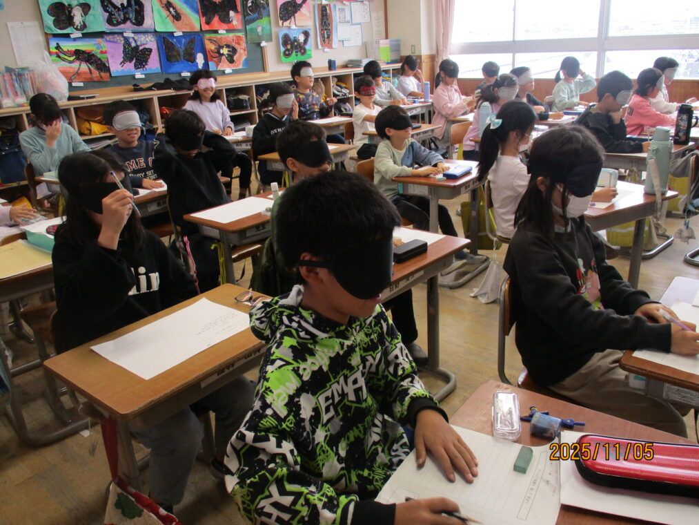 3年生は総合的な学習の時間に「福祉」をテーマとした学習をしています。まちには様々な人が暮らしているということ、みんなが幸せに暮らせるといいよね、という話から始まり、社会福祉協議会の方には福祉とは「ふ」だんの「く」らしを「し」あわせにすることだ、と教えていただきました。早速、様々な人の立場に立って考えてみよう!ということでアイマスク体験、車いす体験を行いました。体験して初めて感じることはたくさんあります。感じたことをこれからの学びにどんどんつなげていってほしいと思います。