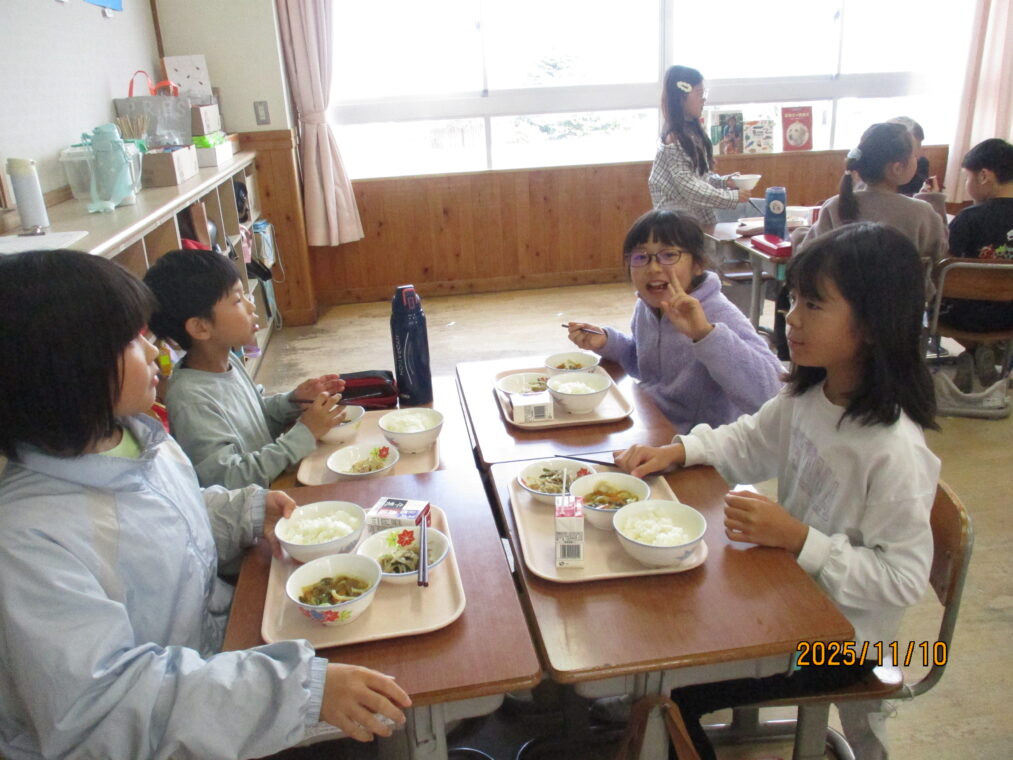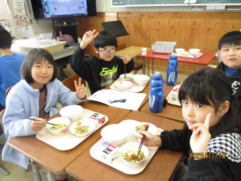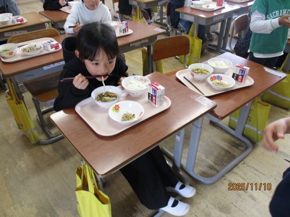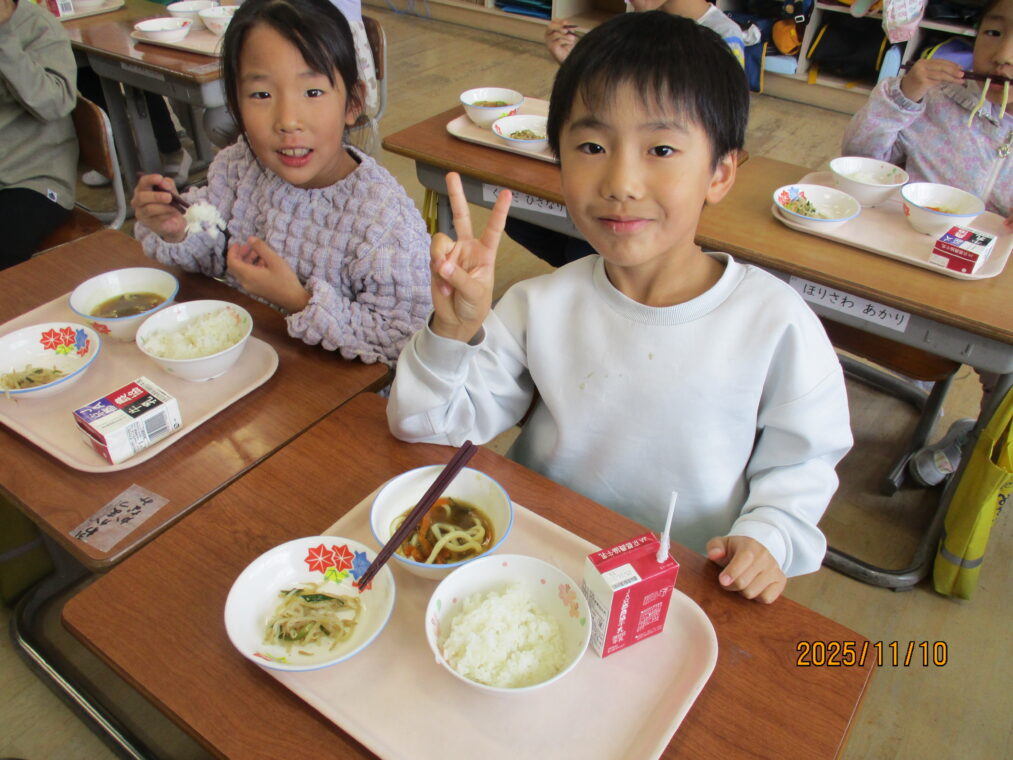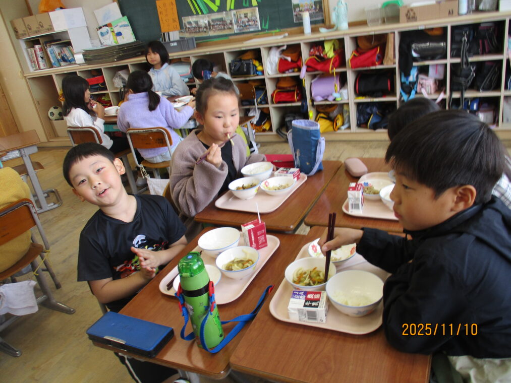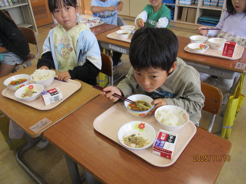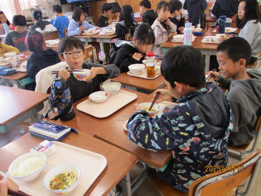 先日、給食に「カレーうどん」が出ました。普段はパスタ以外の麺類はほとんど出ることはありません。実は新メニューだったのですが、子どもたちとその話をしていると「献立表に☆マークがついてへんから新メニューじゃないはずやで~!」との返事が返ってきて、献立表を隅々までチェックしていることに驚きました!「えー、どんな味かな!」「楽しみ!」とわくわくしながら給食時間を迎えました。慣れない麺の配膳に苦戦している当番の子どももいましたが、みんなでおいしくいただきました。1年生に味の感想を聞いてみたところ、「おいしい!」「想像とちがった!」「ちょっとからい!」「全然からくないやん~」等でした。毎日の給食にわくわくや驚き、楽しみがあるって素敵なことですね。
