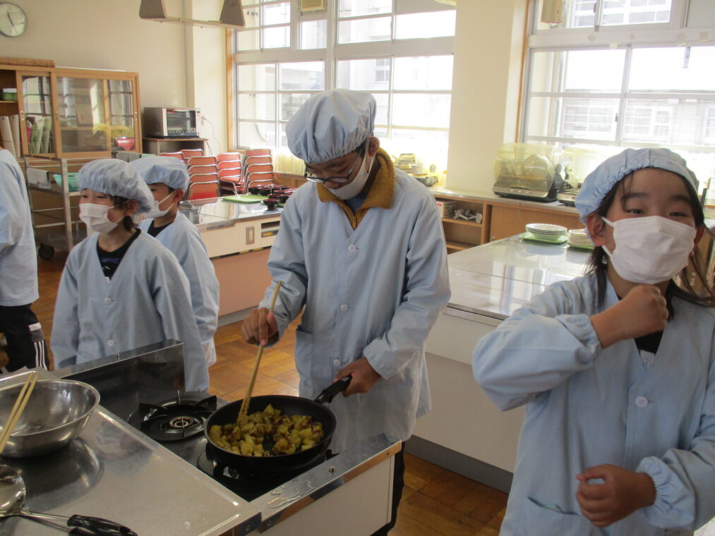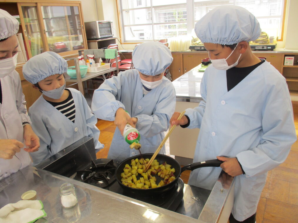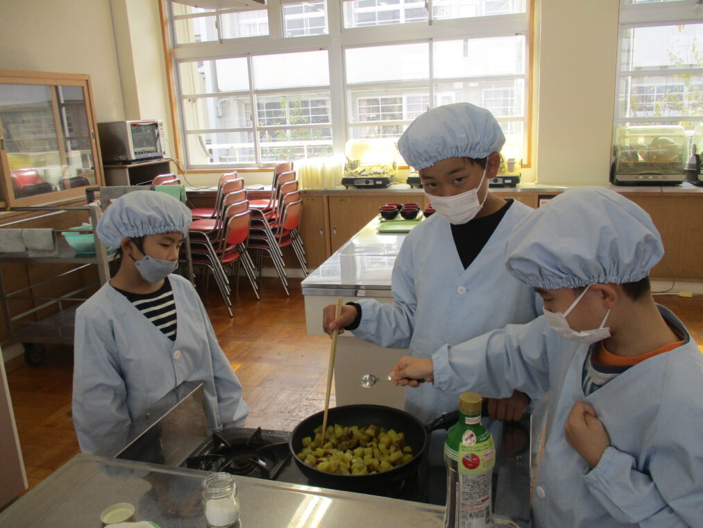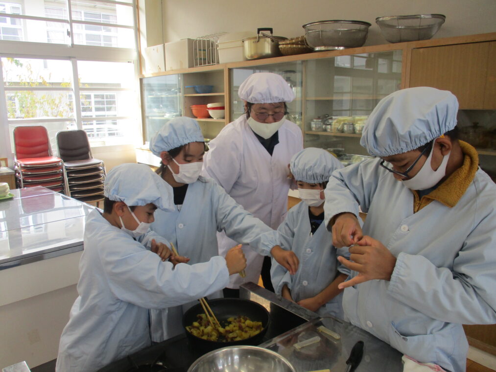 たんぽぽ学級では、生活単元学習の時間に畑でさつまいもを育ててきました。いよいよ、収穫したさつまいもを使っての調理実習です。何を作るかみんなで話し合い、決まったメニューは、「みそ汁」と「大学いも(はちみつ味・しょうゆ味)」でした!6年生が中心となってみんなで協力して洗ったり切ったりいためたり…チームワークばっちりでした!低学年の子たちも調理ができるよう、教えてあげたり順番に交代してあげたり…とさすがの6年生でした。出来上がったおいも料理を前に、「上手にできた!」「味見したよ!ばっちり!」「これがおすすめ!おいしいよ!」と自信満々の顔を見せてくれました。