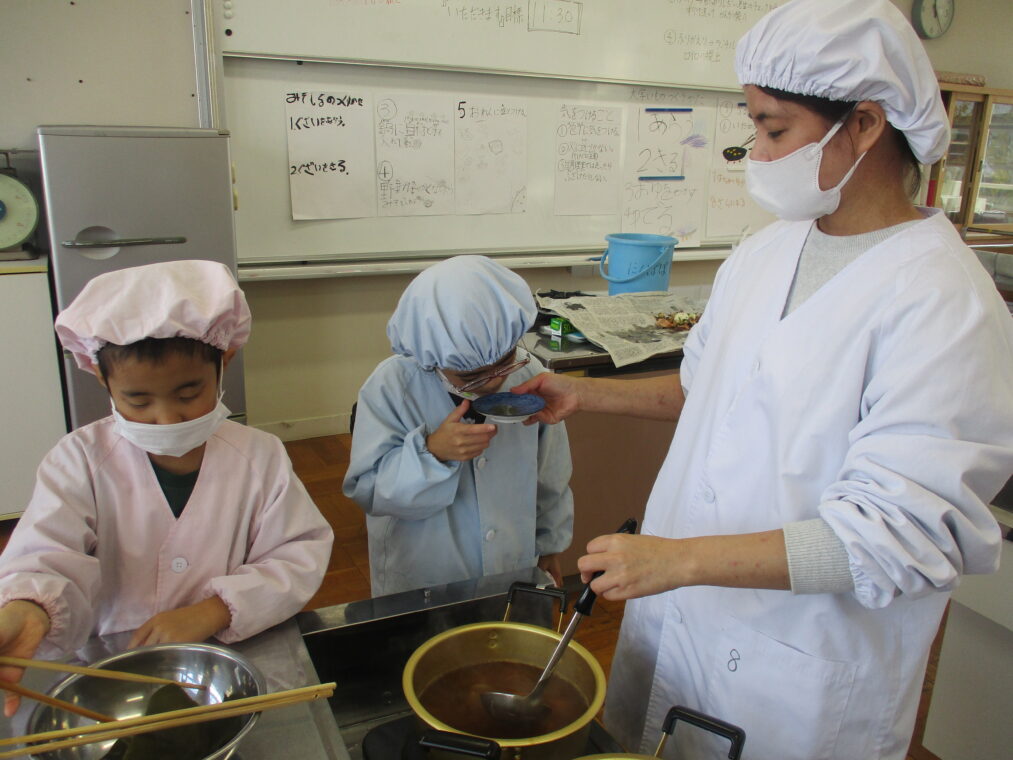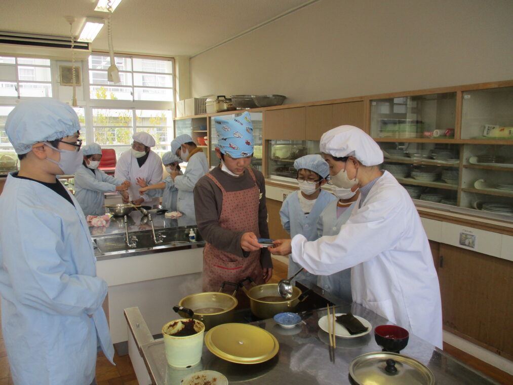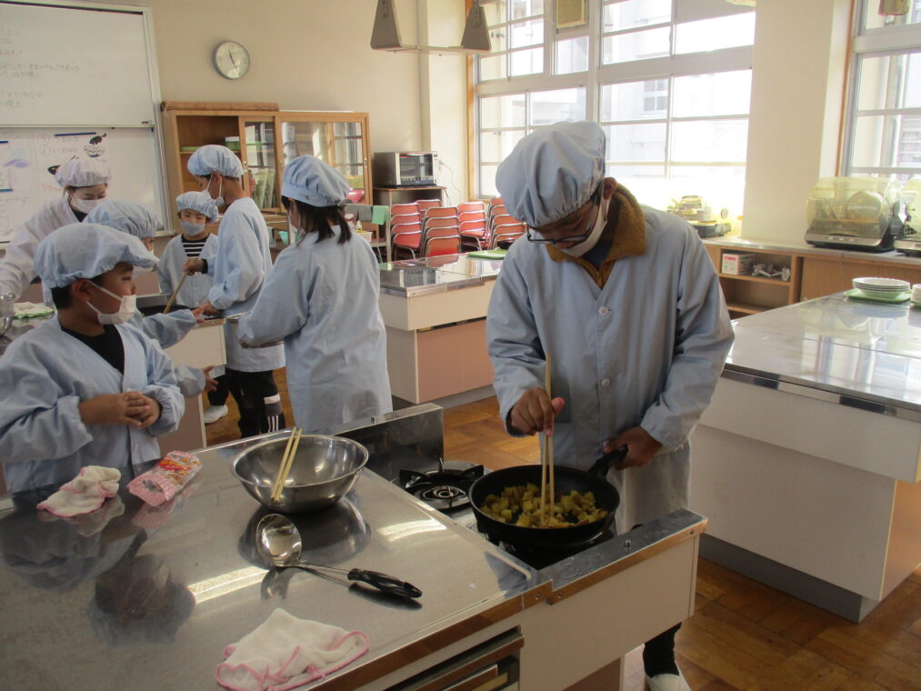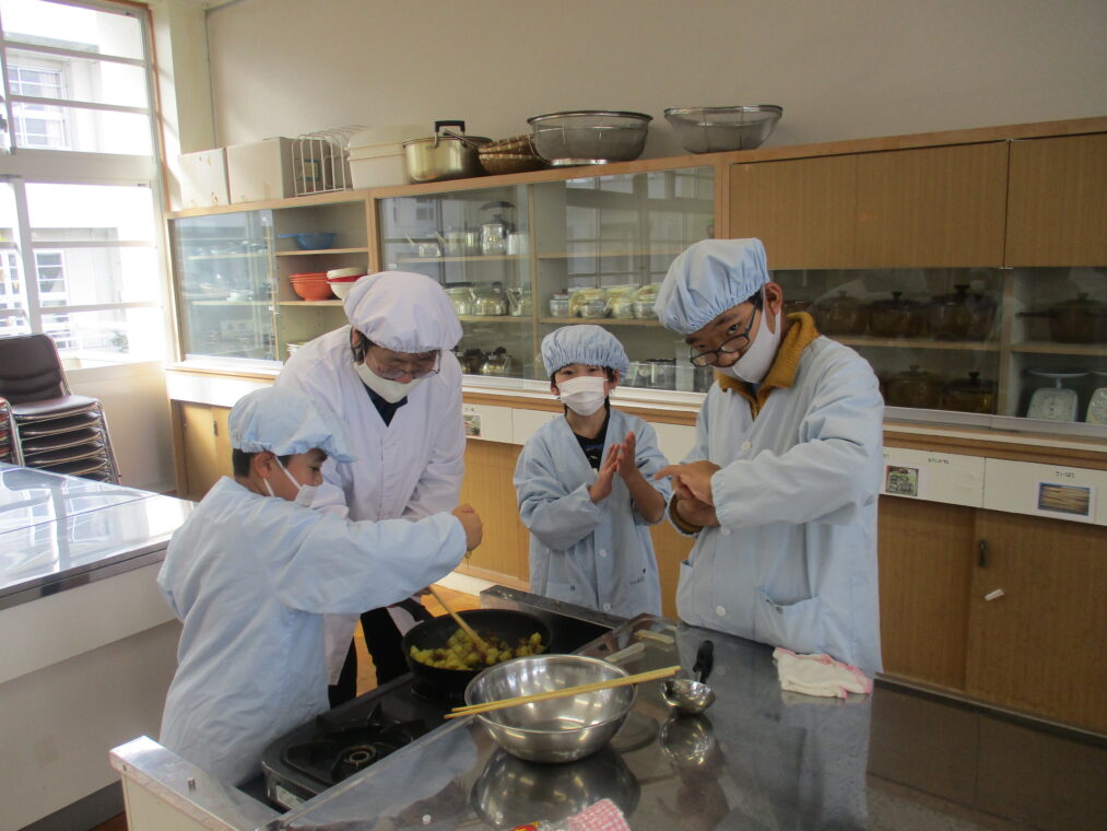 たんぽぽ学級では、生活単元学習の時間に畑でさつまいもを育ててきました。いよいよ、収穫したさつまいもを使っての調理実習です。何を作るかみんなで話し合い、決まったメニューは、「みそ汁」と「大学いも(はちみつ味・しょうゆ味)」でした!6年生が中心となってみんなで協力して洗ったり切ったりいためたり…チームワークばっちりでした!低学年の子たちも調理ができるよう、教えてあげたり順番に交代してあげたり…とさすがの6年生でした。出来上がったおいも料理を前に、「上手にできた!」「味見したよ!ばっちり!」「これがおすすめ!おいしいよ!」と自信満々の顔を見せてくれました。