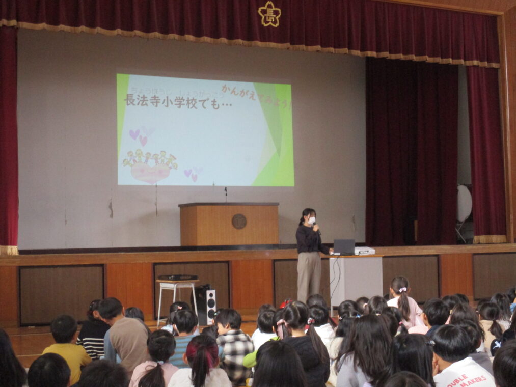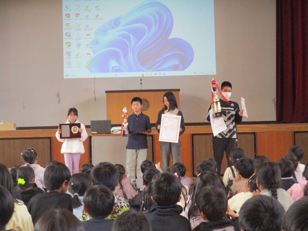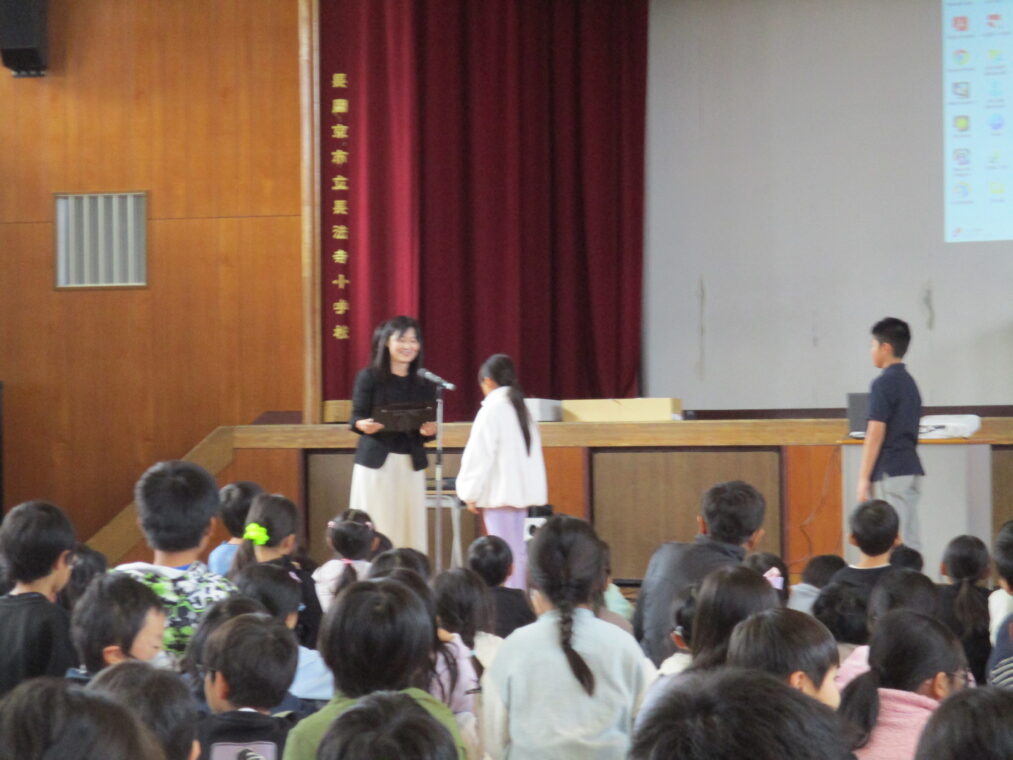 今週は人権週間です。先生たちから人権週間についてのお知らせと、人権とは「自分も友達も大切にすること」「みんなが笑顔で過ごせること」であるというお話がありました。また、6年生の代表者が「わたしの主張発表大会」に選出された意見文を全校の前で発表しました。「相手を知ることから始まる」という題で、シベリア抑留問題を知って自分が考えたことについて書いた意見文でした。今週の人権週間では、学年の発達段階に応じて自分や友達の素敵なところに目を向けたり、身の回りの人権問題について考えたりしていきます。