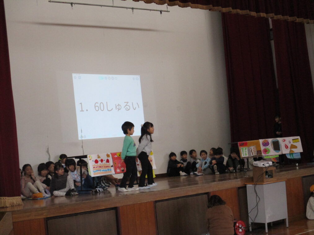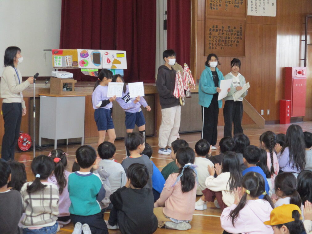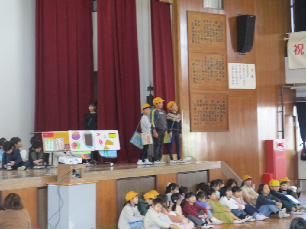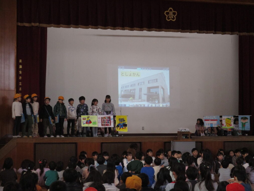 12月12日、2学期最後の全校集会がありました。前回、延期になっていた2年生の発表です。2年生が生活科の「まちたんけん」で学習した地域のお店や施設のことについて、劇やクイズを交えての発表でした。地域に出かけ、インタビューをする中でたくさんのことを学んできたことが伝わる発表でした。全校のみんなも、地域の知っているお店や施設についての発表を興味深く聞いていました!