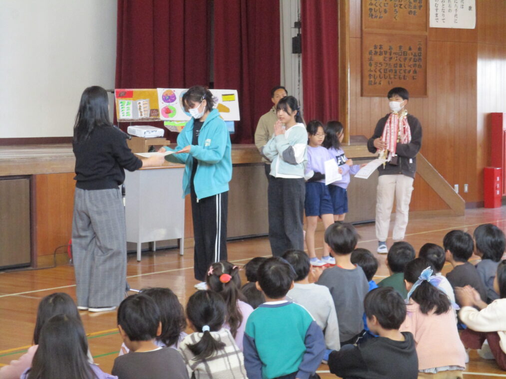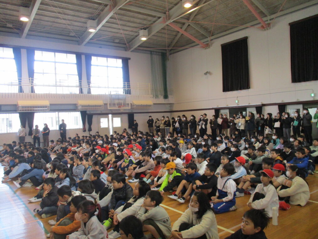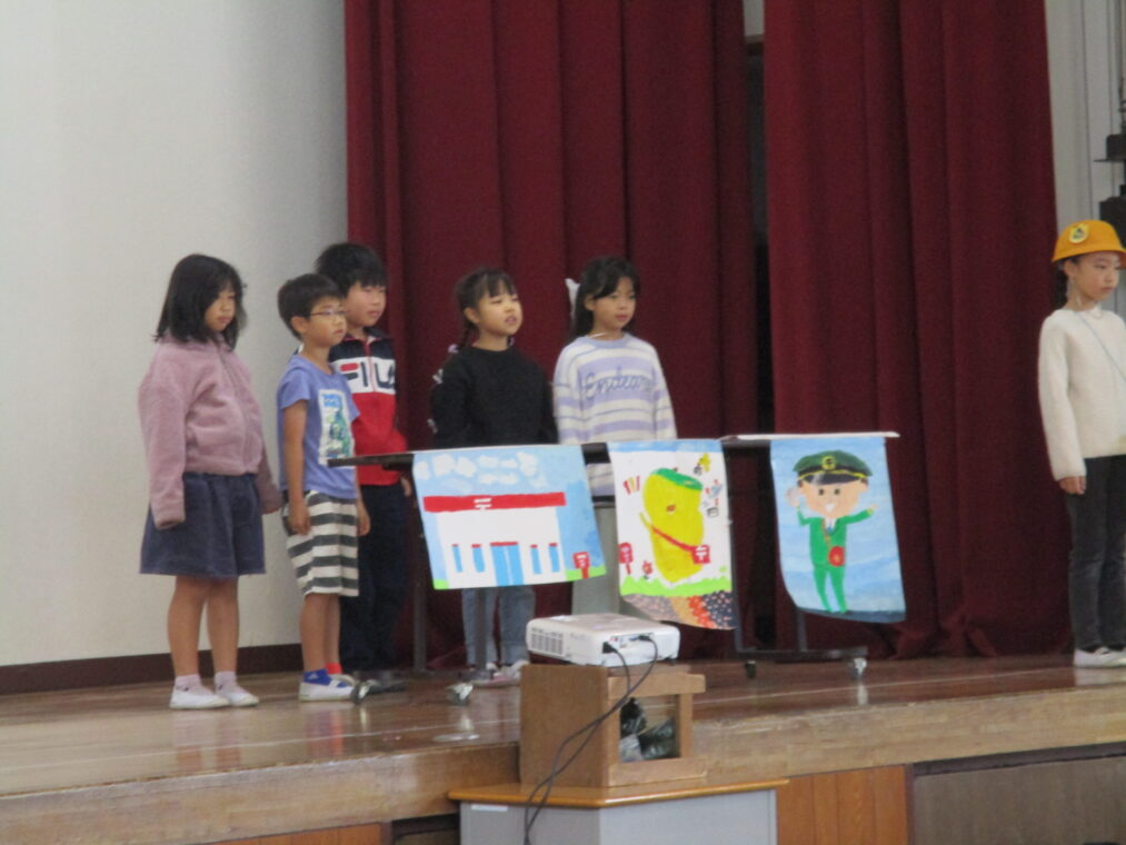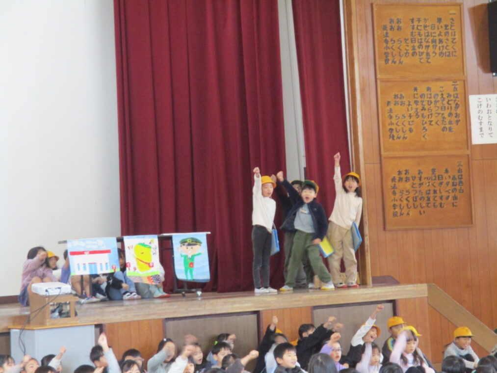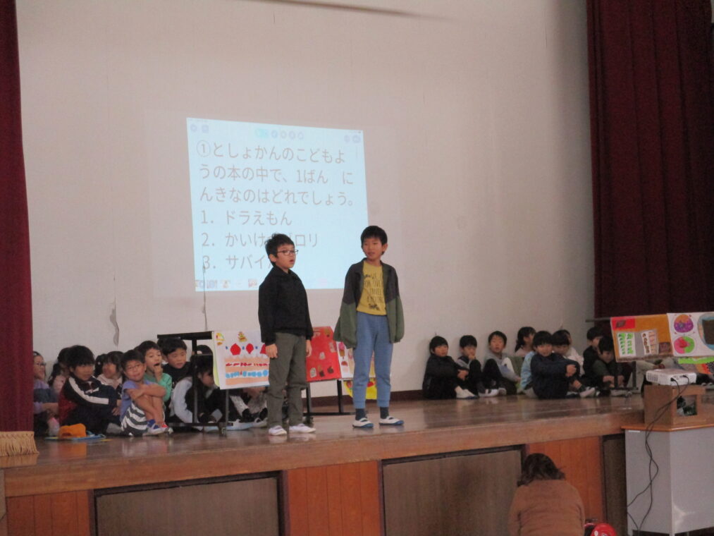 12月12日、2学期最後の全校集会がありました。前回、延期になっていた2年生の発表です。2年生が生活科の「まちたんけん」で学習した地域のお店や施設のことについて、劇やクイズを交えての発表でした。地域に出かけ、インタビューをする中でたくさんのことを学んできたことが伝わる発表でした。全校のみんなも、地域の知っているお店や施設についての発表を興味深く聞いていました!