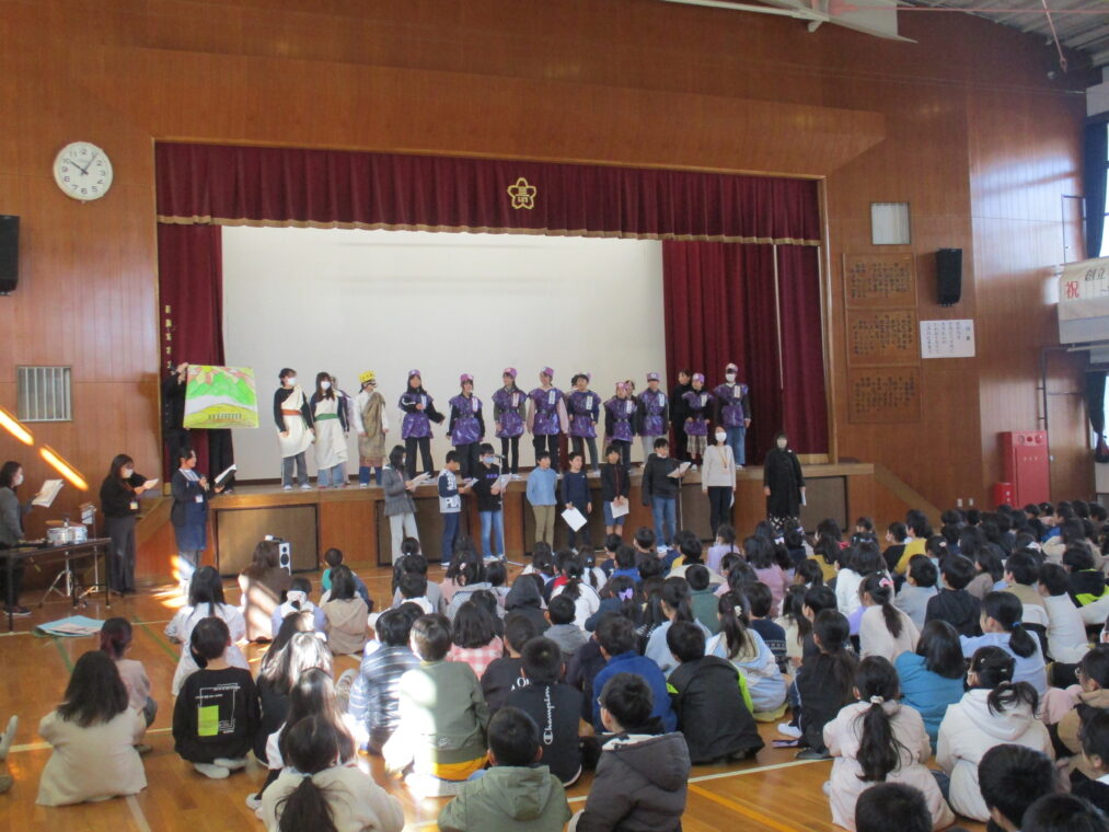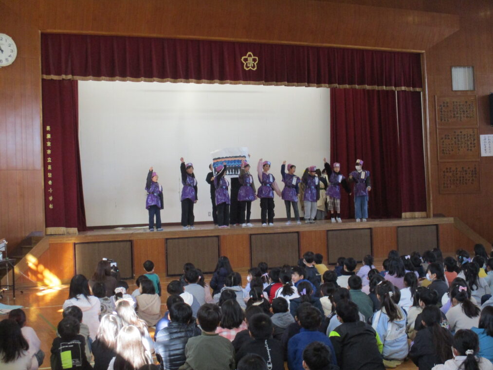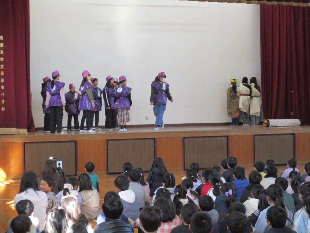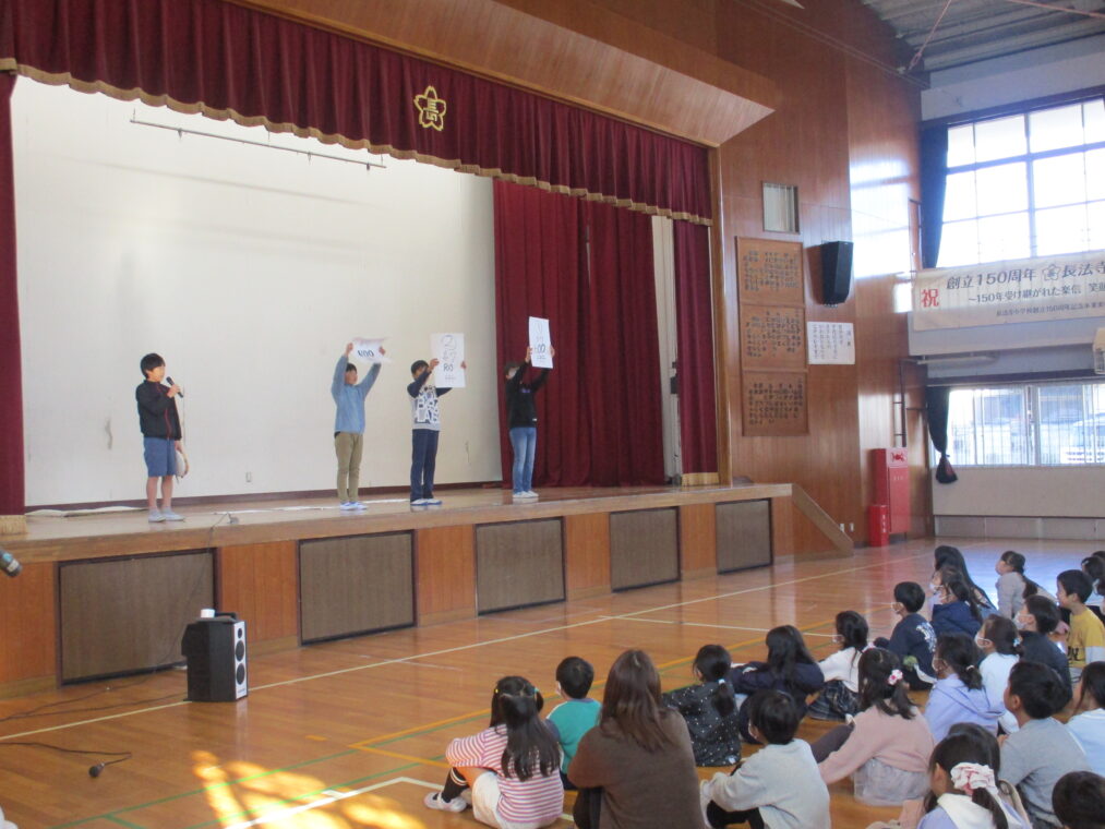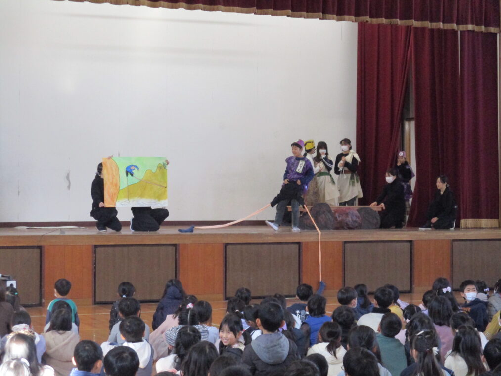 昨日、後期図書委員会による読書集会がありました。最初にらいぶらり~さんによる全身を使ったじゃんけん、図書委員クイズがありました。クイズは、低学年でも考えやすいように選択肢があり、一問終わるごとに「当たった~!」と喜びの声が上がっていました。そして今年の劇は、「王様と9人のきょうだい」でした。個性豊かな9人のきょうだい、王様、家来…それぞれの役に決まった図書委員の5・6年生がこれまで練習を重ねてきた成果を発揮し、とても楽しい劇を披露しました。見ている人は次どうなるのかお話にどんどん引き込まれて、歌のメロディを覚えて口ずさむ人もいました。