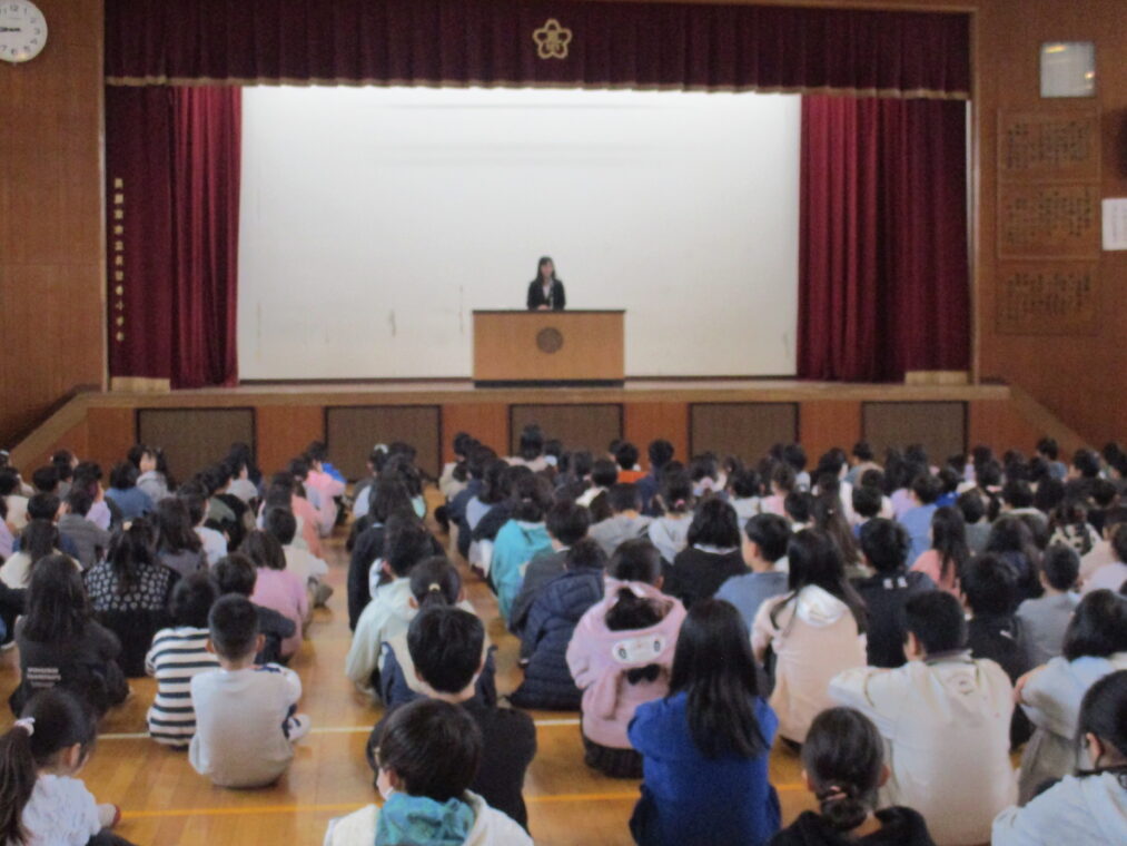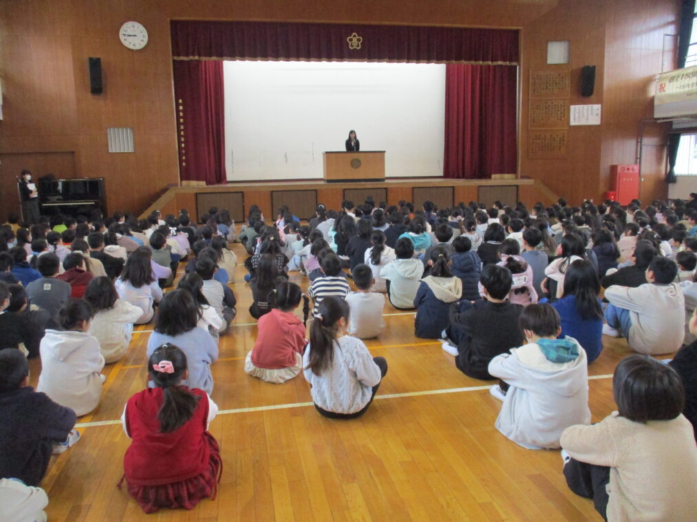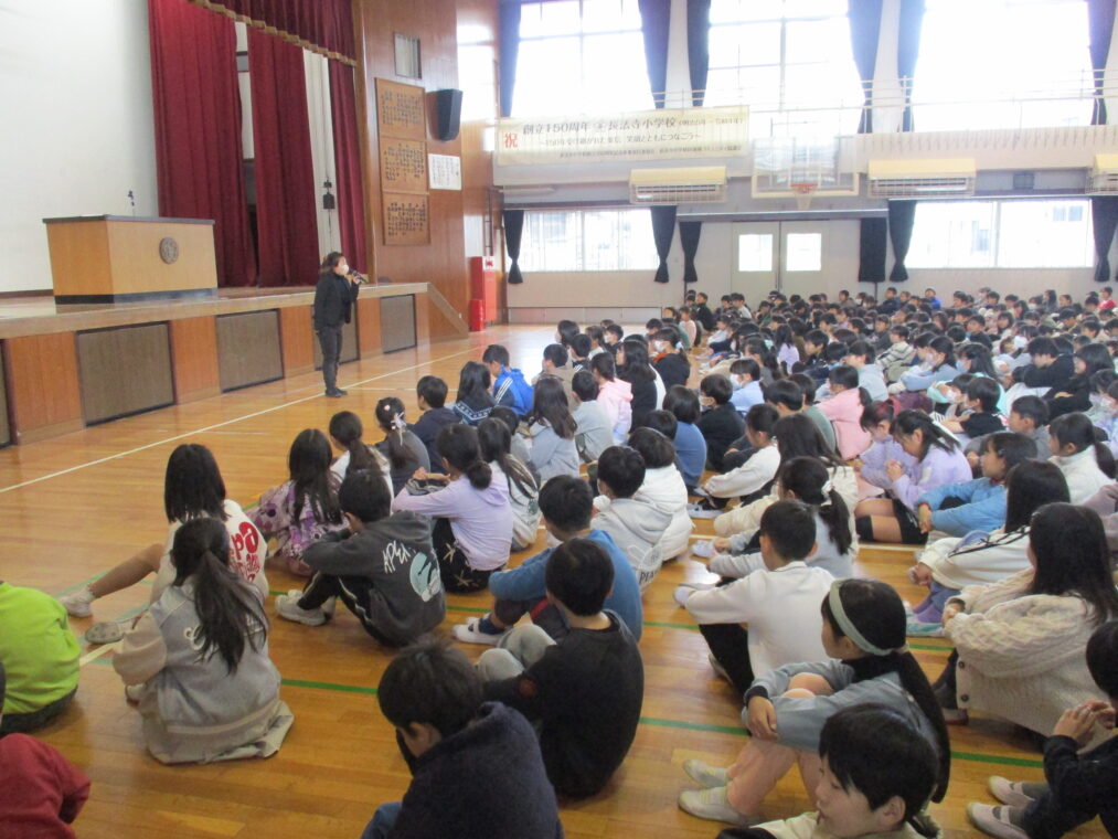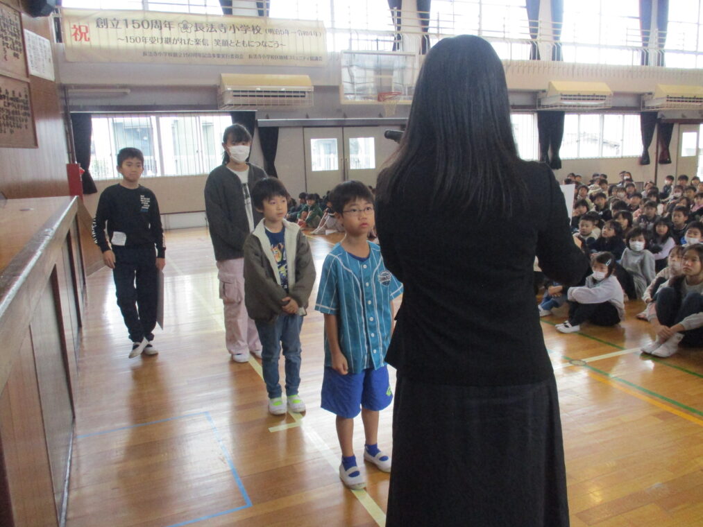 本日で2学期が終了しました。インフルエンザがまた流行し、欠席も増えてきている中の終業式でした。どの学年も時間より前に集合し静かに式が始まり、校長先生からは、長法寺まつりや2学期の頑張りについてのお話や、世界で最も歌われている歌にちなんで「一人ひとりを大切に」というお話がありました。先生方からは、冬休みに入るにあたり「お金の使い方・遊び方・交通安全について」の注意事項や「持ち帰りタブレットの扱いについて」などのお話がありました。(特に、交通安全とタブレットの扱いについては全学級でも指導をしています。このホームページ「重要なお知らせ」の中に「持ち帰りタブレット活用のルール」「iPad使用ガイドライン」も掲載しています。ご家庭でのルール確認の際、ご活用ください。)