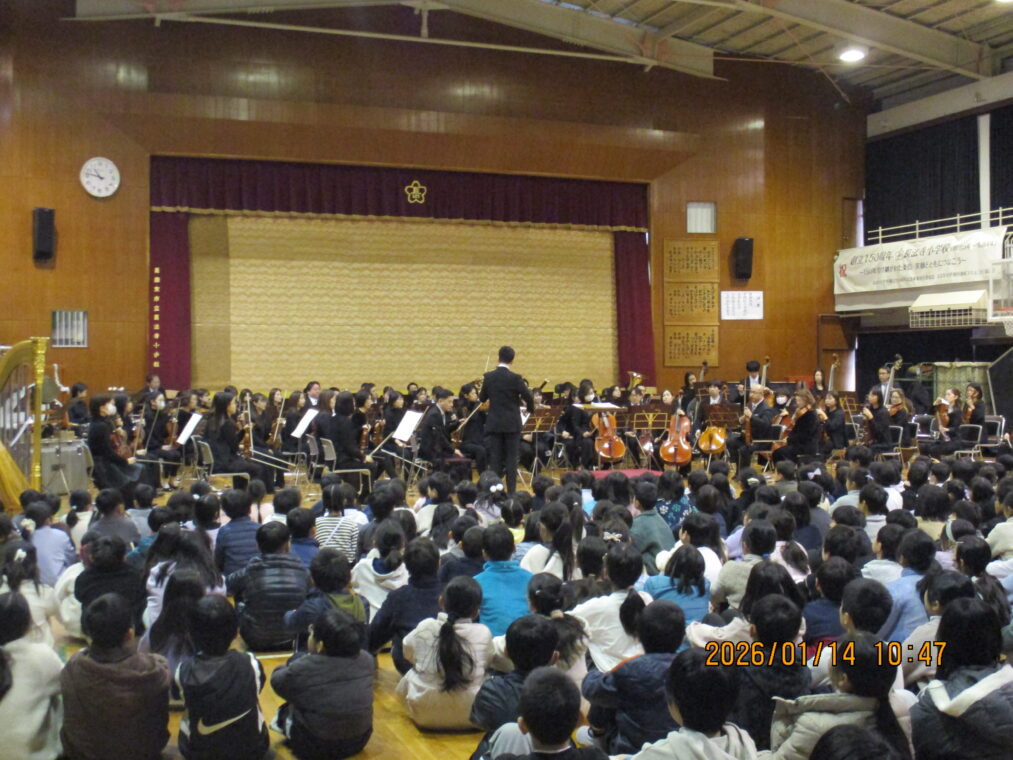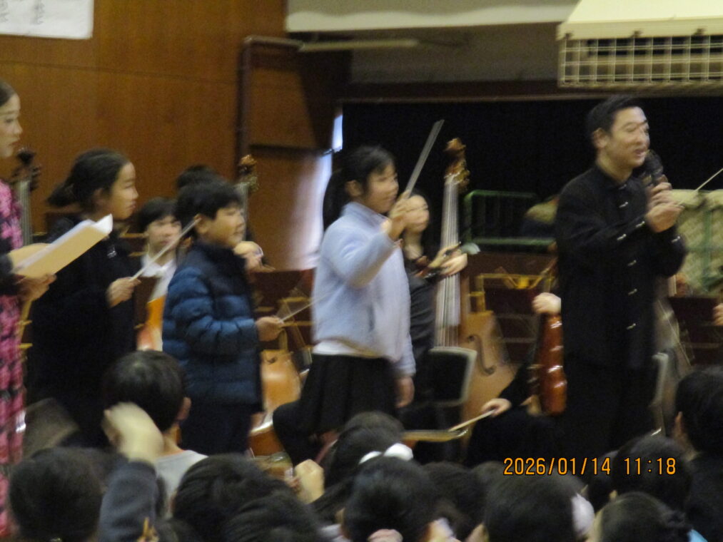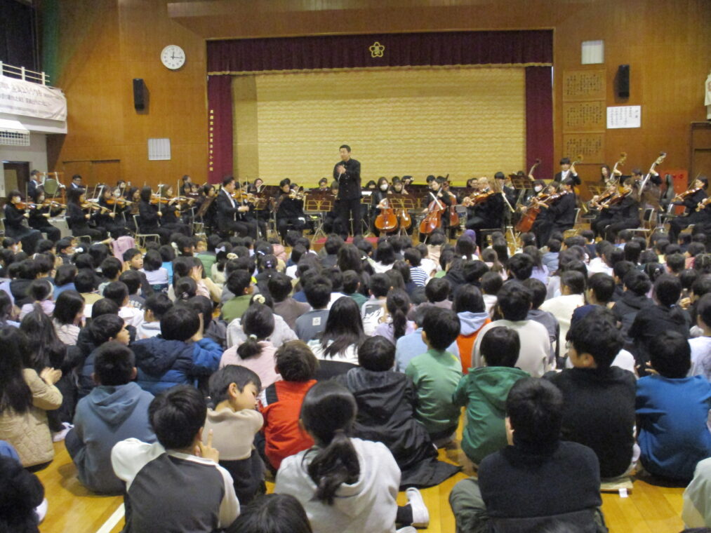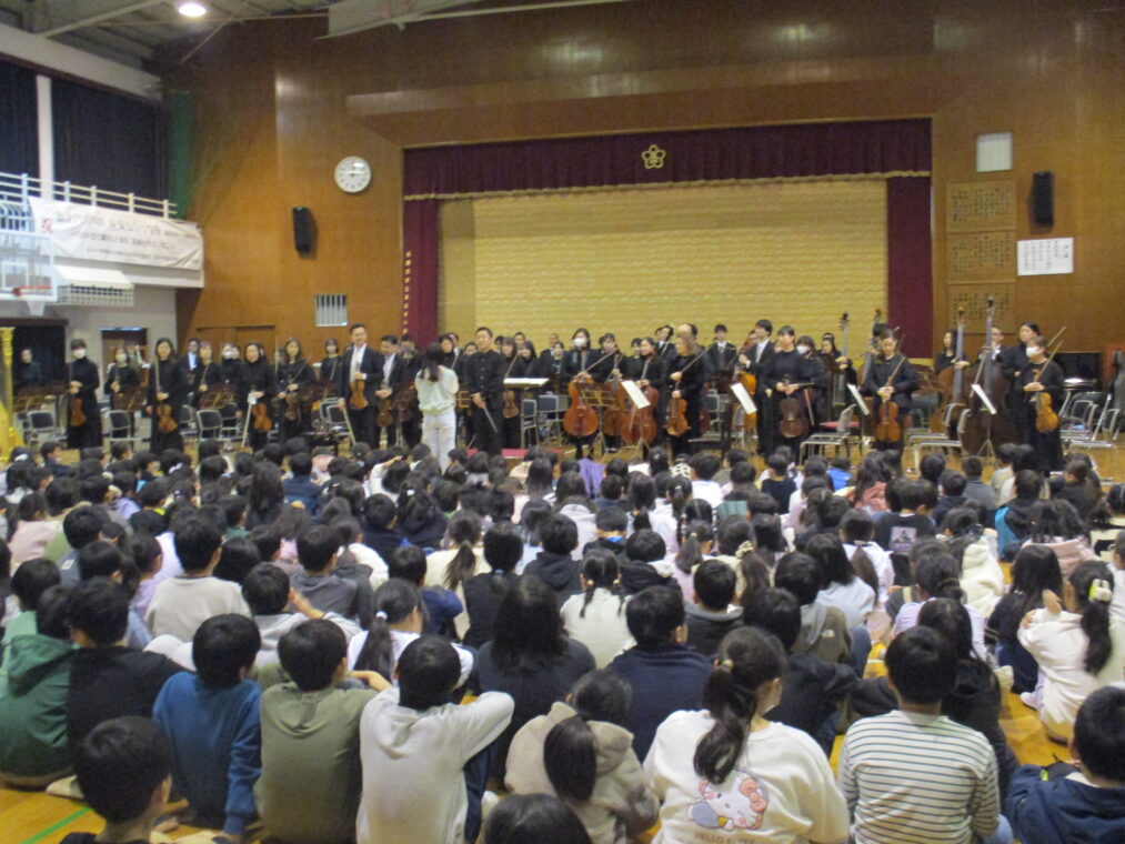 14日、大阪フィルハーモニー交響楽団による「Enjoy!オーケストラ!」音楽鑑賞会を実施しました。9月にワークショップがあり4名の方が来ていただきましたが、今回の本番では60名を超える演奏者、指揮者、司会者、スタッフの方で来ていただきました。演奏が始まるとすぐにその迫力・美しい音色に引き込まれ、子どもたちは体を揺らしたり演奏の様子に見入ったりしながら音楽の世界にひたることができました。オーケストラの演奏を聴くのが初めての子どもたちもたくさんいましたが、司会の方から楽器の紹介や音色についての説明についても詳しく教えていただきました。指揮者体験では3人の児童が実際にオーケストラを指揮する体験をしたり、オーケストラを伴奏にみんなで校歌を歌ったりするなど、盛りだくさんの2時間でした。指揮者を体験した児童は、「すっごく緊張した!うまく振るのは難しかった!」と話してくれました。また、1年生に感想を聞いてみると、「楽しかった!いろんな楽器があった!」と話してくれました。