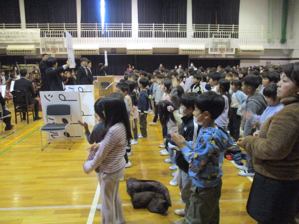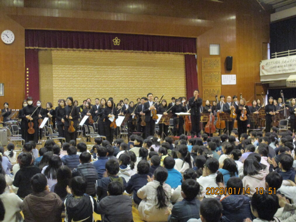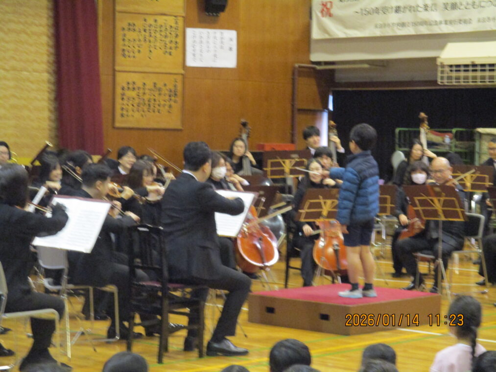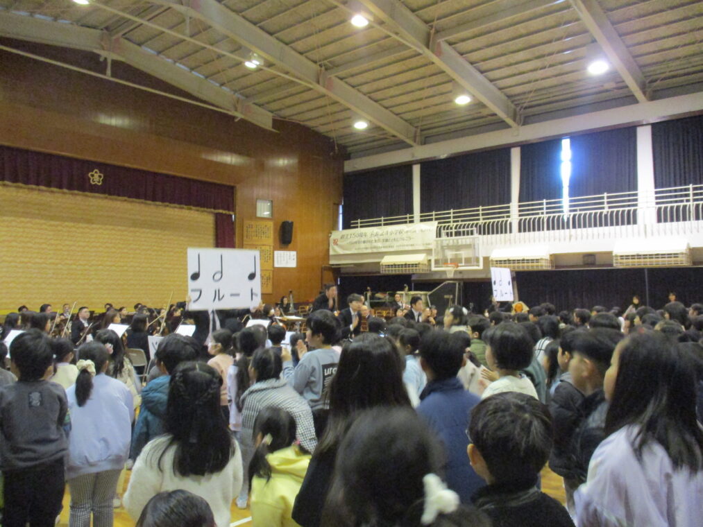 14日、大阪フィルハーモニー交響楽団による「Enjoy!オーケストラ!」音楽鑑賞会を実施しました。9月にワークショップがあり4名の方が来ていただきましたが、今回の本番では60名を超える演奏者、指揮者、司会者、スタッフの方で来ていただきました。演奏が始まるとすぐにその迫力・美しい音色に引き込まれ、子どもたちは体を揺らしたり演奏の様子に見入ったりしながら音楽の世界にひたることができました。オーケストラの演奏を聴くのが初めての子どもたちもたくさんいましたが、司会の方から楽器の紹介や音色についての説明についても詳しく教えていただきました。指揮者体験では3人の児童が実際にオーケストラを指揮する体験をしたり、オーケストラを伴奏にみんなで校歌を歌ったりするなど、盛りだくさんの2時間でした。指揮者を体験した児童は、「すっごく緊張した!うまく振るのは難しかった!」と話してくれました。また、1年生に感想を聞いてみると、「楽しかった!いろんな楽器があった!」と話してくれました。