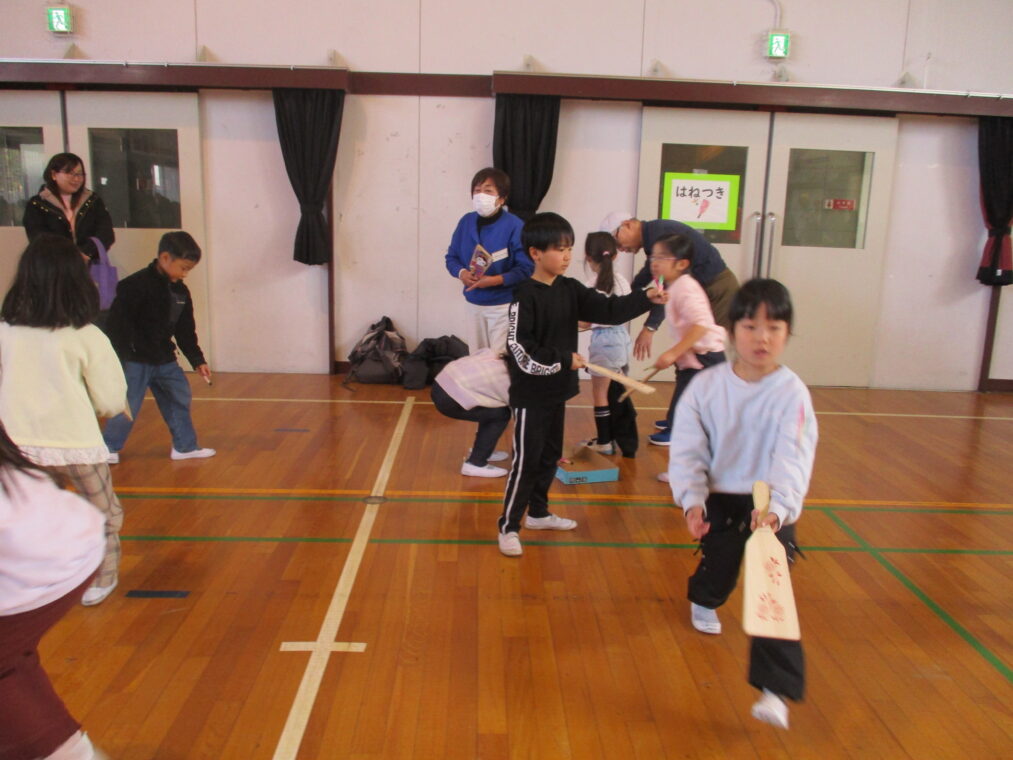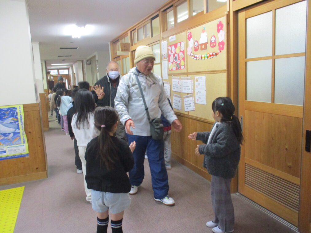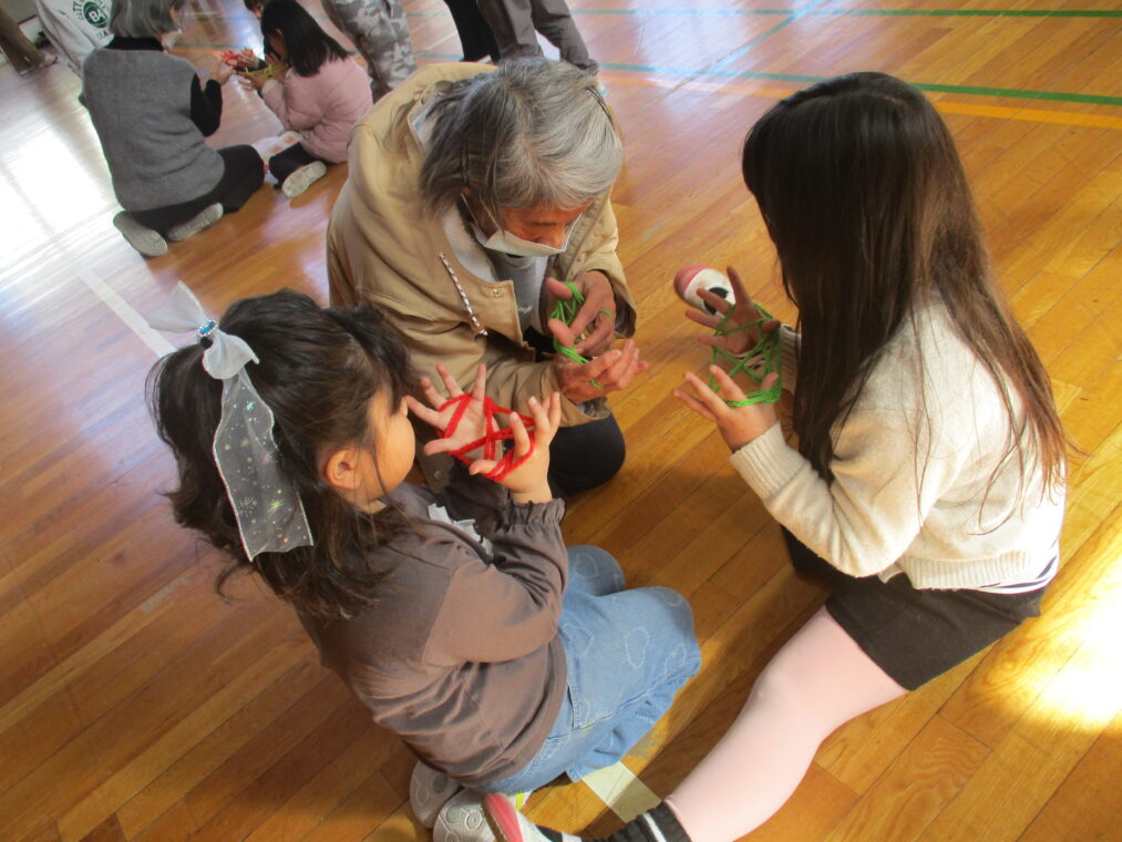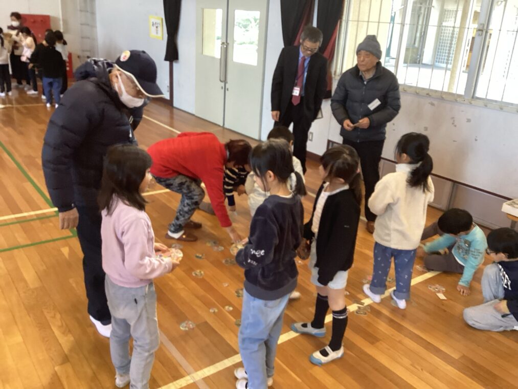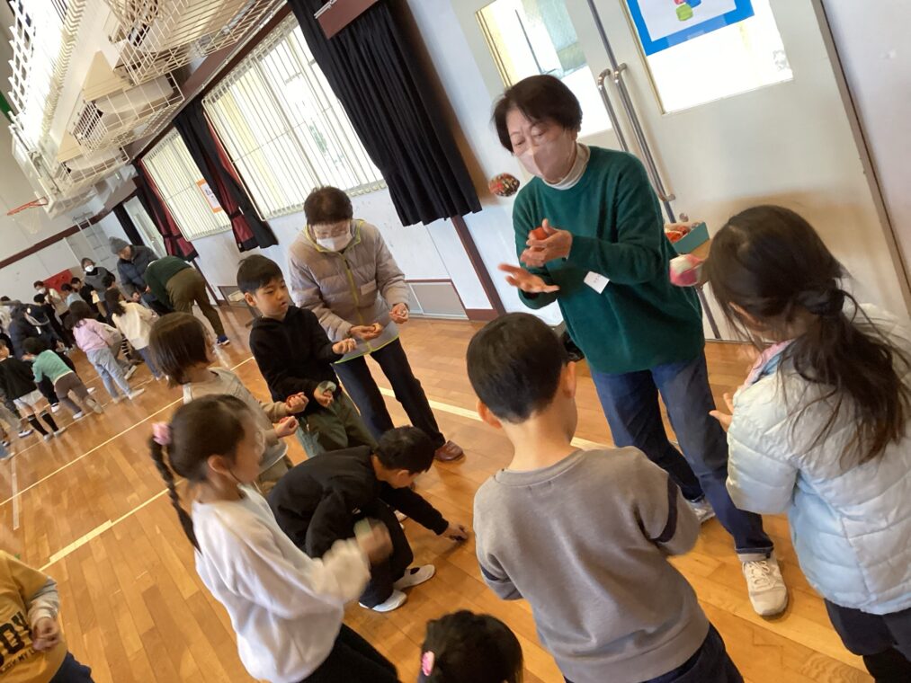 1年生生活科「昔から伝わるあそびを楽しもう」という学習で、昔の遊びをよく知る地域の方々をお招きして交流しました。こままわしやけん玉、あやとりなどでは、子どもたちから「見て!見て!」とできる技を見せ褒めていただいたり、新しい技を教えてもらったりして、とてもうれしそうでした。近年では中々身近にない「めんこ」「羽子板」「お手玉」のコーナーもあり、子どもたちにとっては貴重な体験ができました。とても寒い日でしたが、23人もの地域の方々にご参加いただき、「子供たち元気やなあ。楽しかったです!」「パワーもらいました」とおっしゃってくださり、子どもたちも名残惜しそうな様子でした。心温まる交流ができたことに感謝です。ぜひ、次年度も多くのご参加をお待ちしています!