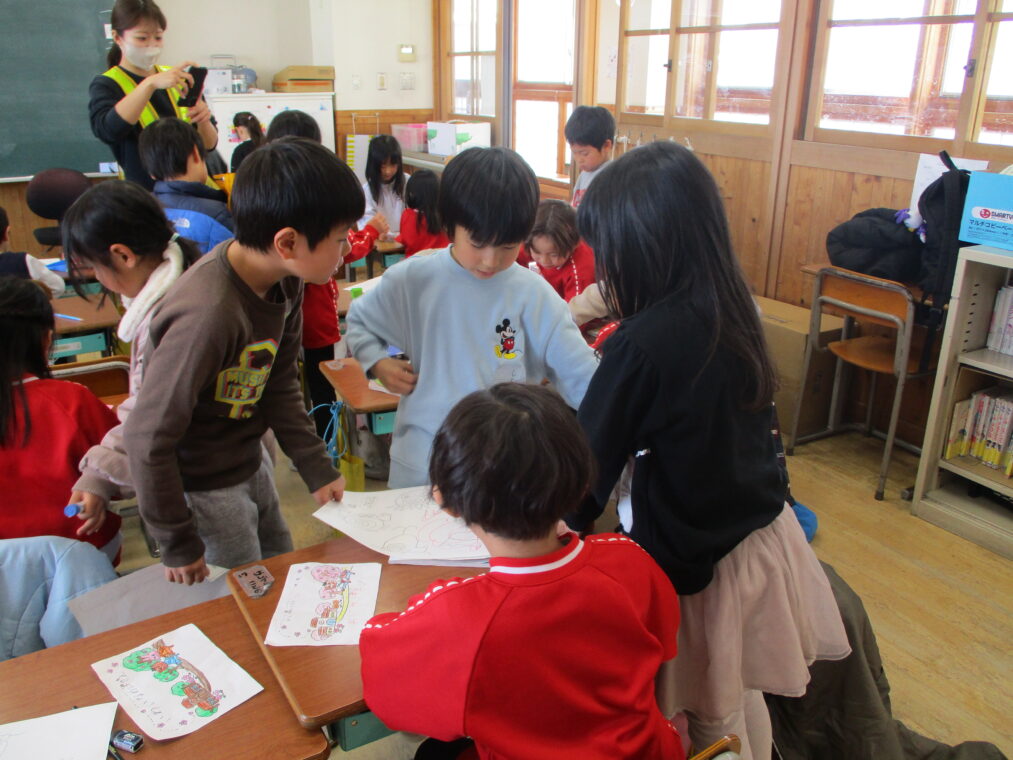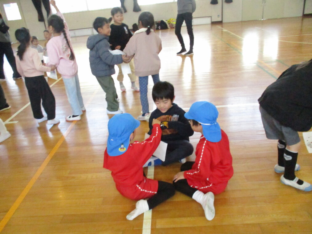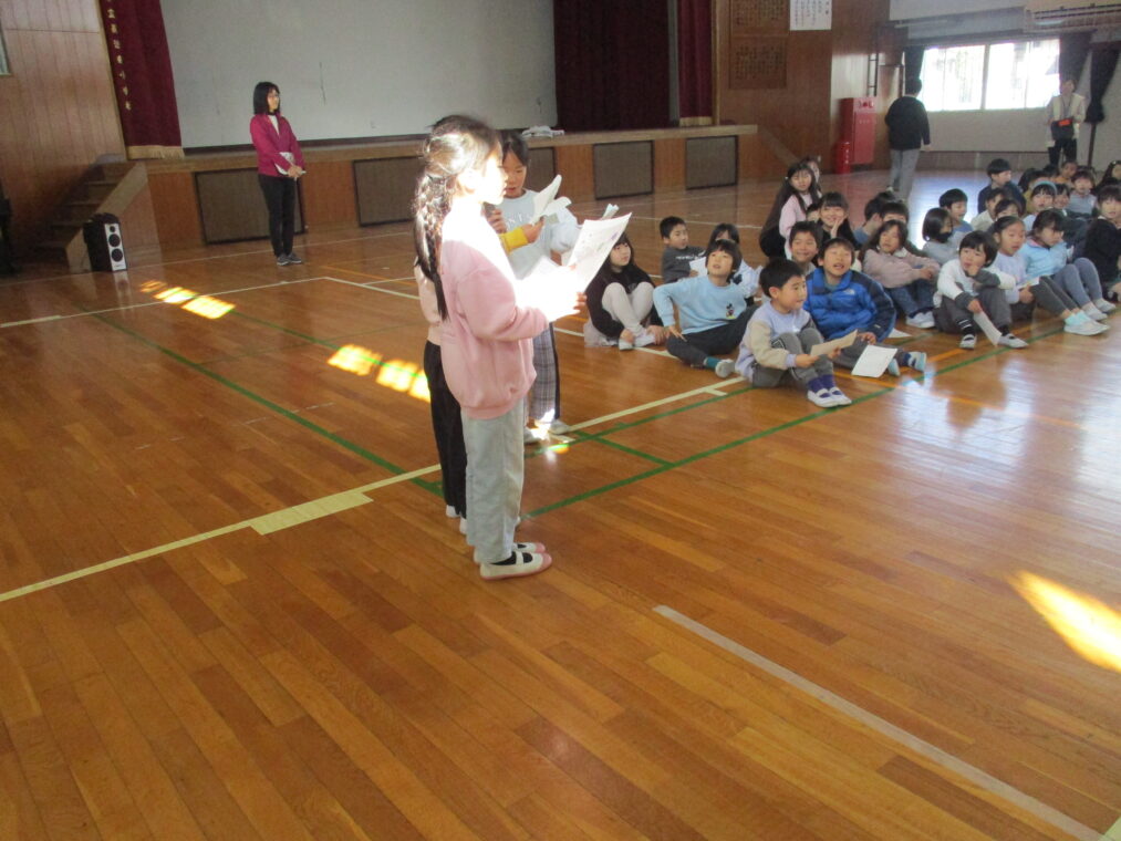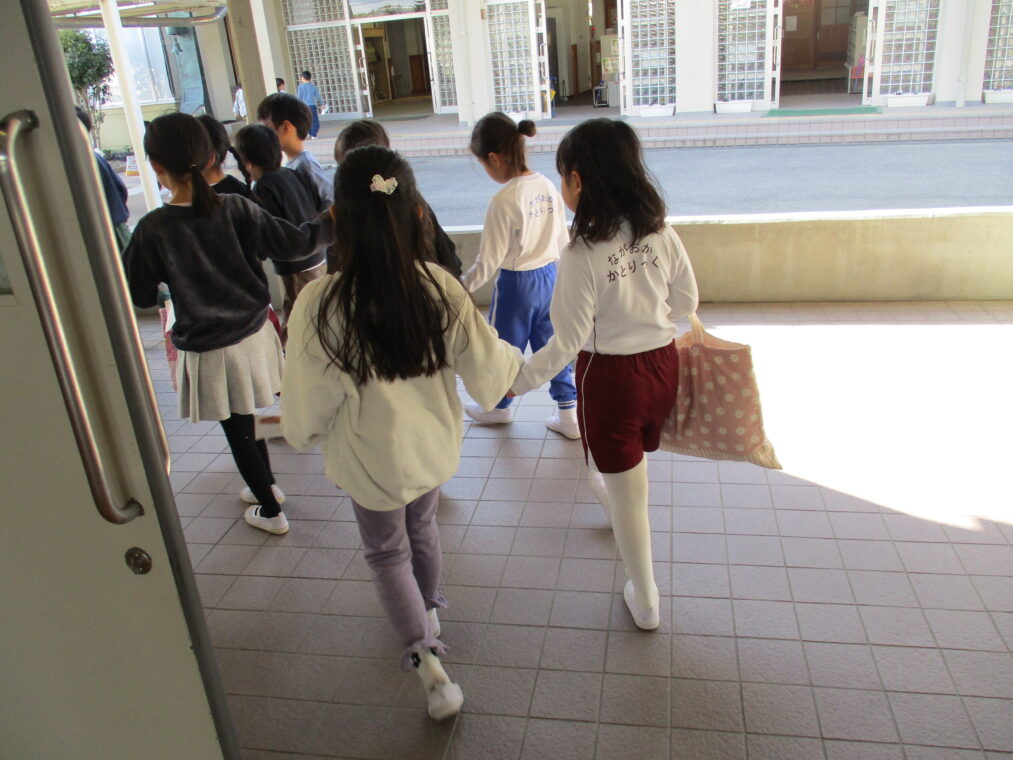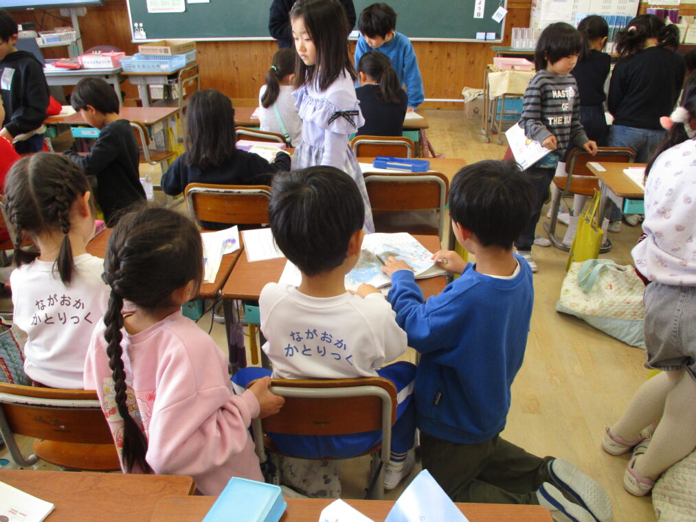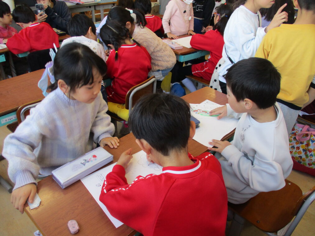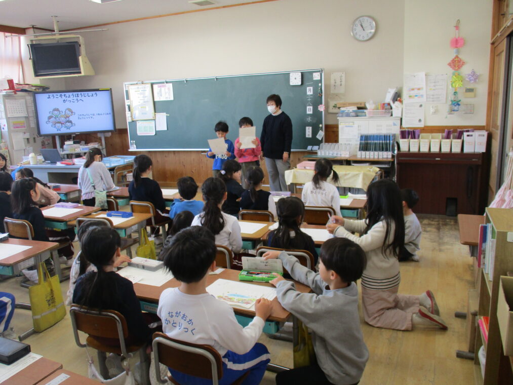 1月28日、長岡カトリック幼稚園と長岡京コペル保育園の年長さんが、長法寺小学校に「もうすぐ1年生」体験に来ました。体育館では1年生の司会担当の子どもたちが緊張気味にマイクをにぎり、立派に始めのあいさつをし、「もうじゅうがりをしようよ」のゲームで一緒に楽しく遊びました。その後、ペアの園児さんと手をつないで教室に移動し、席に座って運筆のワークシートをしました。横で「こうやって鉛筆を持つんやで。」「上手!」と優しく声をかける1年生を見ると、入学してきた4月と比べるとずいぶんお兄さんお姉さんになったなぁと改めて感じました。ランリックを背負わせてあげたり、教科書を見せてあげたりと、園児さんたちからも立派な「小学生のお兄さんお姉さん」に見えていたと思います。いよいよあと少しで2年生になり、新1年生を迎えます。楽しみですね!