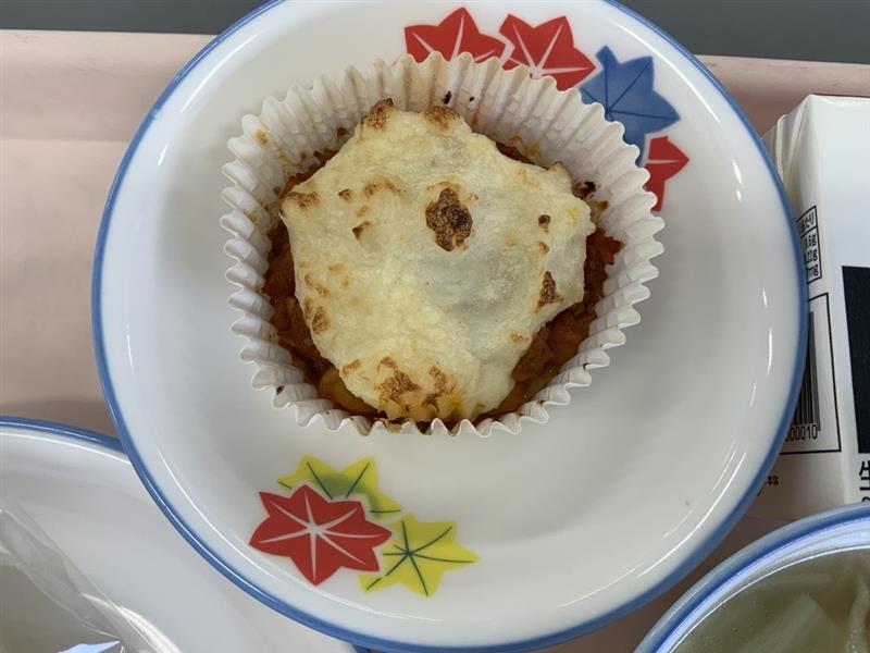 ⑤カップにミートソースを入れ、上にマッシュポテトを載せて、オーブンで250℃10分程度焼き色がつくまで焼く。