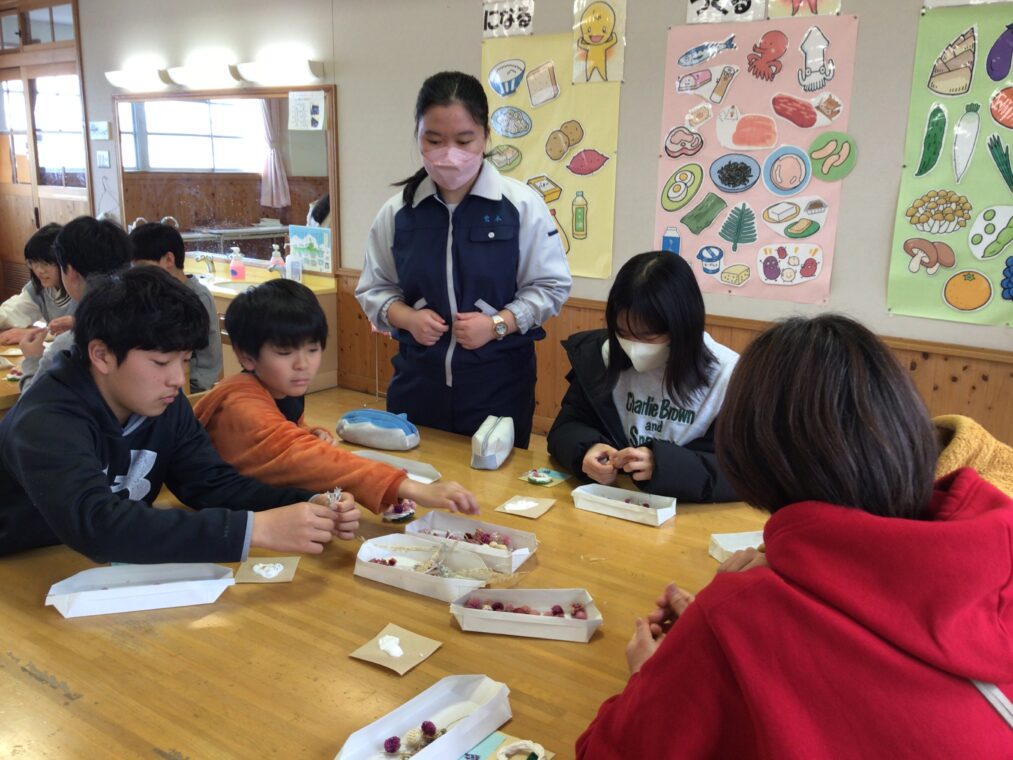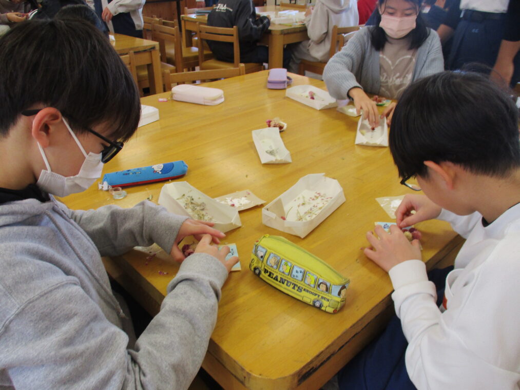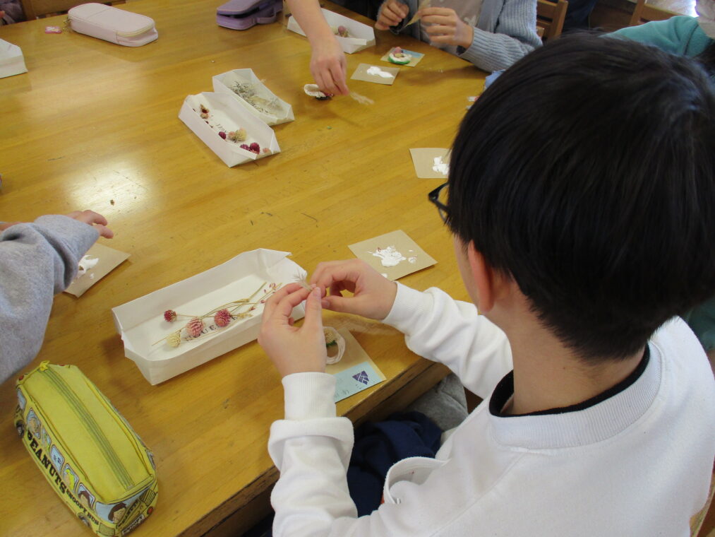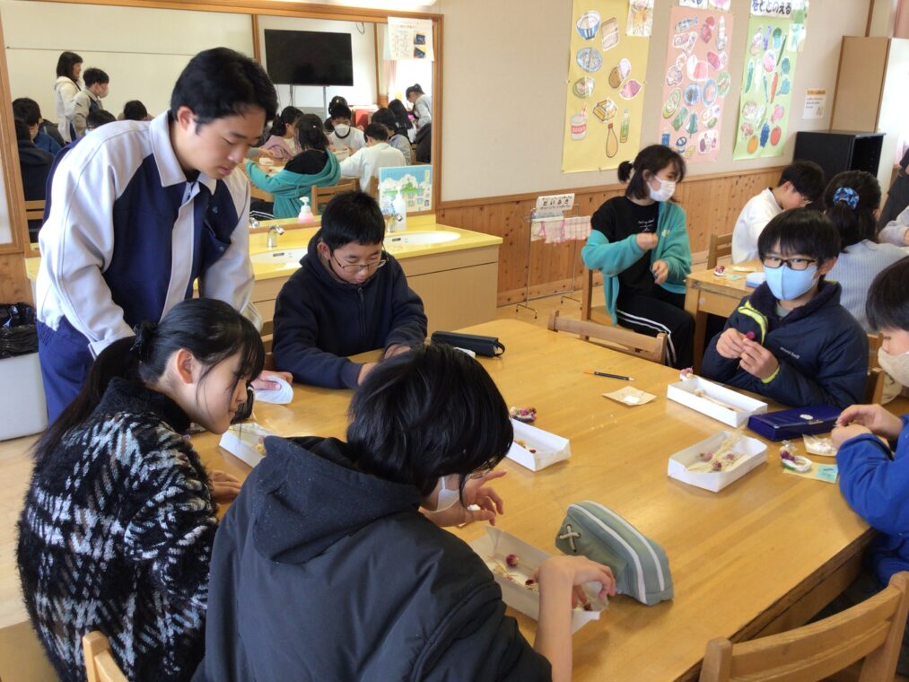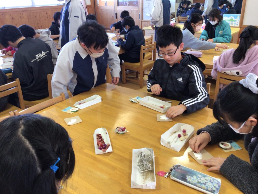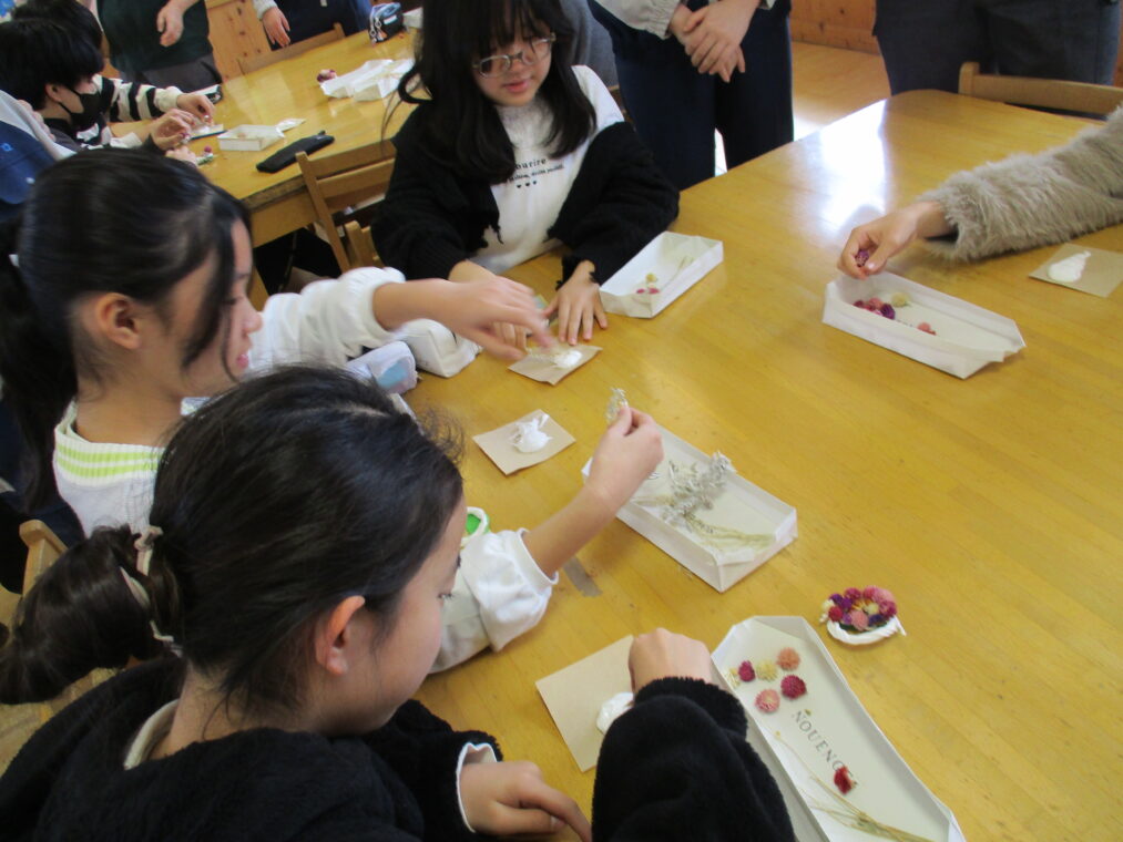1月30日、6年生が向日が丘支援学校の高等部の生徒さんに教えていただき、コサージュを作成しました。支援学校の高等部では、作業学習の一環として様々なことをされています。その一つに、自分たちで育てたお花を使ったドライフラワー・コサージュ等の制作や販売があります。昨年度から、6年生は高等部の生徒さんに教えてもらいながら自分たちでコサージュを作成し、卒業式にそれをつけて出席しています。たくさんのお花を用意していただき、班ごとについてくださっている高等部の生徒さんに手順や注意事項を教えていただきながら制作しました。子どもたちは真剣な表情で楽しみながらコサージュ作りに取り組んでいました。一人ひとり選ぶお花や配置の仕方に個性が出て、とても素敵な作品ができました。出来上がりを見て、みんな満足そうな顔でした!自分の作ったコサージュをつけて臨む卒業式まで、あと27日。存分に小学校生活を楽しみ、最後の思い出を作ってほしいと思います。
