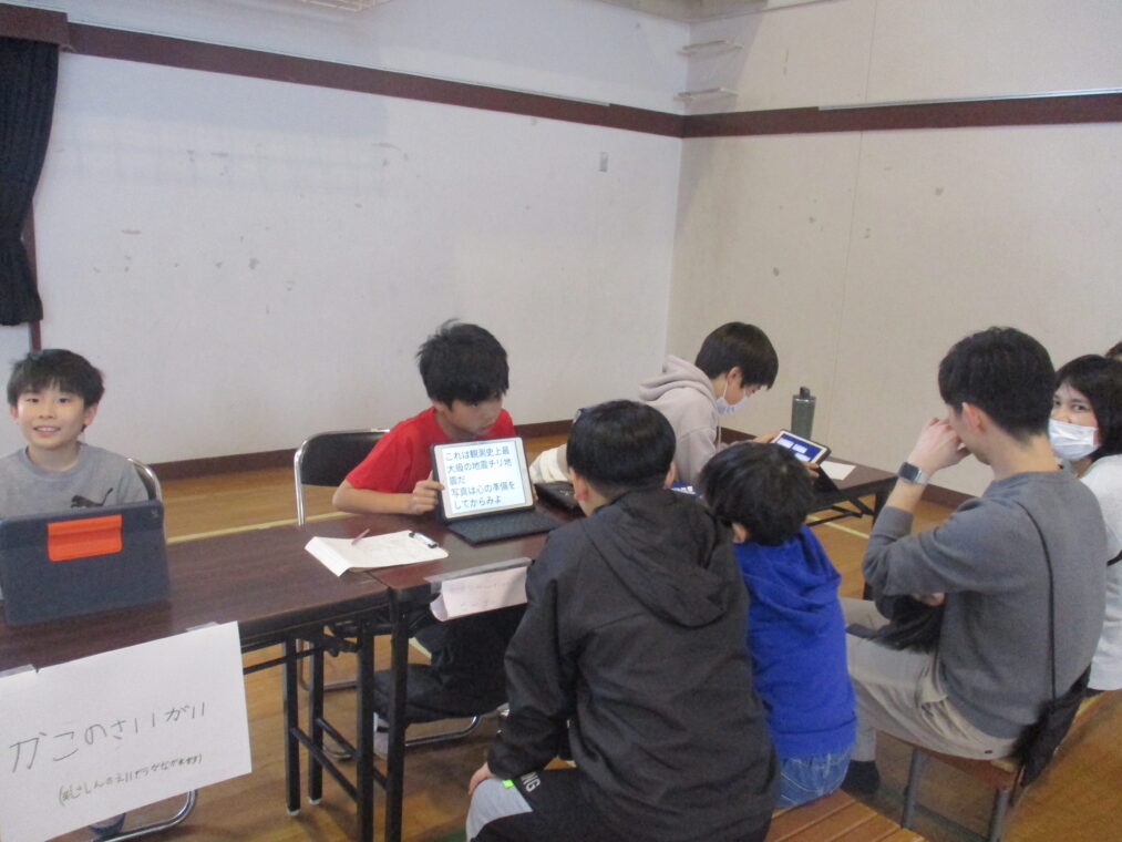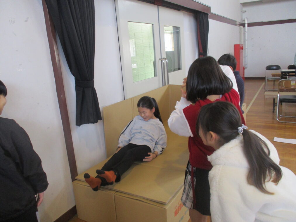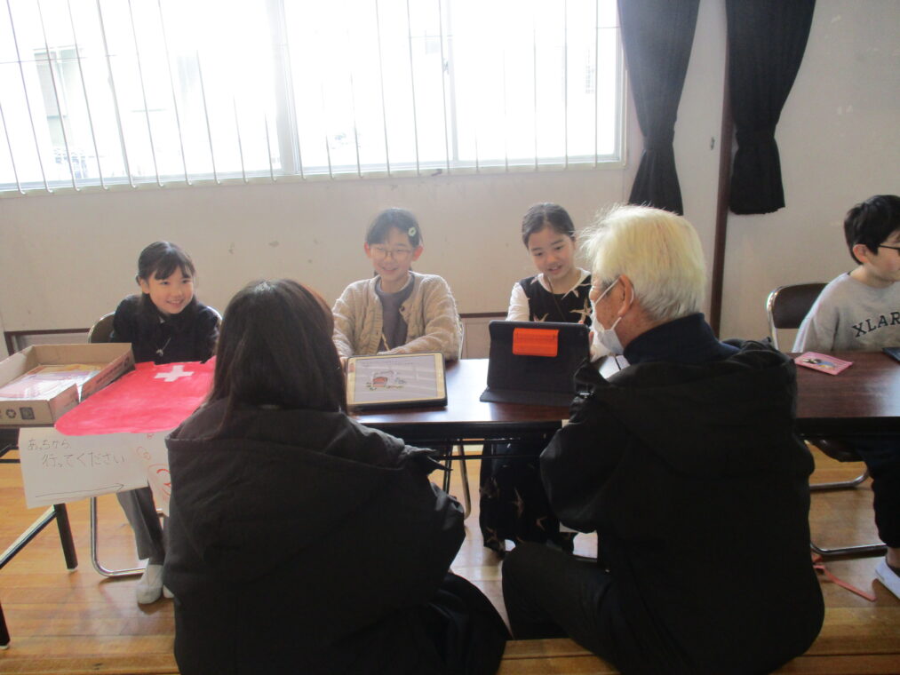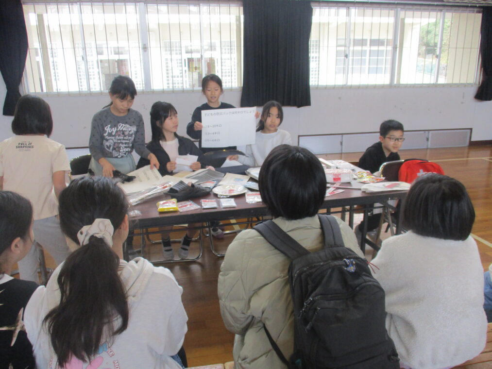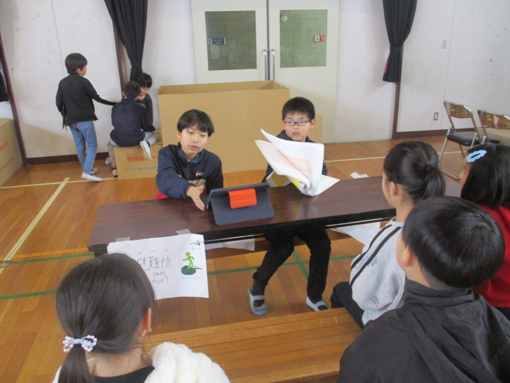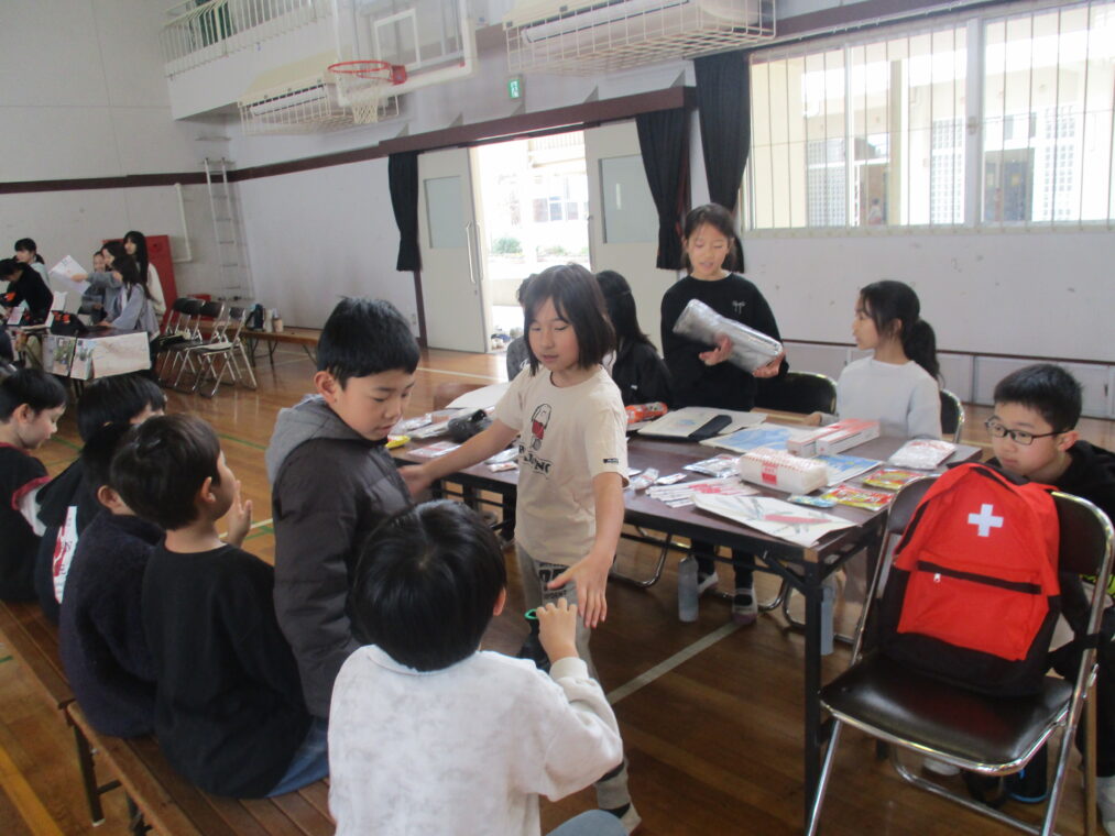 4年生は総合的な学習の時間に「みんなで暮らすまち」というテーマで1年間学習を進めてきました。その中で「防災」について学んできたことを伝える「防災教室」を2月27日に開催しました。グループに分かれて、体験ありクイズあり実演あり…と様々な方法で工夫を凝らし、どうやったらより伝わりやすいかという視点で準備をしてきました。内容は「防災食について」「在宅避難について」「防災グッズについて」「段ボールベッドについて」など、初めて知るようなこともたくさんありました。3年生、保護者の方、防災について教えてくださった地域の方や市の方を招待し、自分たちが学んだことを伝えました。4年生は、今回の発表でお客さんから質問や感想をたくさんもらい、自信がついたと思います。これからの学習に活かしていってほしいと思います!