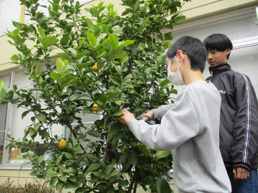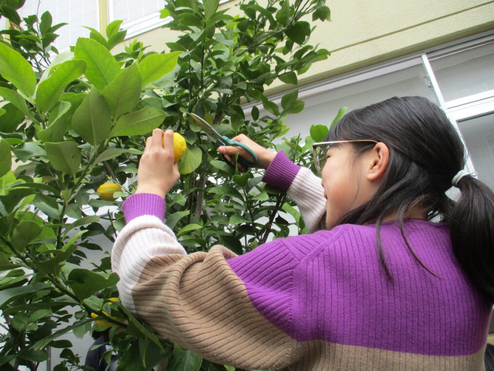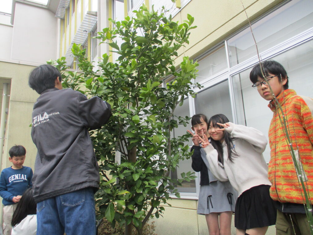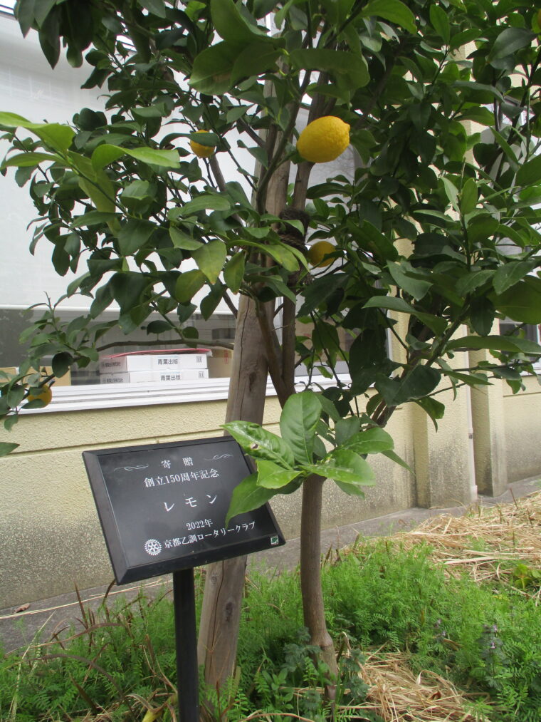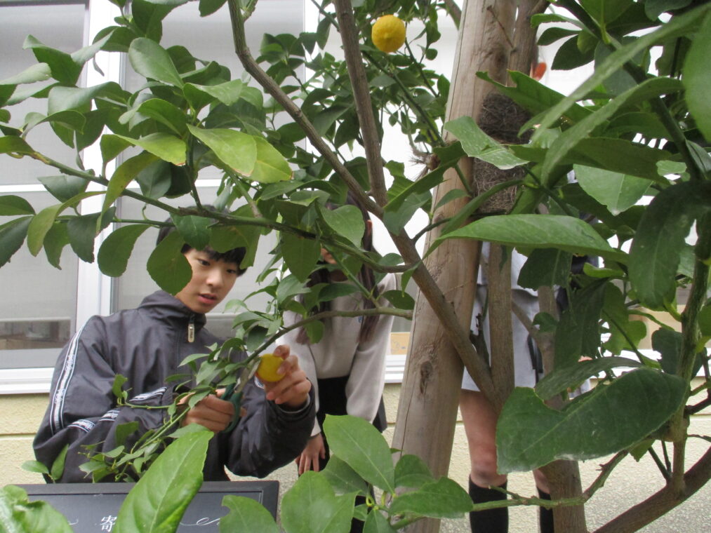 長法寺小学校の駐車場側の花壇には、150周年の記念樹として植えられたレモンの木があります。花ボランティアの井上さんが剪定したり冬の寒さを凌ぐために不織布をかぶせたりしてお世話をしてくださっていました。今年、3年目にして初めて実が成りました。2月28日に、全校を代表し児童会の子どもたちにもぎ取ってもらいました。収穫した初レモン10個は給食に使えないか検討中です。どんな風に給食に登場するか、楽しみです!