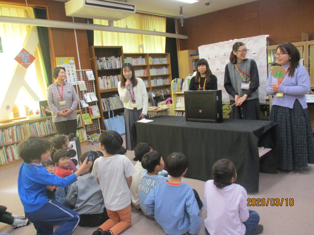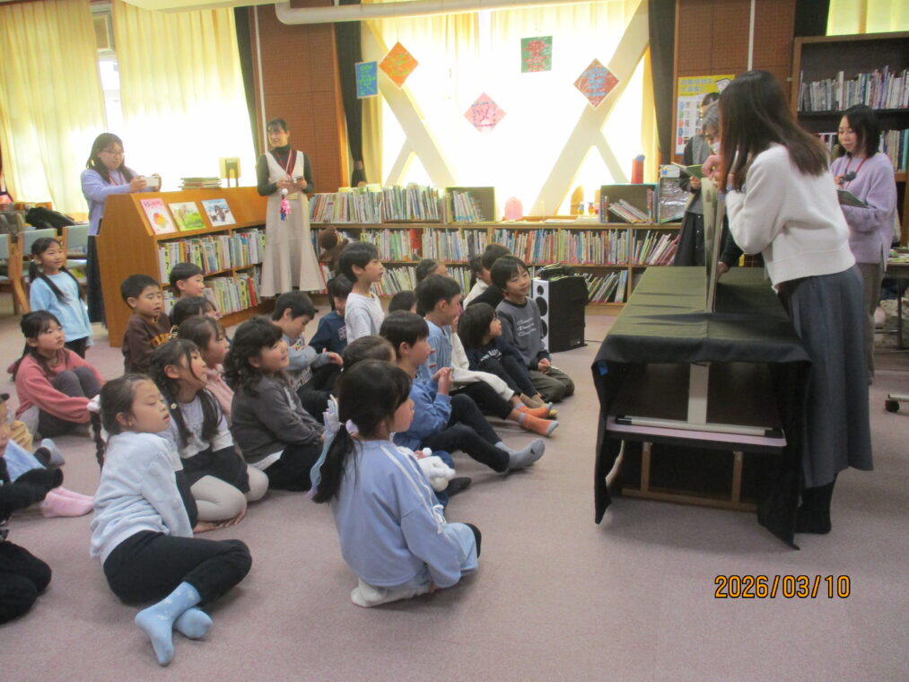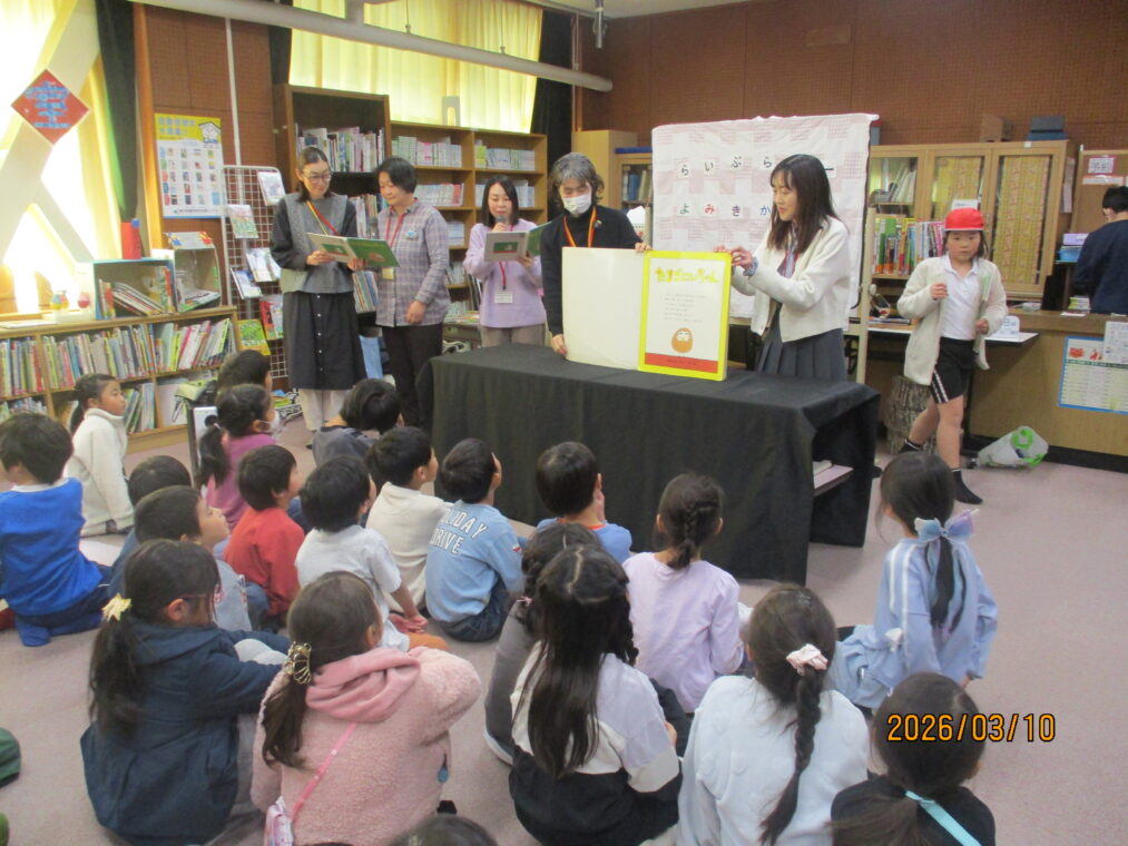 今年度最後の、らいぶらり~さんによるおはなし会がありました。今年度も、毎月、子どもたちが楽しめる内容のおはなし会を開いてくださいました。今回は「らいぶらり~クイズ」から始まり、今年度のおはなし会の内容にちなんだクイズでした。毎回参加している子ども多く、「あ~、知ってる!」「行ったし分かる!」という声があちこちから聞こえてきました。クイズのあとは、紙芝居と大型絵本の読み聞かせでした。どちらも、楽しみながら聞き入っていました。