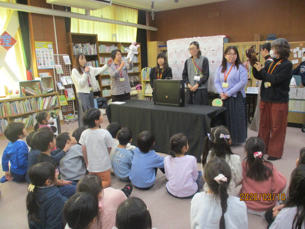 らいぶらり~さんには、おはなし会、学級での読み聞かせ、素敵な飾りと本の組み合わせの「ひとはこらいぶらり~」、掲示板での「挑戦状」など一年を通して子どもたちのために楽しい時間を作っていただきました。一年間本当にありがとうございました!