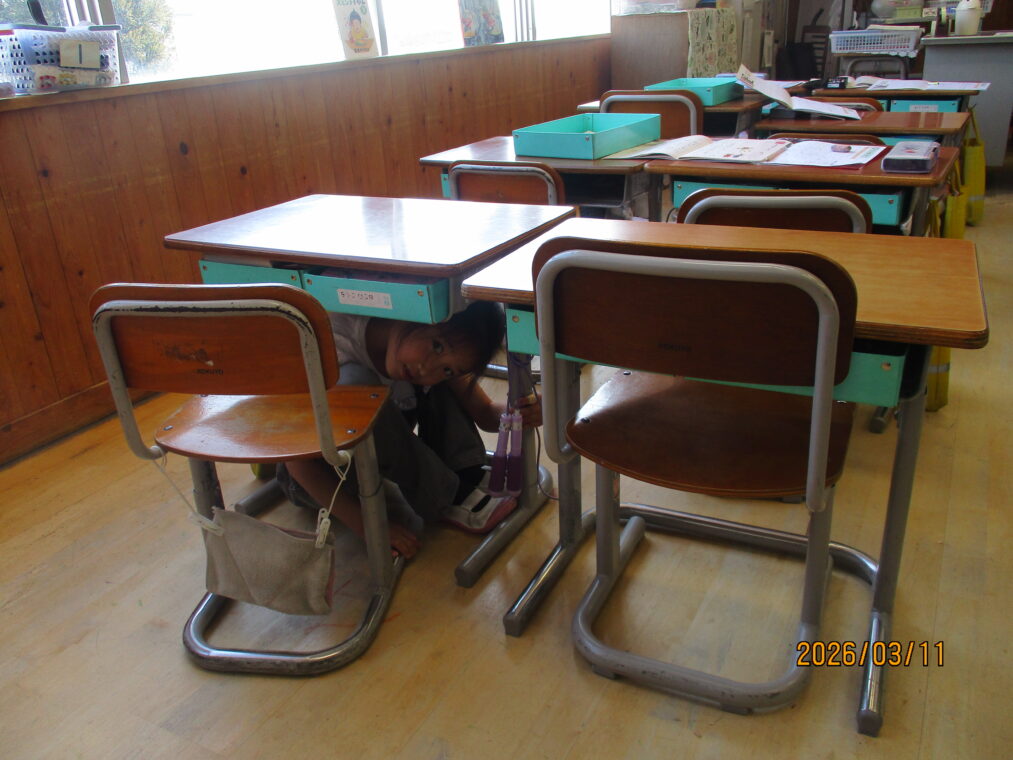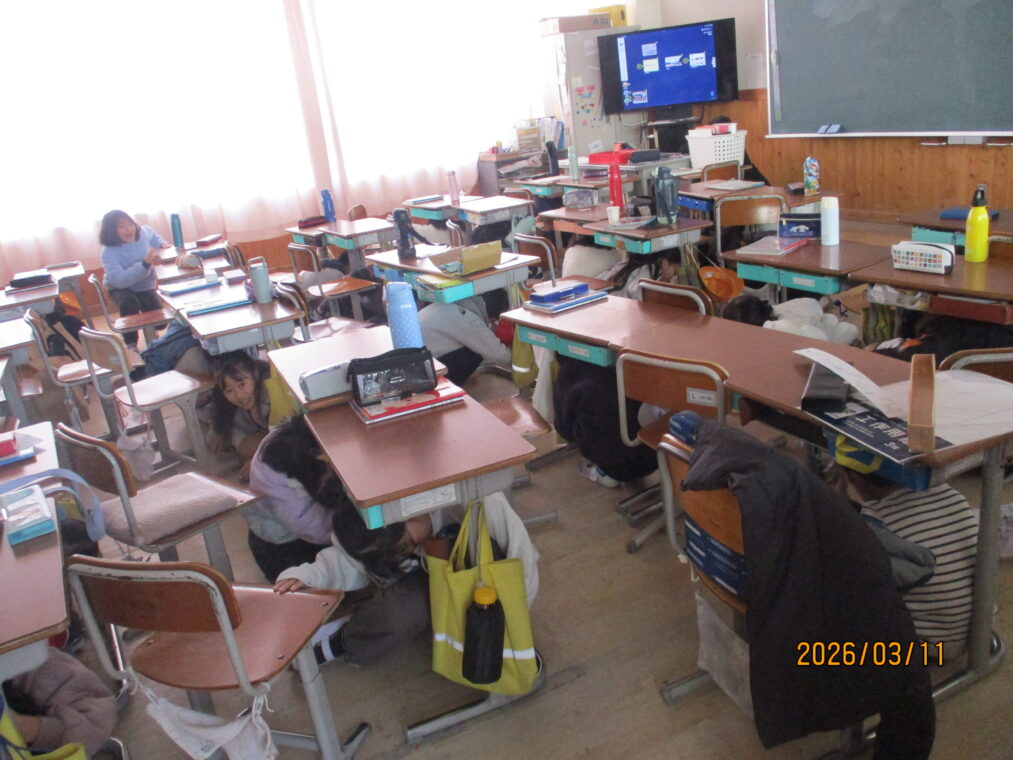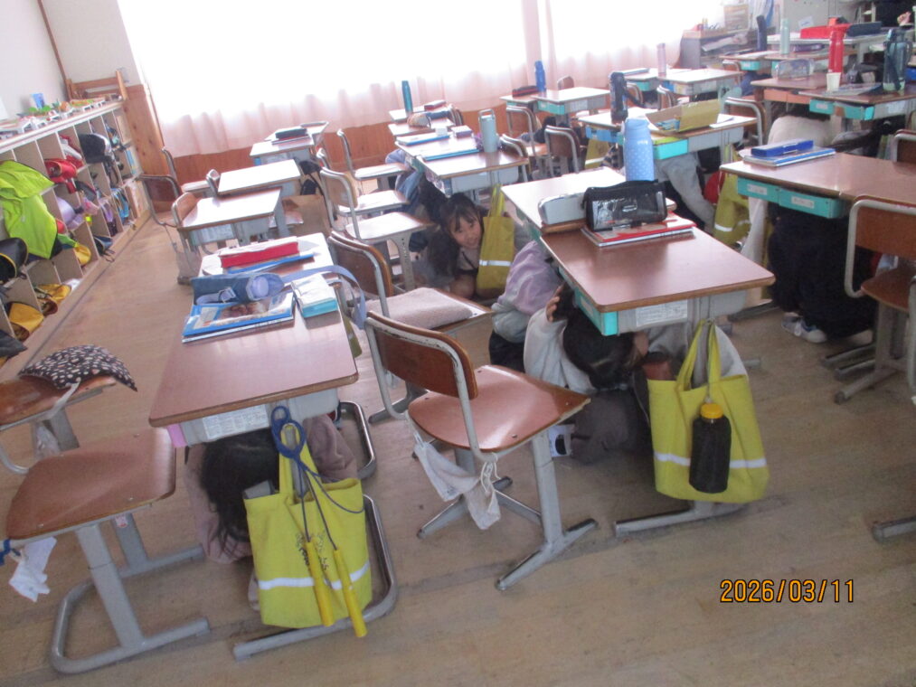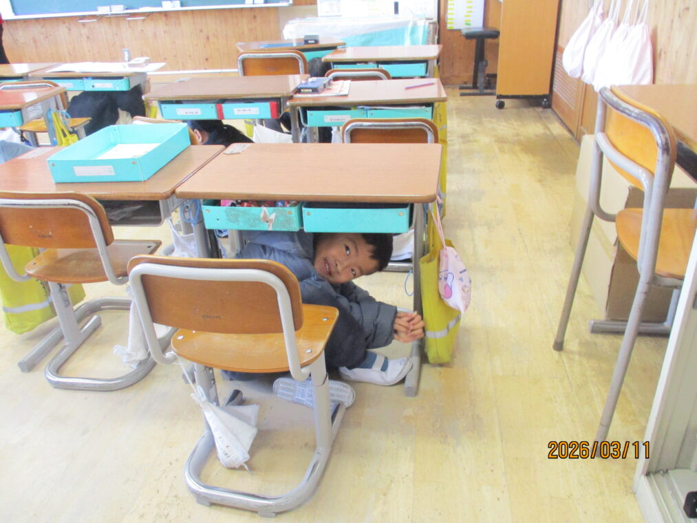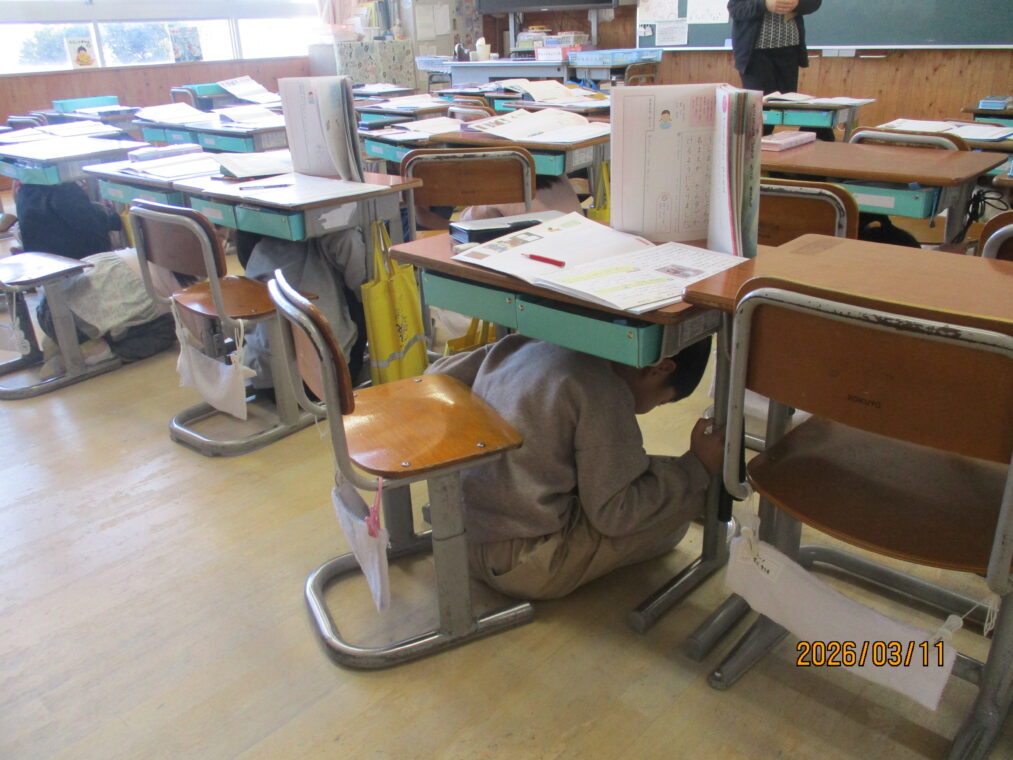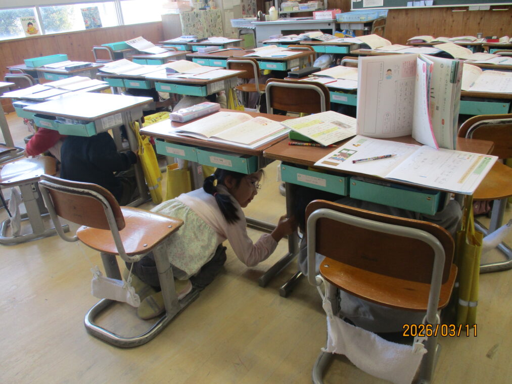 3月11日は東日本大震災のあった日です。テレビでもこの間、防災についてたくさん報道がされていますね。3月11日は長岡京市としてシェイクアウト訓練を実施しています。長法寺小学校でもそれに合わせて訓練を実施しました。地震が発生したという放送の合図ですぐに机の下にもぐり、机の脚をおさえ、次の指示を待ちます。1年生も、とても素早く行動することができていました。南海トラフ地震の可能性もニュースで報道されているところです。定期的に、防災について考えたり身を守る練習を繰り返していきたいと考えています。