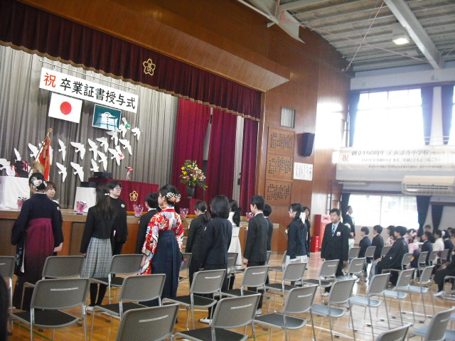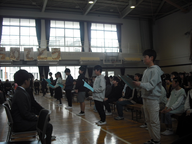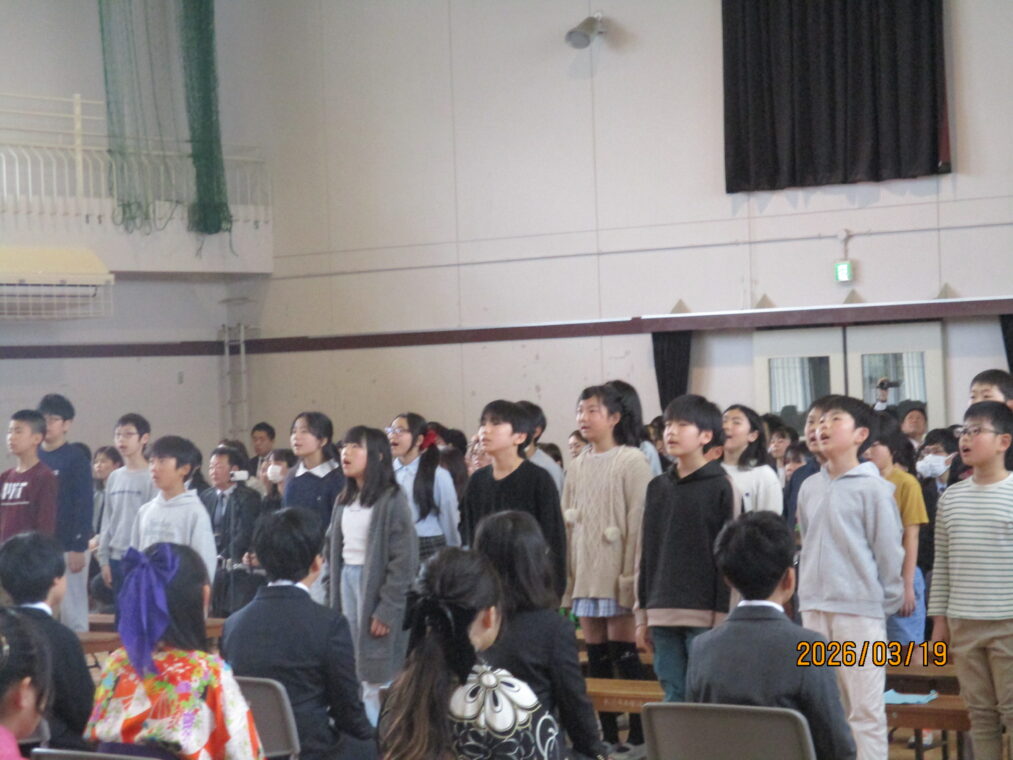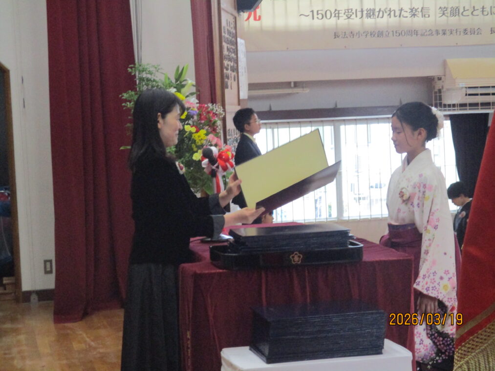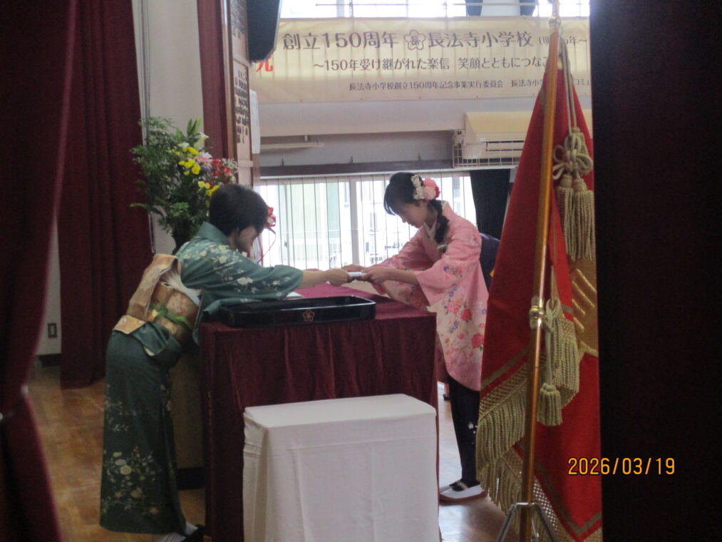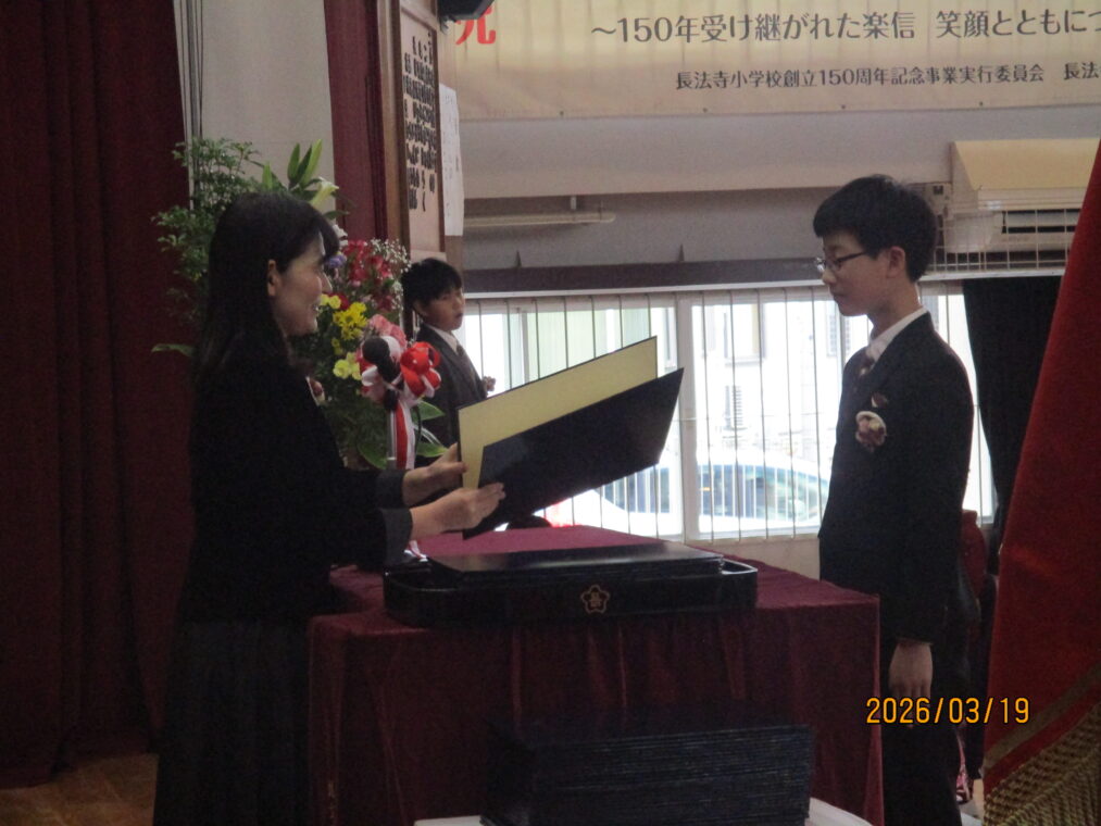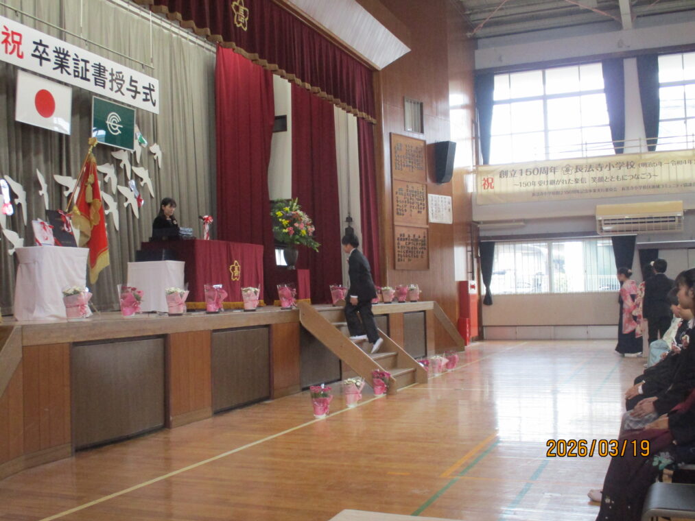 朝まで降っていた雨も上がった3月19日、卒業証書授与式を行いました。令和7年度の6年生、60名が長法寺小学校を巣立っていきました。全校のリーダーとして優しく頼もしくみんなを引っ張ってくれた6年生。卒業式で見せた姿も堂々として立派でした。呼びかける声には気持ちがこもり、「この地球のどこかで」を二部合唱した歌声はきれいに体育館中に響いていました。そして、最高学年のバドンを受け取った5年生。6年生の姿を目に焼き付け、これからの一年間を過ごしていくと思います。