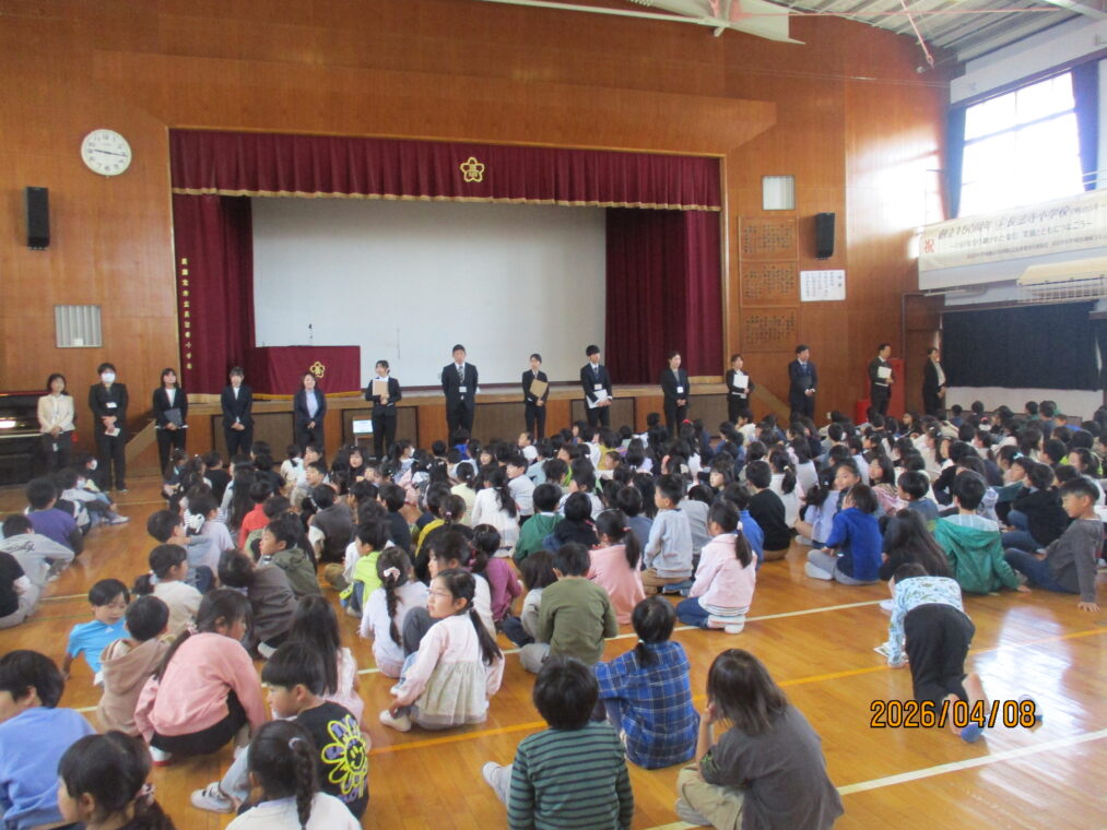 TOPICS令和8年度が始まりました。春休みを過ごした子どもたちは、本日、元気いっぱいに登校してきました。新しい学級、新しい先生にドキドキそわそわしながら今日を迎えたことでしょうね。着任式では、新しく来られた4名の先生方の紹介がありました。始業式では担任の先生の発表があり、さっそく新しい学級での生活が始まりました。全校383名と先生たちで「楽しく 信じ合う」学校を目指し、今日から頑張っていきます。