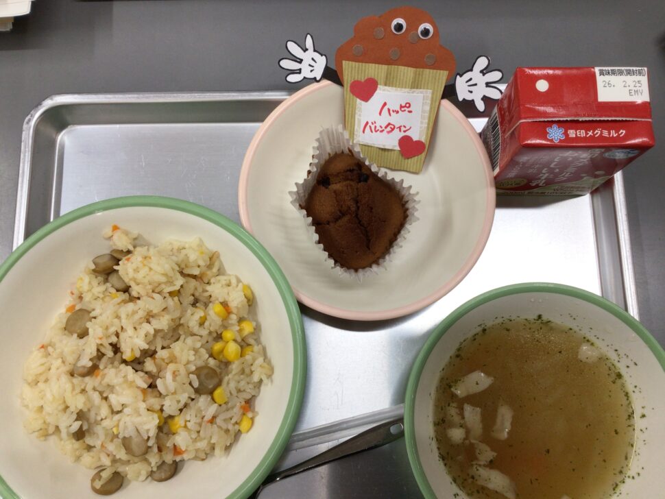 2月14日はバレンタインなので1日早くバレンタイン気分を味わいました❣️献立はウインナーピラフ、米粉のハートマカロニスープ、ダブルチョコマフィン、牛乳です!チョコマフィンは調理師さん手作りのマフィンでした!生地を一つずつカップに入れ、オーブンで焼き上げてくれました!各クラスには手作りのかわいいメッセージも☺️愛情たっぷりでとてもおいしかったです!!ハッピーバレンタイン💘