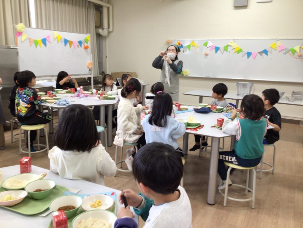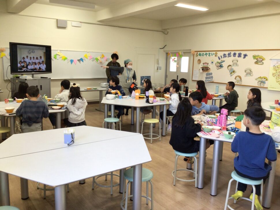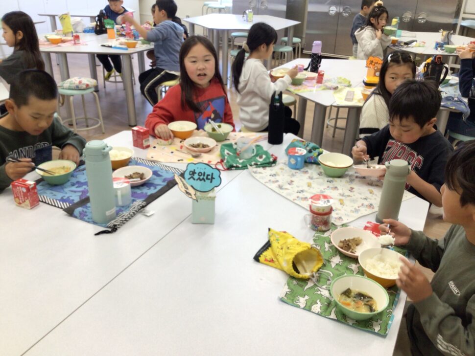 1、2年生は特別給食として、ランチルームでクラスごとに給食を食べました。いつもの教室と違い、ランチルームでの給食にワクワクしていた子どもたち。