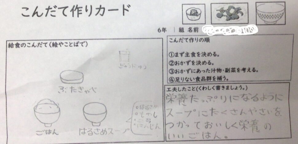 05.給食だより今日も6年生が考えた献立が登場しました!ご飯、春雨スープ、豚きゃべ、牛乳です。栄養たっぷりになるように、たくさんの野菜を使った献立にしてくれました!とても美味しかったですね!豚きゃべはご飯がすすむ味付けにしましたがみなさんどうでしたか?給食をもりもり食べて元気な体をつくりましょうね😋