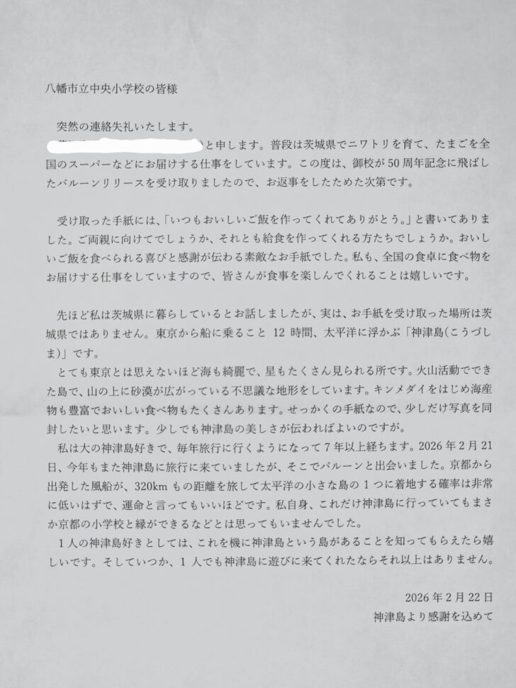 送り主の方は、旅行先の神津島で風船を拾い、