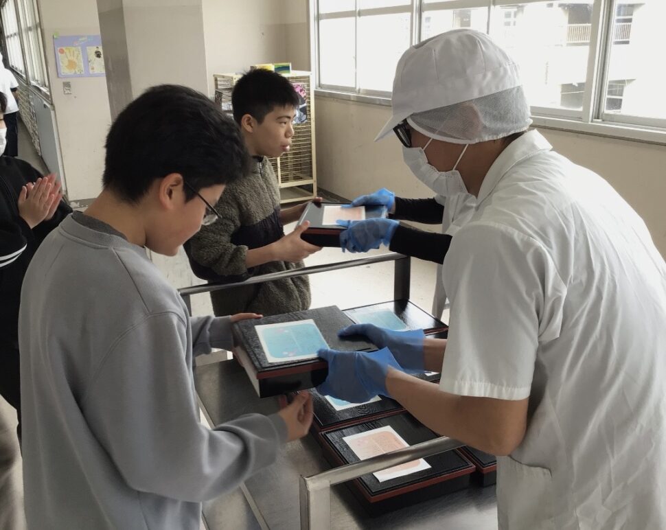今日は6年生の卒業をお祝いして、6年生は松花堂弁当給食でした!松花堂弁当は八幡市が発祥の地と言われていることもあり、四つに区切られたお弁当箱に色とりどりのおかずをつめて毎年6年生のお祝い給食として提供しています。6年生にとっていい思い出になってくれているといいなぁと給食室のメンバー一同願っています!中学校へ行っても勉強にクラブにがんばってほしいです☺️