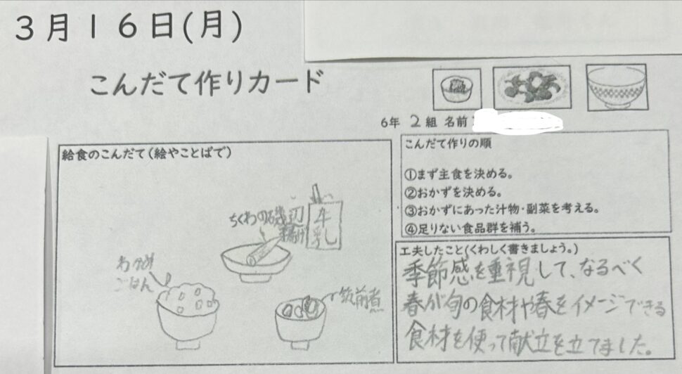 05.給食だより投稿が大変遅くなりましたが3月16日月曜日は6年生がたてた献立最終回になりました!献立はわかめごはん、筑前煮、ちくわの磯辺揚げ、牛乳でした。今和食離れが進んでいると言われているなか和食のいい献立を考えてくれました!これから中学生になられたらきっと自分たちだけで料理を作ったり、食べに行ったりという機会が出てくると思いますが、そういった時に少しでも家庭科で学んだ栄養のことや食のことを思い出してもらえればうれしいなと思っています!6年生がたてた献立どの献立もとても美味しく人気でした!