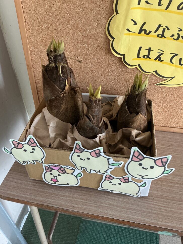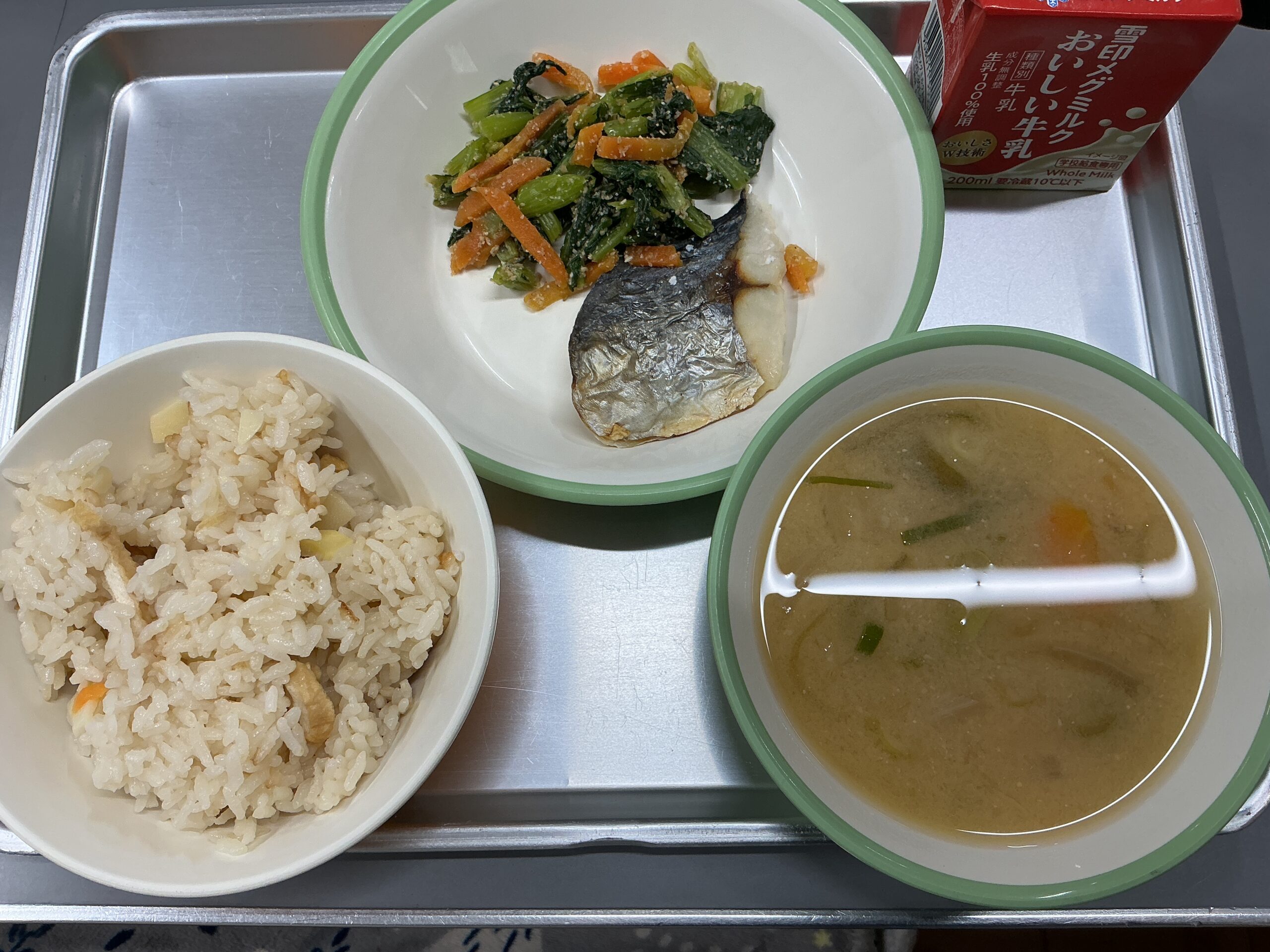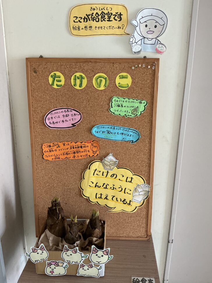 今日は八幡食育の日献立でした!八幡食育の日には1汁2菜の和食の献立を出しています!今日はたけのこご飯、さわらの塩焼き、小松菜のごまあえ、豆腐の味噌汁、牛乳でした!今日のたけのこご飯にはみなさんが住んでいる八幡市産の生のたけのこを使っています!たけのこはまっすぐ上に伸びるので、みなさんがぐんぐん成長しますようにという願いをこめていただきます!今が旬の美味しい八幡のたけのこをいただくことができて幸せですね☺️お味はどうでしたか??
