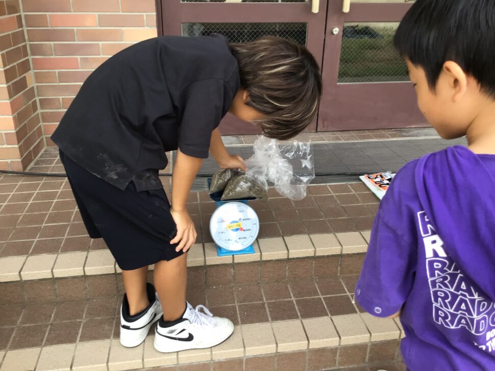 算数の「重さの表し方」の学習で、3回の測量でぴったり1kg(1000g)を作ろうというミッションに挑戦でした。