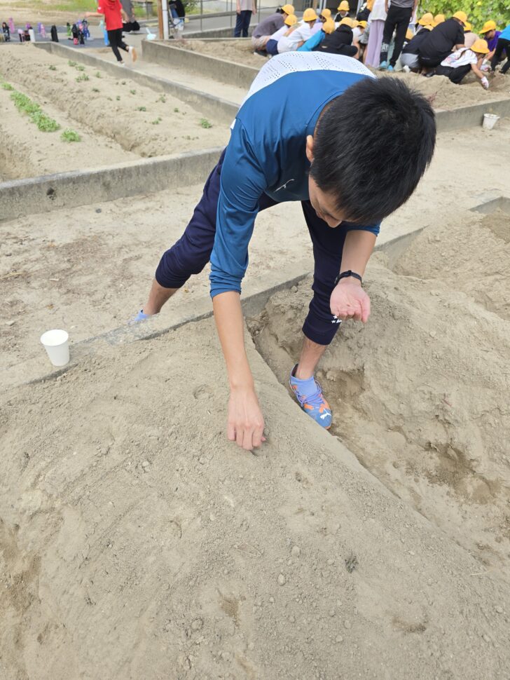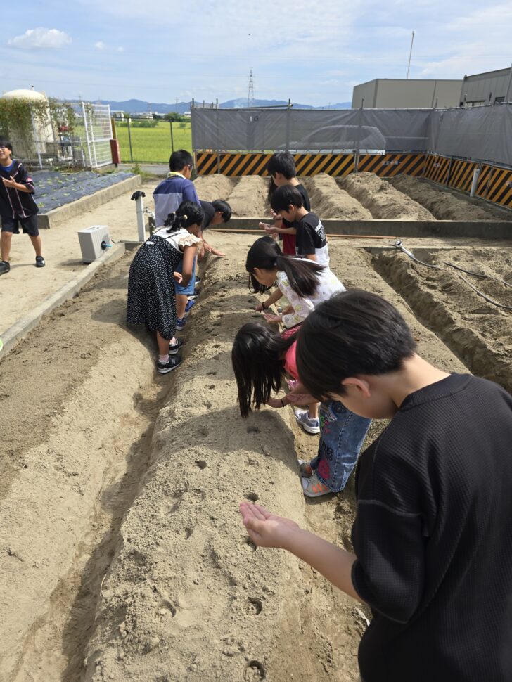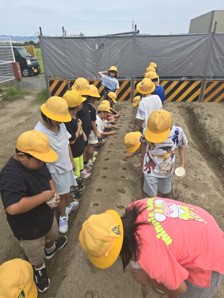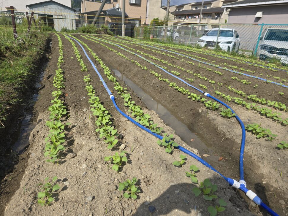 おやじの会の方々に教えていただいたノウハウを使って子どもたちでも大根を育ててみようと、体育館横の学級園を2つ使い大根の種を植えました。