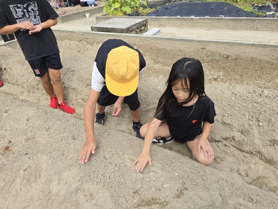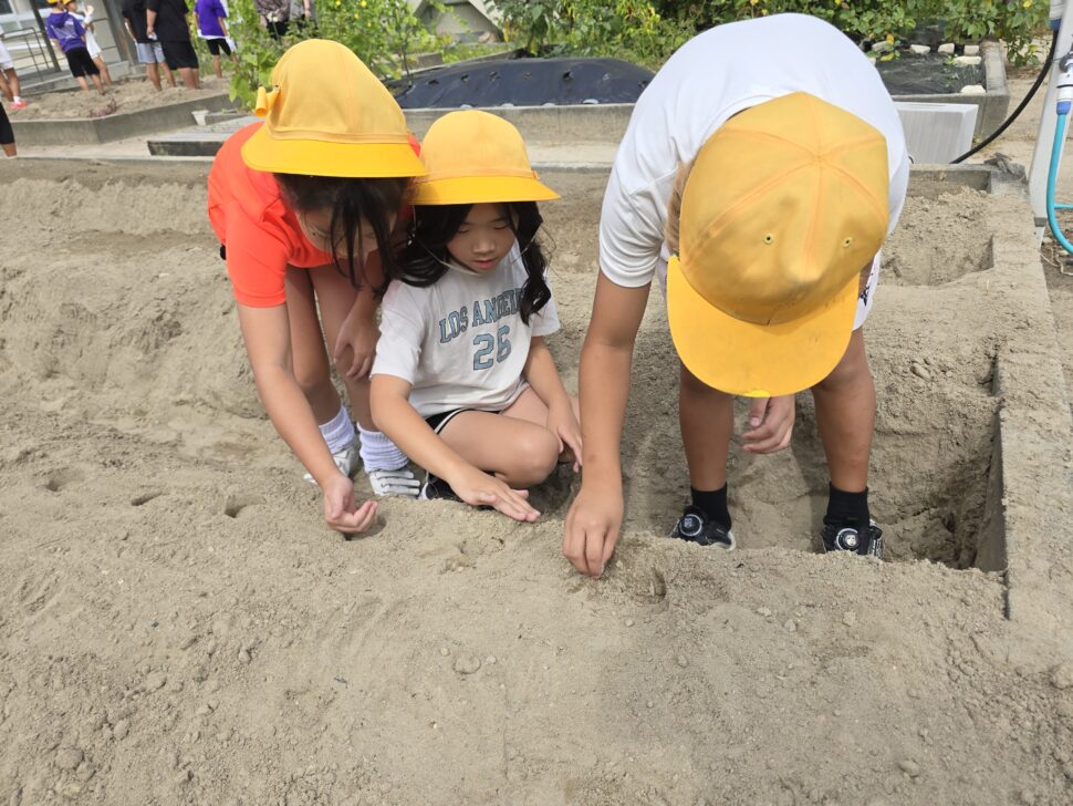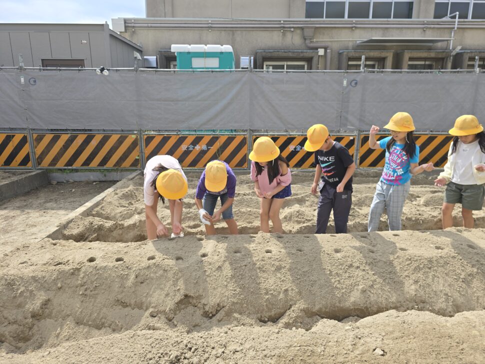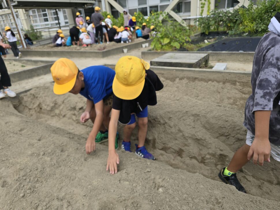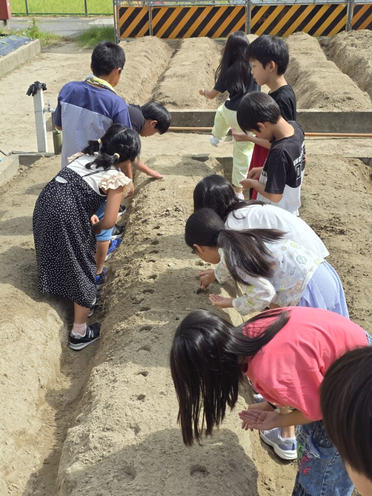 おやじの会の方々に教えていただいたノウハウを使って子どもたちでも大根を育ててみようと、体育館横の学級園を2つ使い大根の種を植えました。