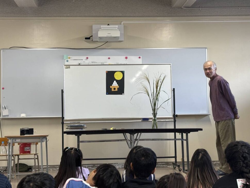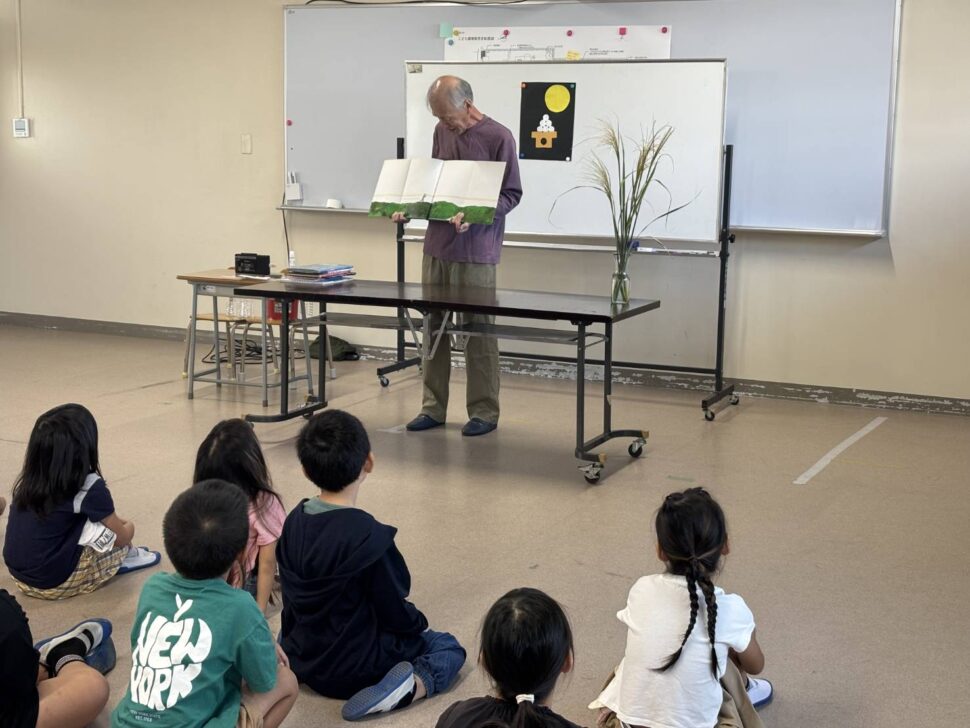 毎月一回、1年生は読み聞かせをしてもらっています。先日は中秋の名月に合わせて、お月見のお話を聞きました。