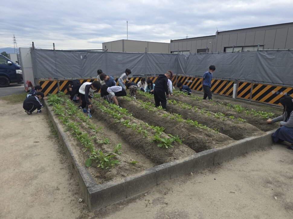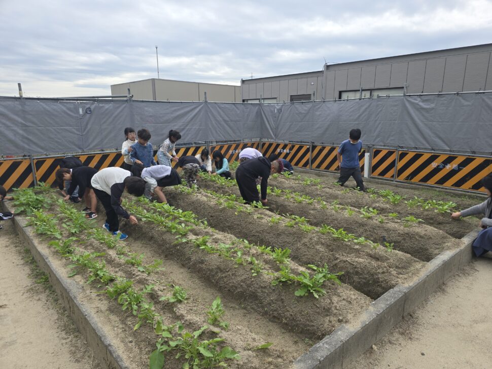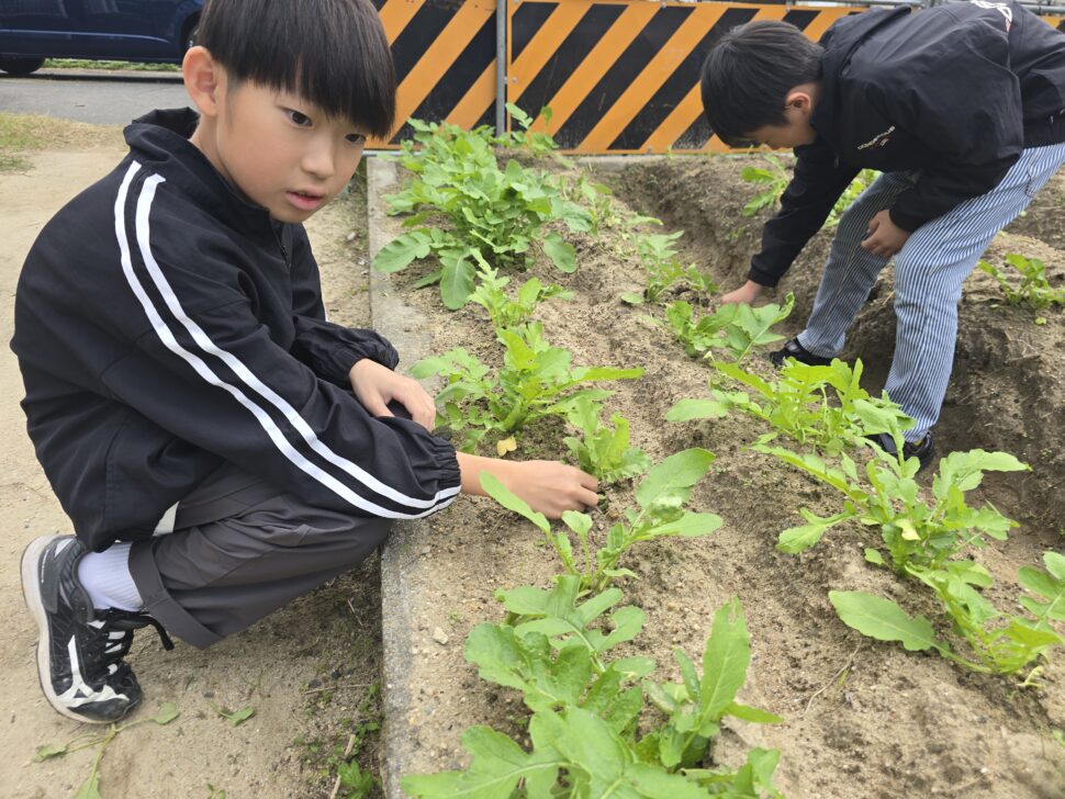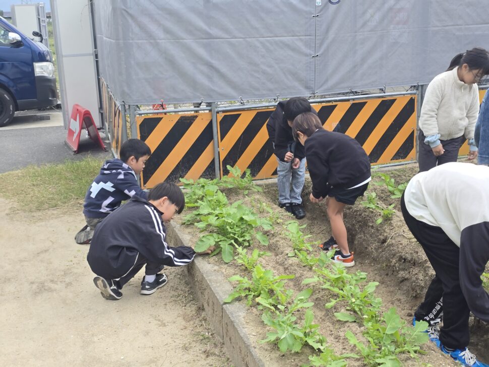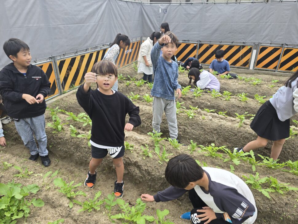 今日は3年生が周りに生えている小さな草を抜いてくれました。雑草抜きが終わり、元気がない大根は少し間引きもしました。
