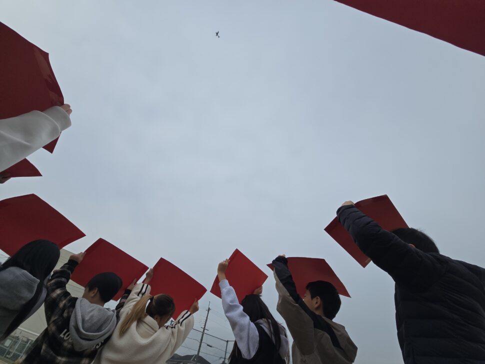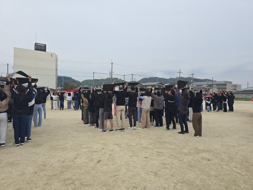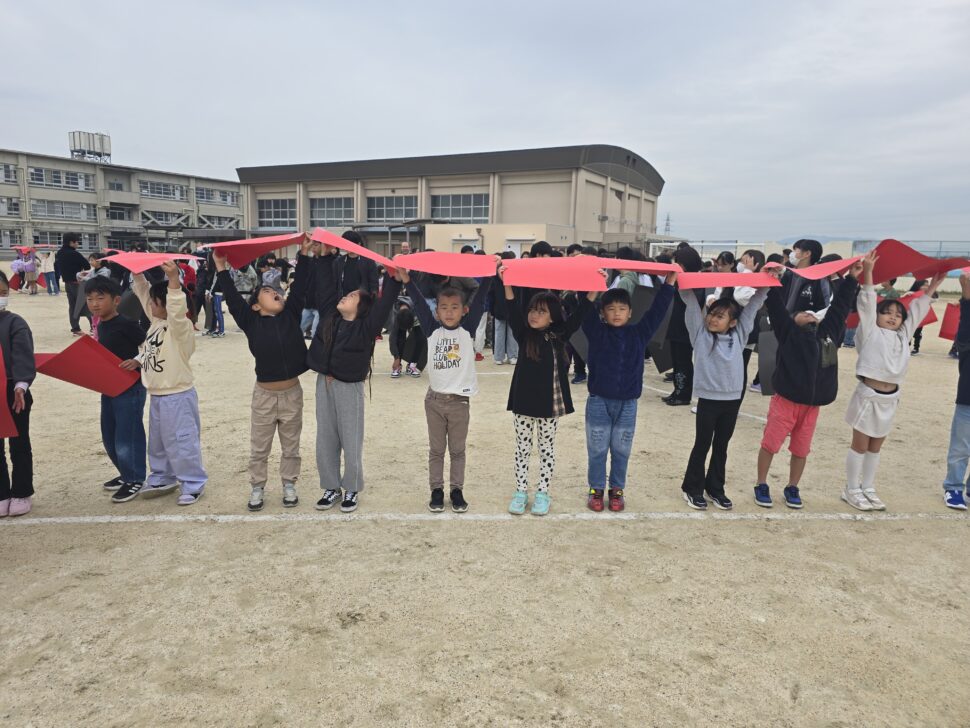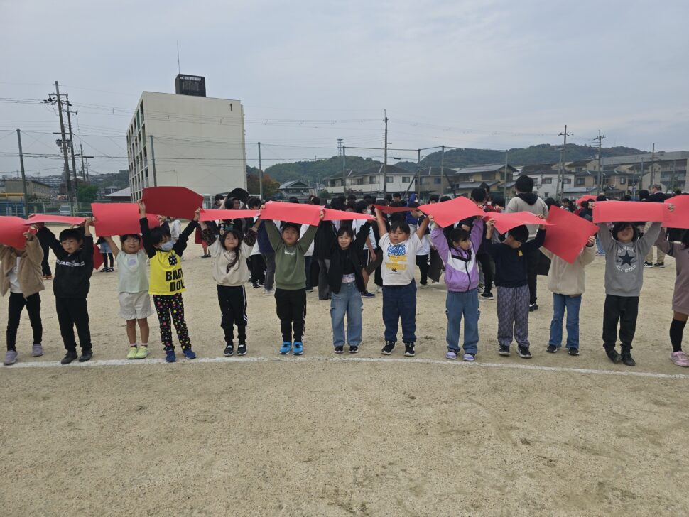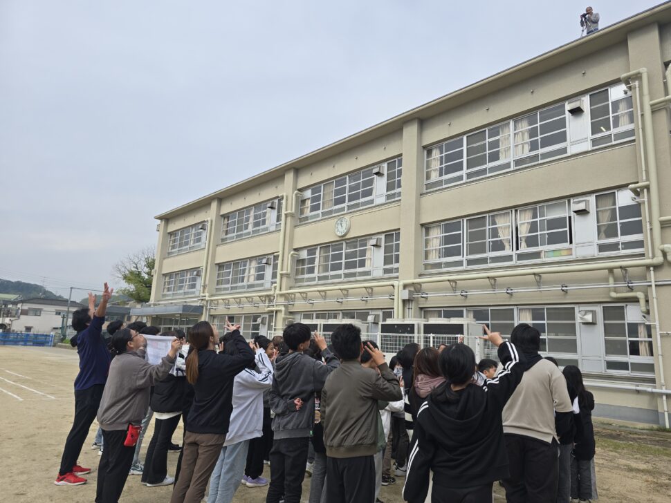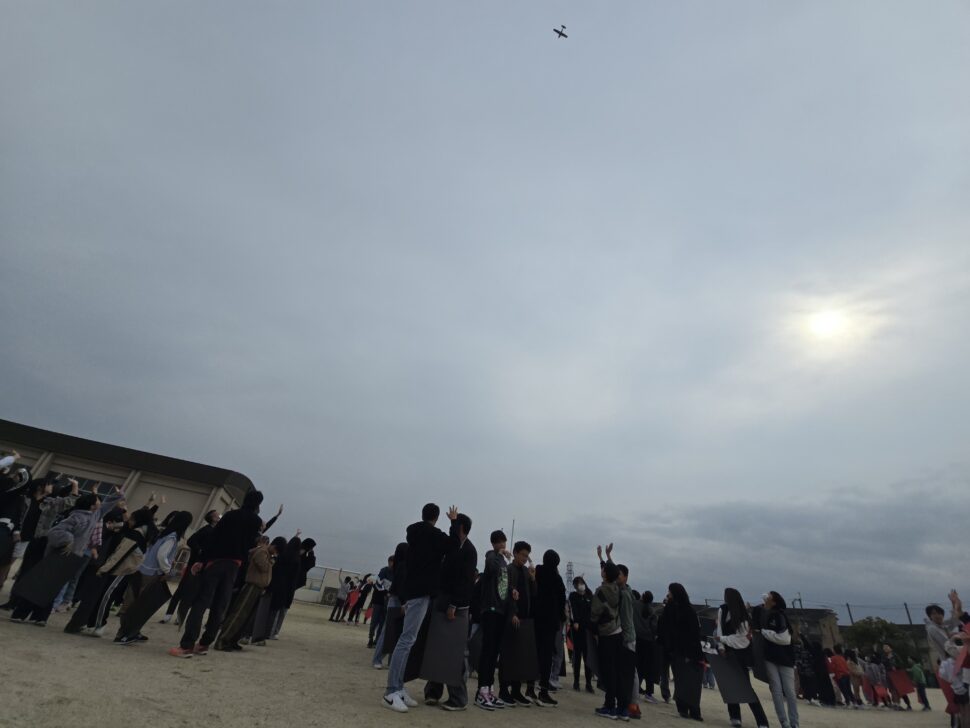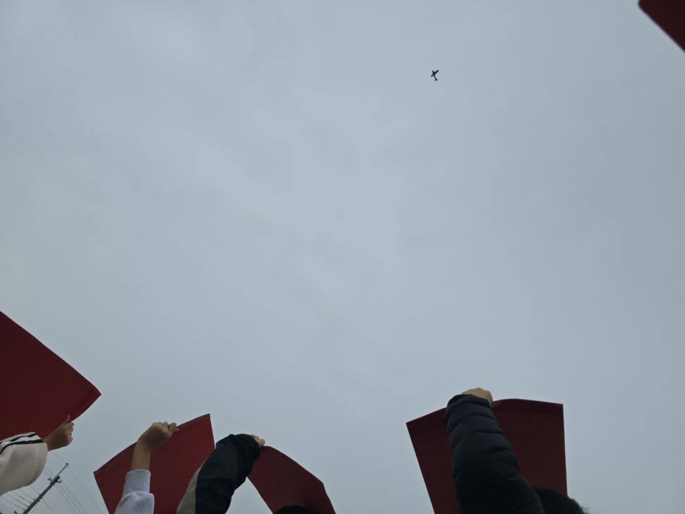 赤と黒の画用紙を空に向けて撮影タイム。何周か中央小上空をセスナが周回し撮影終了。今までで最速の撮影だったそうです。日々子どもたちが素早く動くことへ意識ができている証拠です。