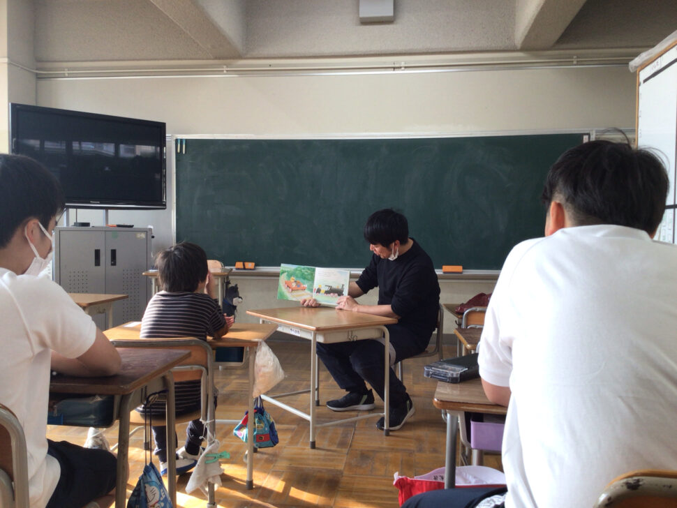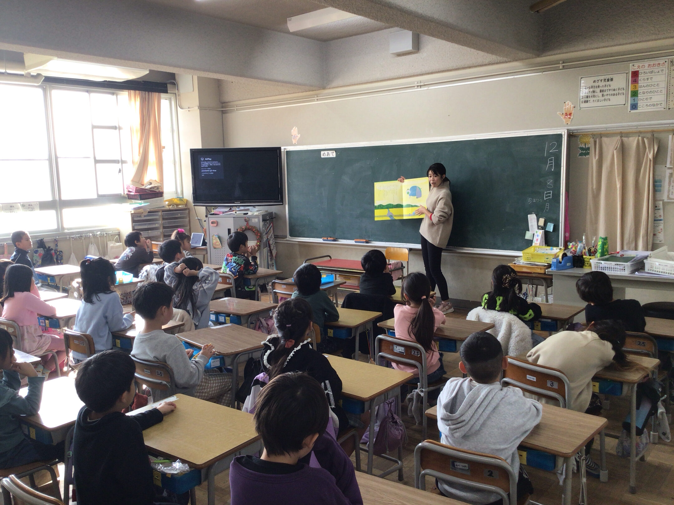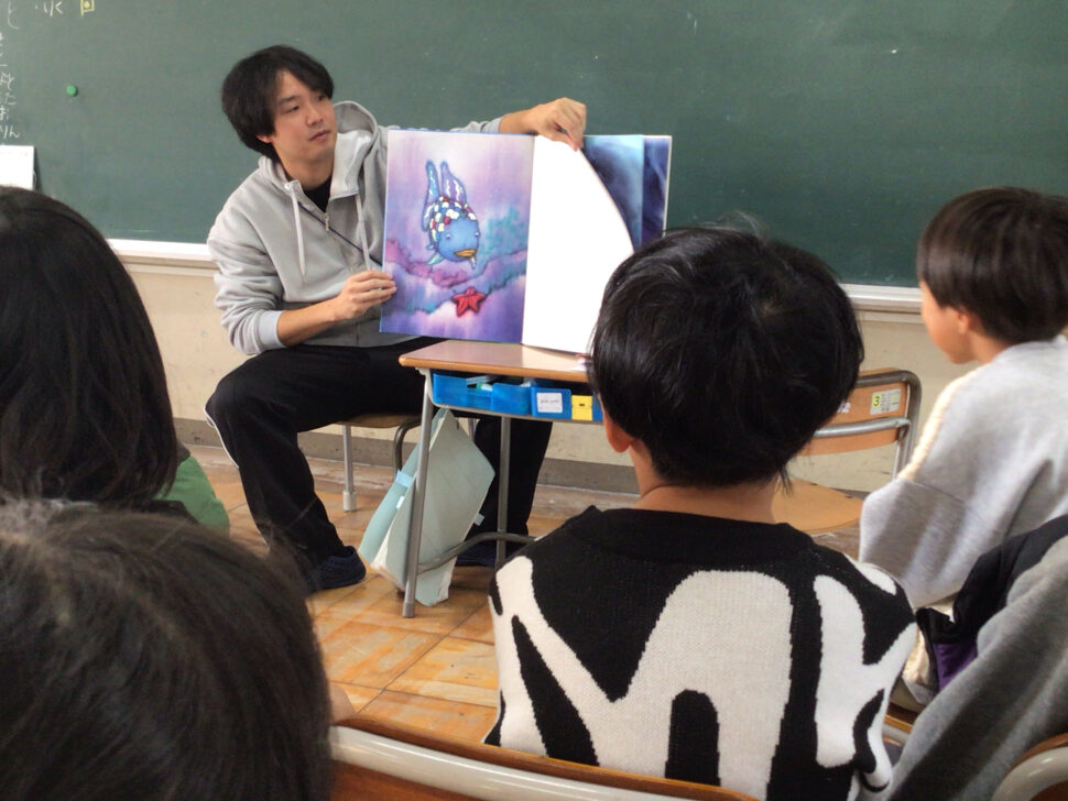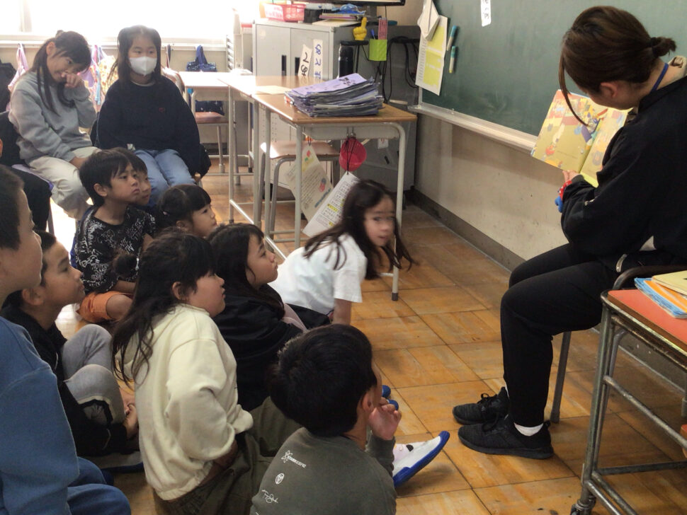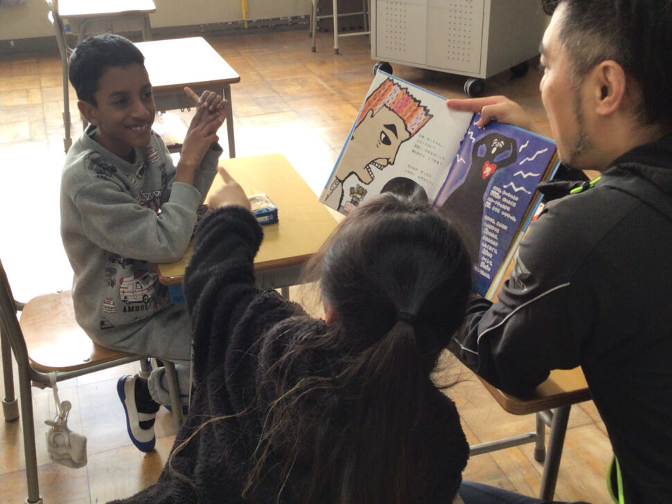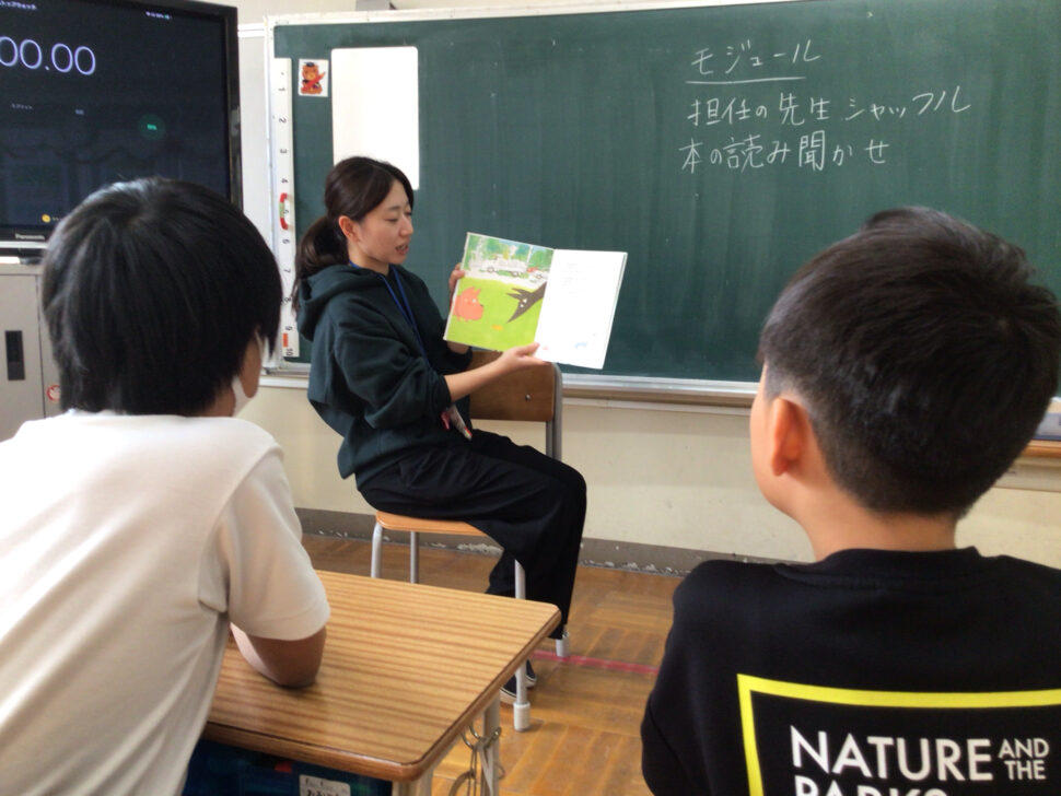 国語モジュールの時間を使って担任の先生による読み聞かせを行いました。しかし、いつと違うのはとなりのクラスの先生に読み聞かせしてもらいました。