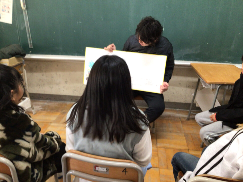 いつもとは違う読み聞かせ。友だちと顔を見合わせたり、ニコニコ笑顔で聞いてる子たちが印象的です。