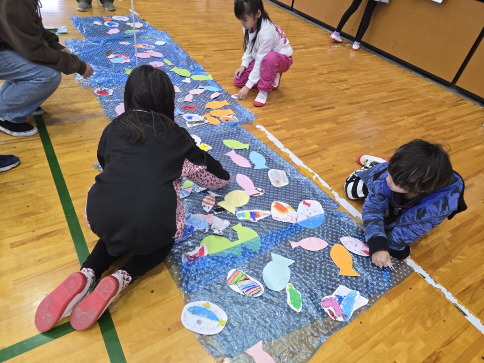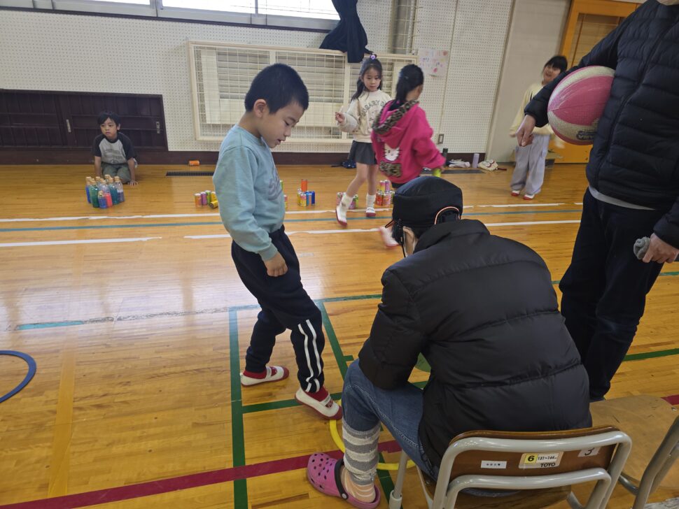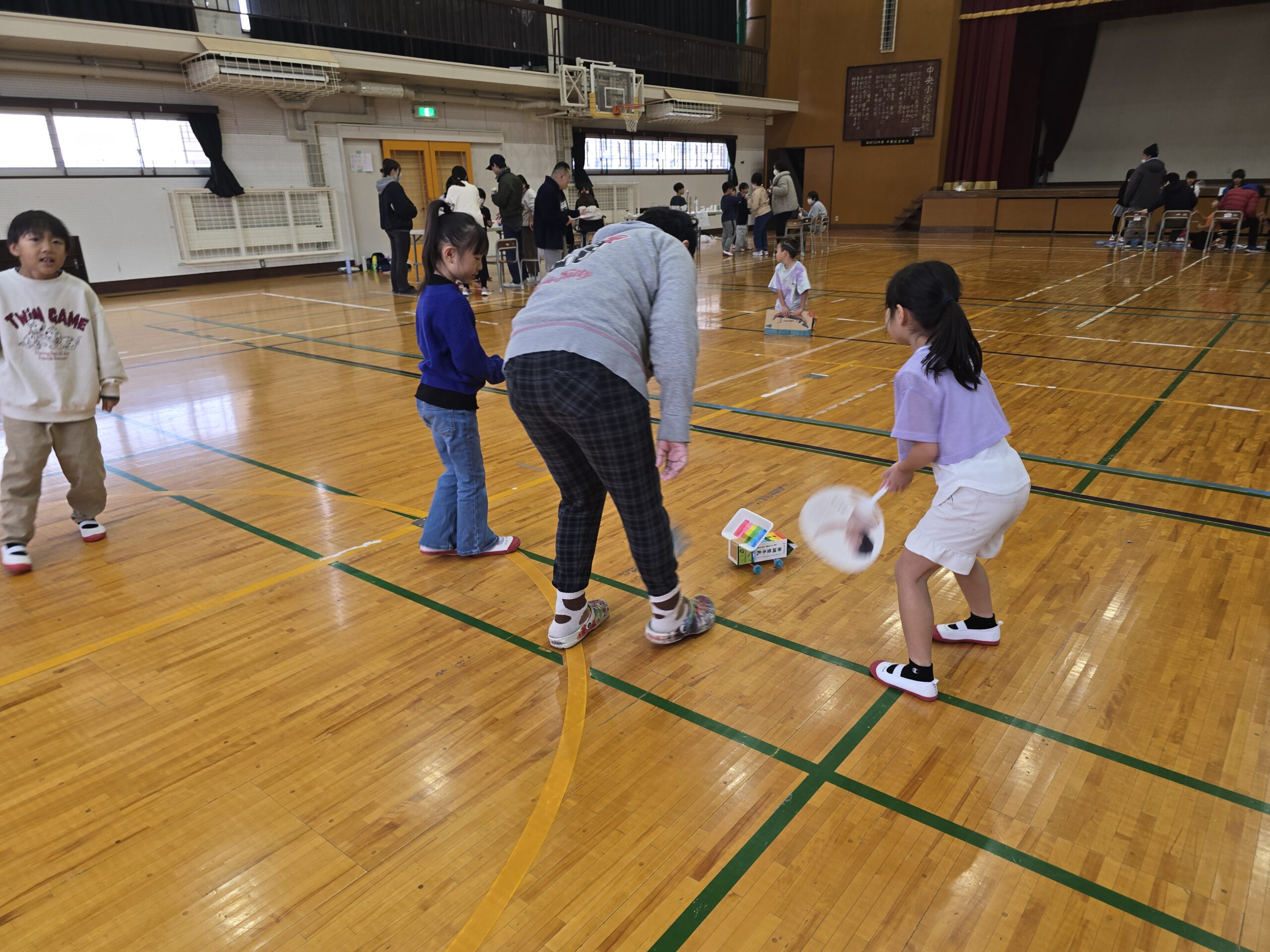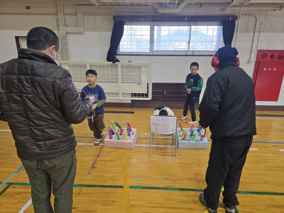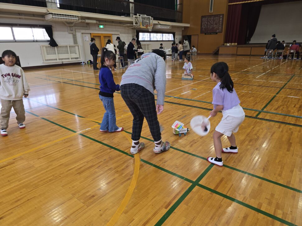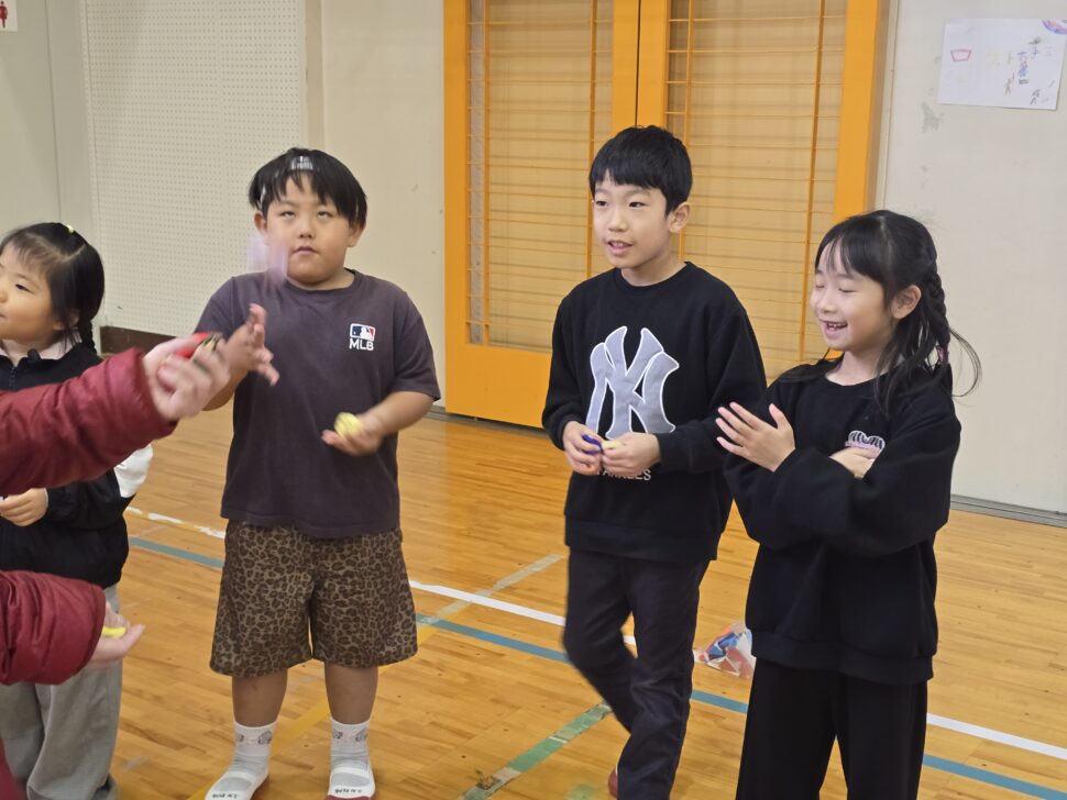 2年生がきろろん八幡さんと交流をしました。前回はきろろん八幡さんにいかせていただいたので、今回は中央小の体育館にお招きし、2年生が生活科で作ったおもちゃを使って一緒に遊びました。