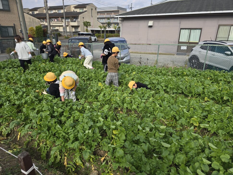 販売まで約1ヶ月となり、4年生がより大根が大きくなるようにと草抜きをしました。