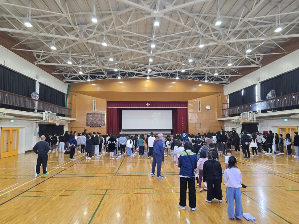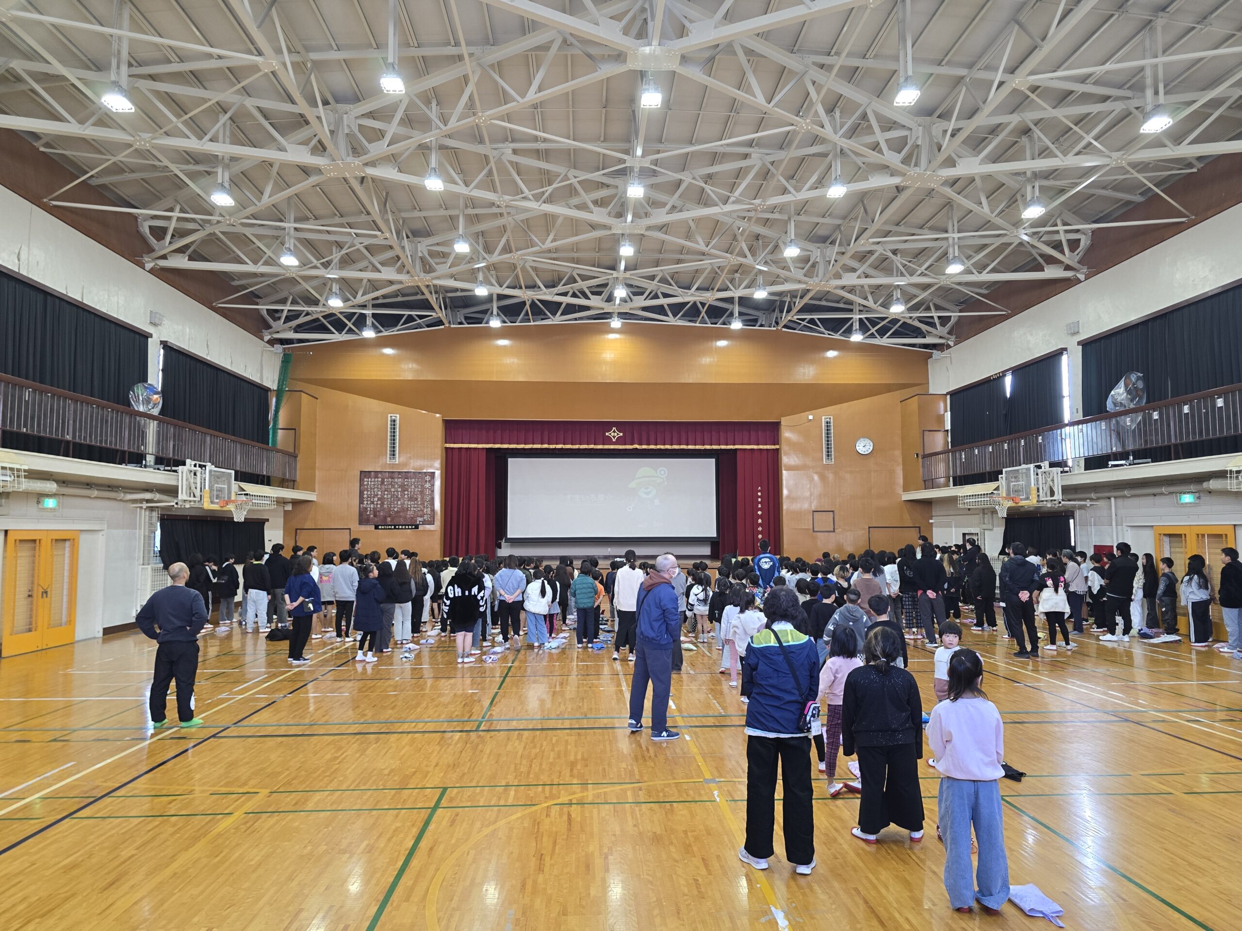 全校の歌「世界に一つだけの花」を歌いました。朝の読み聞かせで先生たちの朗読を聞いていたからか、子どもたちの歌声にいつもより温かさを感じました。