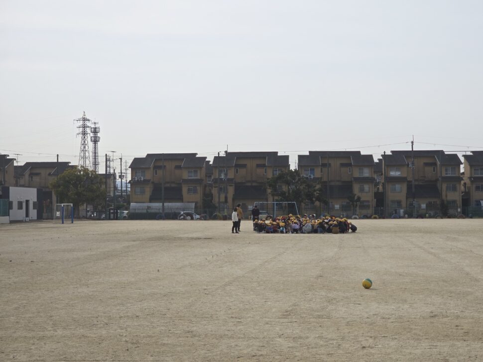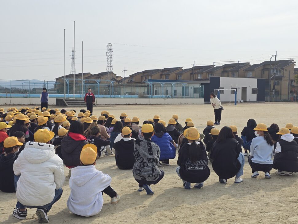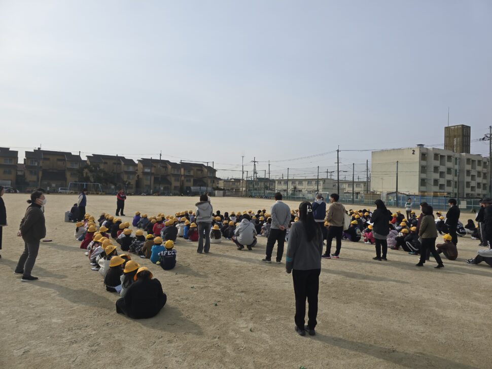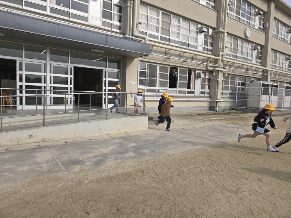 今回の避難訓練は事前にいつするかを伝えずに休み時間に急に始まりました。にもかかわらず子どもたちは冷静に行動することができました。