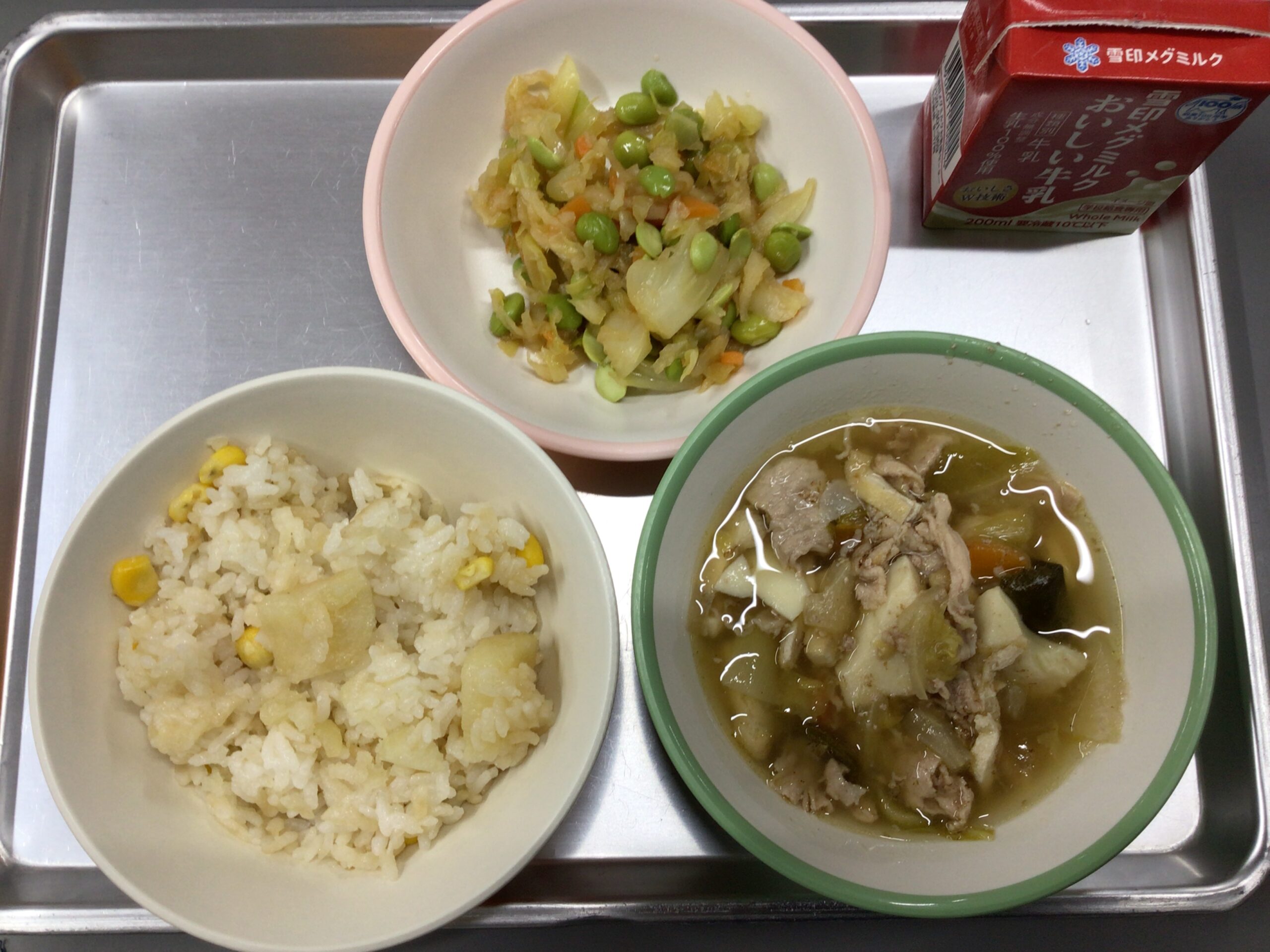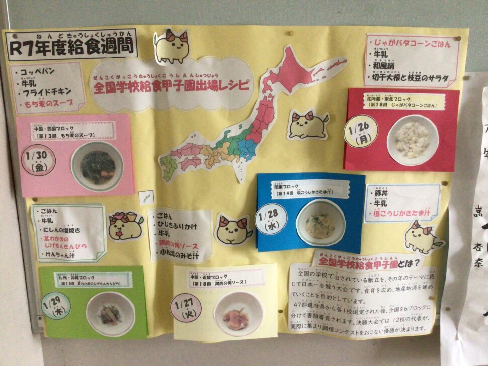 投稿が1日遅れました🙇中央小では26日から30日までの1週間が学校給食週間です!毎日食べている給食や給食を作ってくださっている調理師さん、給食に関わる全ての方に感謝する週間としています。今年のテーマは全国学校給食甲子園に登場したメニューです。全国学校給食甲子園とは全国の学校で出されている献立を、その年のテーマに応じて考え調理し、日本一を競う戦いです。初日だった昨日は北海道・東北ブロックから「じゃがバタコーンごはん」が登場しました!じゃがいも、バター、コーンと、北海道の食材をふんだんに使ったご飯でした!お味はいかがでしたか?☺️メニューはじゃがバタコーンごはん、牛乳、和風鍋、切り干し大根と枝豆のサラダでした!